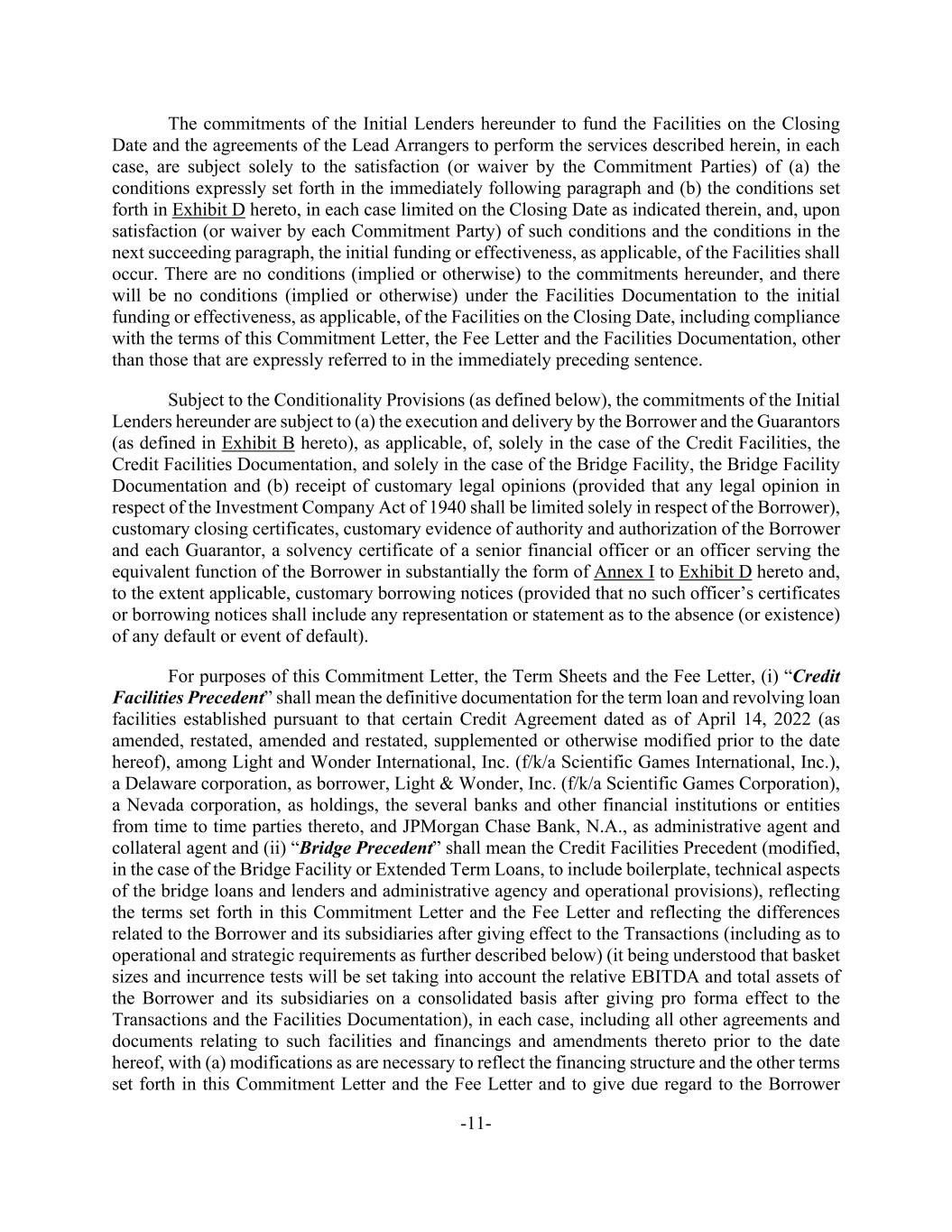 -11- The commitments of the Initial Lenders hereunder to fund the Facilities on the Closing Date and the agreements of the Lead Arrangers to perform the services described herein, in each case, are subject solely to the satisfaction (or waiver by the Commitment Parties) of (a) the conditions expressly set forth in the immediately following paragraph and (b) the conditions set forth in Exhibit D hereto, in each case limited on the Closing Date as indicated therein, and, upon satisfaction (or waiver by each Commitment Party) of such conditions and the conditions in the next succeeding paragraph, the initial funding or effectiveness, as applicable, of the Facilities shall occur. There are no conditions (implied or otherwise) to the commitments hereunder, and there will be no conditions (implied or otherwise) under the Facilities Documentation to the initial funding or effectiveness, as applicable, of the Facilities on the Closing Date, including compliance with the terms of this Commitment Letter, the Fee Letter and the Facilities Documentation, other than those that are expressly referred to in the immediately preceding sentence. Subject to the Conditionality Provisions (as defined below), the commitments of the Initial Lenders hereunder are subject to (a) the execution and delivery by the Borrower and the Guarantors (as defined in Exhibit B hereto), as applicable, of, solely in the case of the Credit Facilities, the Credit Facilities Documentation, and solely in the case of the Bridge Facility, the Bridge Facility Documentation and (b) receipt of customary legal opinions (provided that any legal opinion in respect of the Investment Company Act of 1940 shall be limited solely in respect of the Borrower), customary closing certificates, customary evidence of authority and authorization of the Borrower and each Guarantor, a solvency certificate of a senior financial officer or an officer serving the equivalent function of the Borrower in substantially the form of Annex I to Exhibit D hereto and, to the extent applicable, customary borrowing notices (provided that no such officer’s certificates or borrowing notices shall include any representation or statement as to the absence (or existence) of any default or event of default). For purposes of this Commitment Letter, the Term Sheets and the Fee Letter, (i) “Credit Facilities Precedent” shall mean the definitive documentation for the term loan and revolving loan facilities established pursuant to that certain Credit Agreement dated as of April 14, 2022 (as amended, restated, amended and restated, supplemented or otherwise modified prior to the date hereof), among Light and Wonder International, Inc. (f/k/a Scientific Games International, Inc.), a Delaware corporation, as borrower, Light & Wonder, Inc. (f/k/a Scientific Games Corporation), a Nevada corporation, as holdings, the several banks and other financial institutions or entities from time to time parties thereto, and JPMorgan Chase Bank, N.A., as administrative agent and collateral agent and (ii) “Bridge Precedent” shall mean the Credit Facilities Precedent (modified, in the case of the Bridge Facility or Extended Term Loans, to include boilerplate, technical aspects of the bridge loans and lenders and administrative agency and operational provisions), reflecting the terms set forth in this Commitment Letter and the Fee Letter and reflecting the differences related to the Borrower and its subsidiaries after giving effect to the Transactions (including as to operational and strategic requirements as further described below) (it being understood that basket sizes and incurrence tests will be set taking into account the relative EBITDA and total assets of the Borrower and its subsidiaries on a consolidated basis after giving pro forma effect to the Transactions and the Facilities Documentation), in each case, including all other agreements and documents relating to such facilities and financings and amendments thereto prior to the date hereof, with (a) modifications as are necessary to reflect the financing structure and the other terms set forth in this Commitment Letter and the Fee Letter and to give due regard to the Borrower
