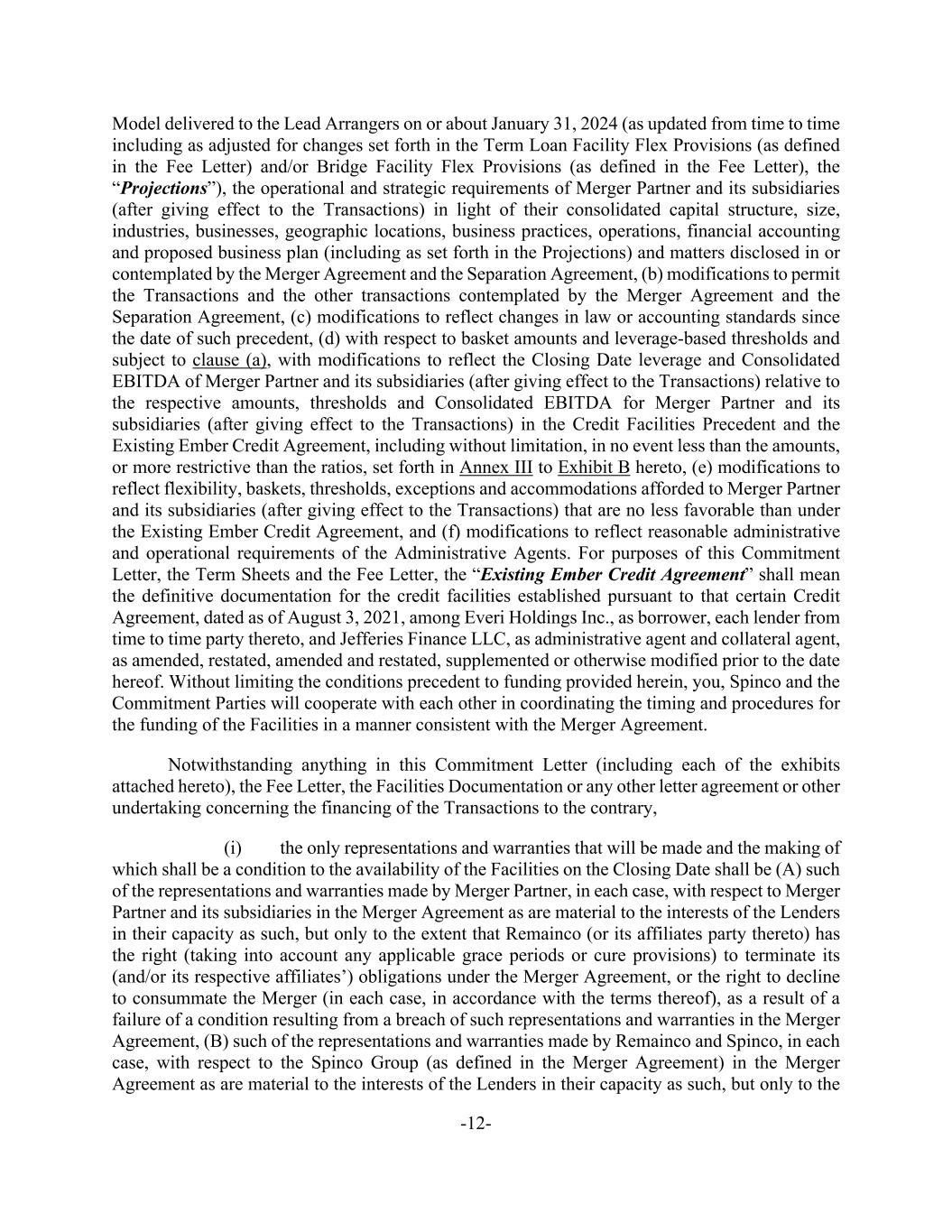 -12- Model delivered to the Lead Arrangers on or about January 31, 2024 (as updated from time to time including as adjusted for changes set forth in the Term Loan Facility Flex Provisions (as defined in the Fee Letter) and/or Bridge Facility Flex Provisions (as defined in the Fee Letter), the “Projections”), the operational and strategic requirements of Merger Partner and its subsidiaries (after giving effect to the Transactions) in light of their consolidated capital structure, size, industries, businesses, geographic locations, business practices, operations, financial accounting and proposed business plan (including as set forth in the Projections) and matters disclosed in or contemplated by the Merger Agreement and the Separation Agreement, (b) modifications to permit the Transactions and the other transactions contemplated by the Merger Agreement and the Separation Agreement, (c) modifications to reflect changes in law or accounting standards since the date of such precedent, (d) with respect to basket amounts and leverage-based thresholds and subject to clause (a), with modifications to reflect the Closing Date leverage and Consolidated EBITDA of Merger Partner and its subsidiaries (after giving effect to the Transactions) relative to the respective amounts, thresholds and Consolidated EBITDA for Merger Partner and its subsidiaries (after giving effect to the Transactions) in the Credit Facilities Precedent and the Existing Ember Credit Agreement, including without limitation, in no event less than the amounts, or more restrictive than the ratios, set forth in Annex III to Exhibit B hereto, (e) modifications to reflect flexibility, baskets, thresholds, exceptions and accommodations afforded to Merger Partner and its subsidiaries (after giving effect to the Transactions) that are no less favorable than under the Existing Ember Credit Agreement, and (f) modifications to reflect reasonable administrative and operational requirements of the Administrative Agents. For purposes of this Commitment Letter, the Term Sheets and the Fee Letter, the “Existing Ember Credit Agreement” shall mean the definitive documentation for the credit facilities established pursuant to that certain Credit Agreement, dated as of August 3, 2021, among Everi Holdings Inc., as borrower, each lender from time to time party thereto, and Jefferies Finance LLC, as administrative agent and collateral agent, as amended, restated, amended and restated, supplemented or otherwise modified prior to the date hereof. Without limiting the conditions precedent to funding provided herein, you, Spinco and the Commitment Parties will cooperate with each other in coordinating the timing and procedures for the funding of the Facilities in a manner consistent with the Merger Agreement. Notwithstanding anything in this Commitment Letter (including each of the exhibits attached hereto), the Fee Letter, the Facilities Documentation or any other letter agreement or other undertaking concerning the financing of the Transactions to the contrary, (i) the only representations and warranties that will be made and the making of which shall be a condition to the availability of the Facilities on the Closing Date shall be (A) such of the representations and warranties made by Merger Partner, in each case, with respect to Merger Partner and its subsidiaries in the Merger Agreement as are material to the interests of the Lenders in their capacity as such, but only to the extent that Remainco (or its affiliates party thereto) has the right (taking into account any applicable grace periods or cure provisions) to terminate its (and/or its respective affiliates’) obligations under the Merger Agreement, or the right to decline to consummate the Merger (in each case, in accordance with the terms thereof), as a result of a failure of a condition resulting from a breach of such representations and warranties in the Merger Agreement, (B) such of the representations and warranties made by Remainco and Spinco, in each case, with respect to the Spinco Group (as defined in the Merger Agreement) in the Merger Agreement as are material to the interests of the Lenders in their capacity as such, but only to the