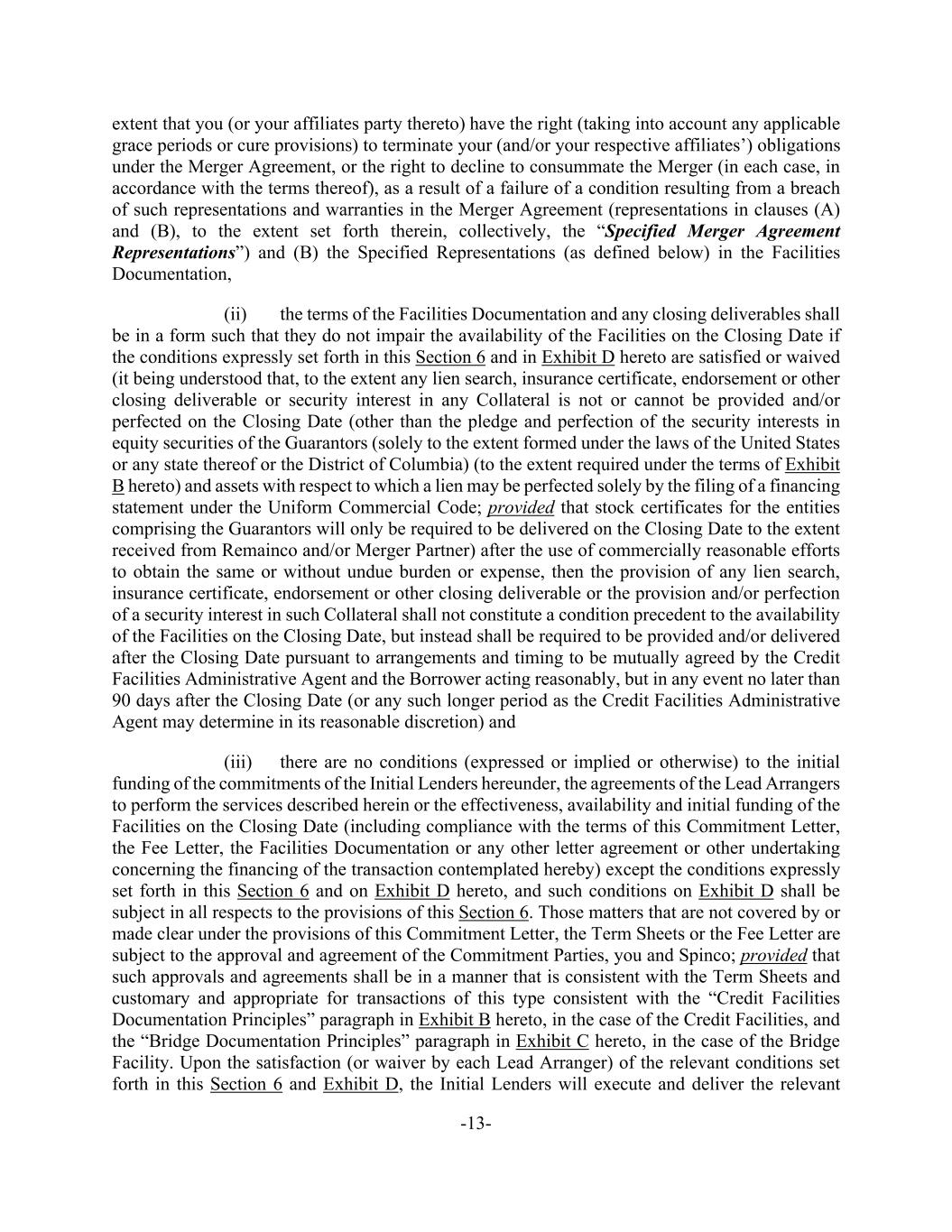 -13- extent that you (or your affiliates party thereto) have the right (taking into account any applicable grace periods or cure provisions) to terminate your (and/or your respective affiliates’) obligations under the Merger Agreement, or the right to decline to consummate the Merger (in each case, in accordance with the terms thereof), as a result of a failure of a condition resulting from a breach of such representations and warranties in the Merger Agreement (representations in clauses (A) and (B), to the extent set forth therein, collectively, the “Specified Merger Agreement Representations”) and (B) the Specified Representations (as defined below) in the Facilities Documentation, (ii) the terms of the Facilities Documentation and any closing deliverables shall be in a form such that they do not impair the availability of the Facilities on the Closing Date if the conditions expressly set forth in this Section 6 and in Exhibit D hereto are satisfied or waived (it being understood that, to the extent any lien search, insurance certificate, endorsement or other closing deliverable or security interest in any Collateral is not or cannot be provided and/or perfected on the Closing Date (other than the pledge and perfection of the security interests in equity securities of the Guarantors (solely to the extent formed under the laws of the United States or any state thereof or the District of Columbia) (to the extent required under the terms of Exhibit B hereto) and assets with respect to which a lien may be perfected solely by the filing of a financing statement under the Uniform Commercial Code; provided that stock certificates for the entities comprising the Guarantors will only be required to be delivered on the Closing Date to the extent received from Remainco and/or Merger Partner) after the use of commercially reasonable efforts to obtain the same or without undue burden or expense, then the provision of any lien search, insurance certificate, endorsement or other closing deliverable or the provision and/or perfection of a security interest in such Collateral shall not constitute a condition precedent to the availability of the Facilities on the Closing Date, but instead shall be required to be provided and/or delivered after the Closing Date pursuant to arrangements and timing to be mutually agreed by the Credit Facilities Administrative Agent and the Borrower acting reasonably, but in any event no later than 90 days after the Closing Date (or any such longer period as the Credit Facilities Administrative Agent may determine in its reasonable discretion) and (iii) there are no conditions (expressed or implied or otherwise) to the initial funding of the commitments of the Initial Lenders hereunder, the agreements of the Lead Arrangers to perform the services described herein or the effectiveness, availability and initial funding of the Facilities on the Closing Date (including compliance with the terms of this Commitment Letter, the Fee Letter, the Facilities Documentation or any other letter agreement or other undertaking concerning the financing of the transaction contemplated hereby) except the conditions expressly set forth in this Section 6 and on Exhibit D hereto, and such conditions on Exhibit D shall be subject in all respects to the provisions of this Section 6. Those matters that are not covered by or made clear under the provisions of this Commitment Letter, the Term Sheets or the Fee Letter are subject to the approval and agreement of the Commitment Parties, you and Spinco; provided that such approvals and agreements shall be in a manner that is consistent with the Term Sheets and customary and appropriate for transactions of this type consistent with the “Credit Facilities Documentation Principles” paragraph in Exhibit B hereto, in the case of the Credit Facilities, and the “Bridge Documentation Principles” paragraph in Exhibit C hereto, in the case of the Bridge Facility. Upon the satisfaction (or waiver by each Lead Arranger) of the relevant conditions set forth in this Section 6 and Exhibit D, the Initial Lenders will execute and deliver the relevant