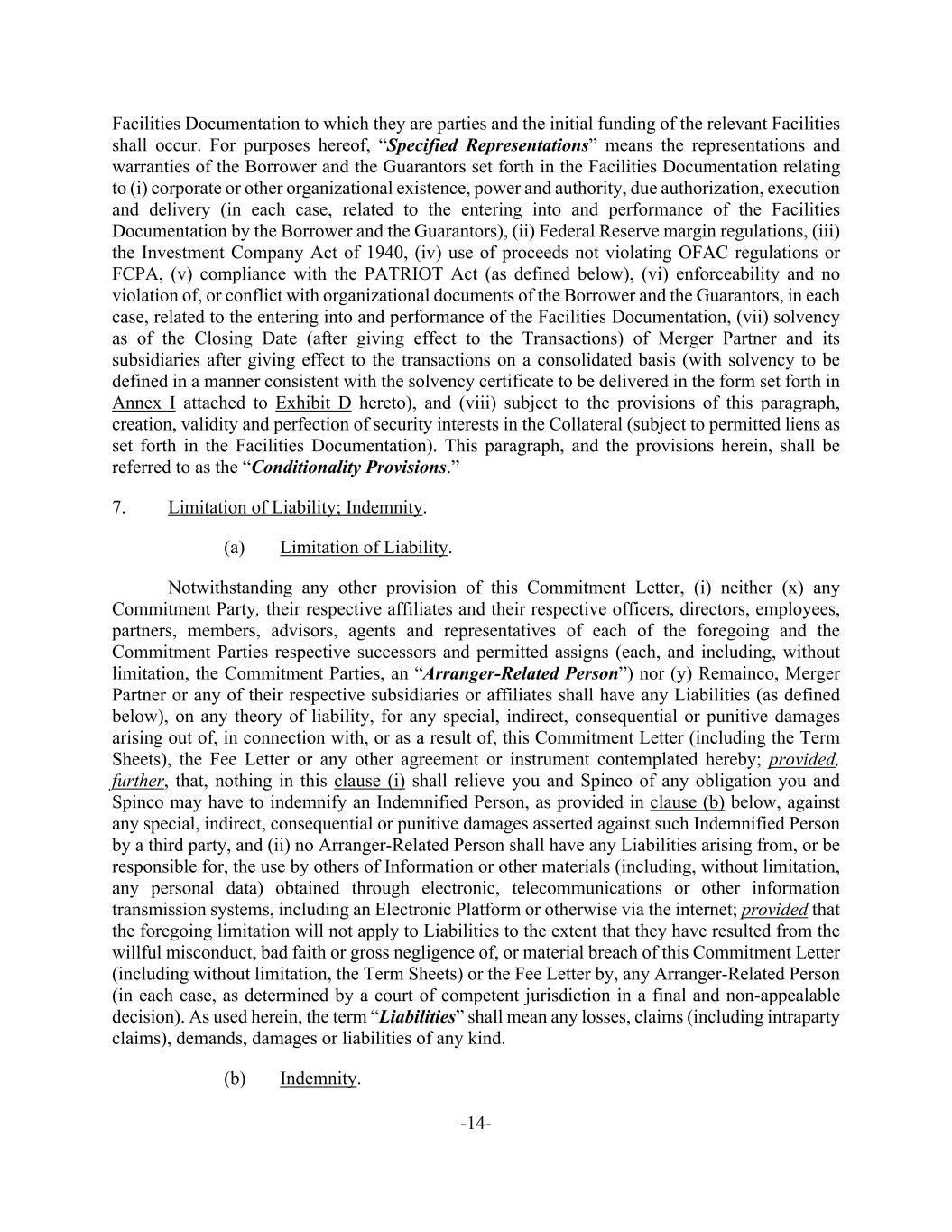 -14- Facilities Documentation to which they are parties and the initial funding of the relevant Facilities shall occur. For purposes hereof, “Specified Representations” means the representations and warranties of the Borrower and the Guarantors set forth in the Facilities Documentation relating to (i) corporate or other organizational existence, power and authority, due authorization, execution and delivery (in each case, related to the entering into and performance of the Facilities Documentation by the Borrower and the Guarantors), (ii) Federal Reserve margin regulations, (iii) the Investment Company Act of 1940, (iv) use of proceeds not violating OFAC regulations or FCPA, (v) compliance with the PATRIOT Act (as defined below), (vi) enforceability and no violation of, or conflict with organizational documents of the Borrower and the Guarantors, in each case, related to the entering into and performance of the Facilities Documentation, (vii) solvency as of the Closing Date (after giving effect to the Transactions) of Merger Partner and its subsidiaries after giving effect to the transactions on a consolidated basis (with solvency to be defined in a manner consistent with the solvency certificate to be delivered in the form set forth in Annex I attached to Exhibit D hereto), and (viii) subject to the provisions of this paragraph, creation, validity and perfection of security interests in the Collateral (subject to permitted liens as set forth in the Facilities Documentation). This paragraph, and the provisions herein, shall be referred to as the “Conditionality Provisions.” 7. Limitation of Liability; Indemnity. (a) Limitation of Liability. Notwithstanding any other provision of this Commitment Letter, (i) neither (x) any Commitment Party, their respective affiliates and their respective officers, directors, employees, partners, members, advisors, agents and representatives of each of the foregoing and the Commitment Parties respective successors and permitted assigns (each, and including, without limitation, the Commitment Parties, an “Arranger-Related Person”) nor (y) Remainco, Merger Partner or any of their respective subsidiaries or affiliates shall have any Liabilities (as defined below), on any theory of liability, for any special, indirect, consequential or punitive damages arising out of, in connection with, or as a result of, this Commitment Letter (including the Term Sheets), the Fee Letter or any other agreement or instrument contemplated hereby; provided, further, that, nothing in this clause (i) shall relieve you and Spinco of any obligation you and Spinco may have to indemnify an Indemnified Person, as provided in clause (b) below, against any special, indirect, consequential or punitive damages asserted against such Indemnified Person by a third party, and (ii) no Arranger-Related Person shall have any Liabilities arising from, or be responsible for, the use by others of Information or other materials (including, without limitation, any personal data) obtained through electronic, telecommunications or other information transmission systems, including an Electronic Platform or otherwise via the internet; provided that the foregoing limitation will not apply to Liabilities to the extent that they have resulted from the willful misconduct, bad faith or gross negligence of, or material breach of this Commitment Letter (including without limitation, the Term Sheets) or the Fee Letter by, any Arranger-Related Person (in each case, as determined by a court of competent jurisdiction in a final and non-appealable decision). As used herein, the term “Liabilities” shall mean any losses, claims (including intraparty claims), demands, damages or liabilities of any kind. (b) Indemnity.