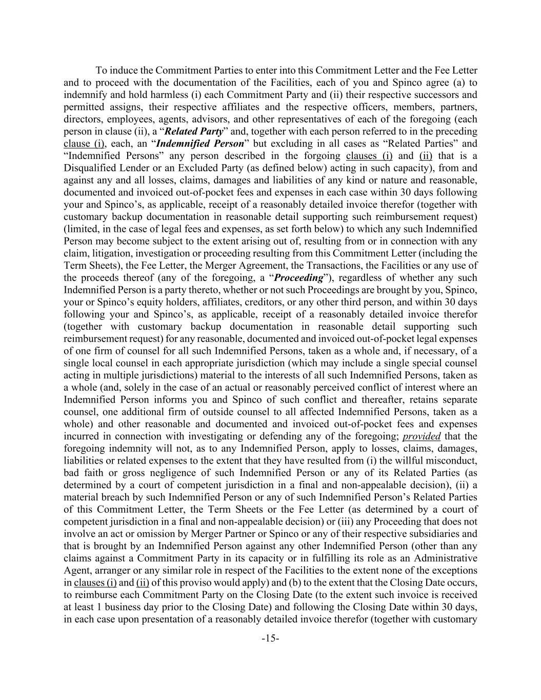 -15- To induce the Commitment Parties to enter into this Commitment Letter and the Fee Letter and to proceed with the documentation of the Facilities, each of you and Spinco agree (a) to indemnify and hold harmless (i) each Commitment Party and (ii) their respective successors and permitted assigns, their respective affiliates and the respective officers, members, partners, directors, employees, agents, advisors, and other representatives of each of the foregoing (each person in clause (ii), a “Related Party” and, together with each person referred to in the preceding clause (i), each, an “Indemnified Person” but excluding in all cases as “Related Parties” and “Indemnified Persons” any person described in the forgoing clauses (i) and (ii) that is a Disqualified Lender or an Excluded Party (as defined below) acting in such capacity), from and against any and all losses, claims, damages and liabilities of any kind or nature and reasonable, documented and invoiced out-of-pocket fees and expenses in each case within 30 days following your and Spinco’s, as applicable, receipt of a reasonably detailed invoice therefor (together with customary backup documentation in reasonable detail supporting such reimbursement request) (limited, in the case of legal fees and expenses, as set forth below) to which any such Indemnified Person may become subject to the extent arising out of, resulting from or in connection with any claim, litigation, investigation or proceeding resulting from this Commitment Letter (including the Term Sheets), the Fee Letter, the Merger Agreement, the Transactions, the Facilities or any use of the proceeds thereof (any of the foregoing, a “Proceeding”), regardless of whether any such Indemnified Person is a party thereto, whether or not such Proceedings are brought by you, Spinco, your or Spinco’s equity holders, affiliates, creditors, or any other third person, and within 30 days following your and Spinco’s, as applicable, receipt of a reasonably detailed invoice therefor (together with customary backup documentation in reasonable detail supporting such reimbursement request) for any reasonable, documented and invoiced out-of-pocket legal expenses of one firm of counsel for all such Indemnified Persons, taken as a whole and, if necessary, of a single local counsel in each appropriate jurisdiction (which may include a single special counsel acting in multiple jurisdictions) material to the interests of all such Indemnified Persons, taken as a whole (and, solely in the case of an actual or reasonably perceived conflict of interest where an Indemnified Person informs you and Spinco of such conflict and thereafter, retains separate counsel, one additional firm of outside counsel to all affected Indemnified Persons, taken as a whole) and other reasonable and documented and invoiced out-of-pocket fees and expenses incurred in connection with investigating or defending any of the foregoing; provided that the foregoing indemnity will not, as to any Indemnified Person, apply to losses, claims, damages, liabilities or related expenses to the extent that they have resulted from (i) the willful misconduct, bad faith or gross negligence of such Indemnified Person or any of its Related Parties (as determined by a court of competent jurisdiction in a final and non-appealable decision), (ii) a material breach by such Indemnified Person or any of such Indemnified Person’s Related Parties of this Commitment Letter, the Term Sheets or the Fee Letter (as determined by a court of competent jurisdiction in a final and non-appealable decision) or (iii) any Proceeding that does not involve an act or omission by Merger Partner or Spinco or any of their respective subsidiaries and that is brought by an Indemnified Person against any other Indemnified Person (other than any claims against a Commitment Party in its capacity or in fulfilling its role as an Administrative Agent, arranger or any similar role in respect of the Facilities to the extent none of the exceptions in clauses (i) and (ii) of this proviso would apply) and (b) to the extent that the Closing Date occurs, to reimburse each Commitment Party on the Closing Date (to the extent such invoice is received at least 1 business day prior to the Closing Date) and following the Closing Date within 30 days, in each case upon presentation of a reasonably detailed invoice therefor (together with customary