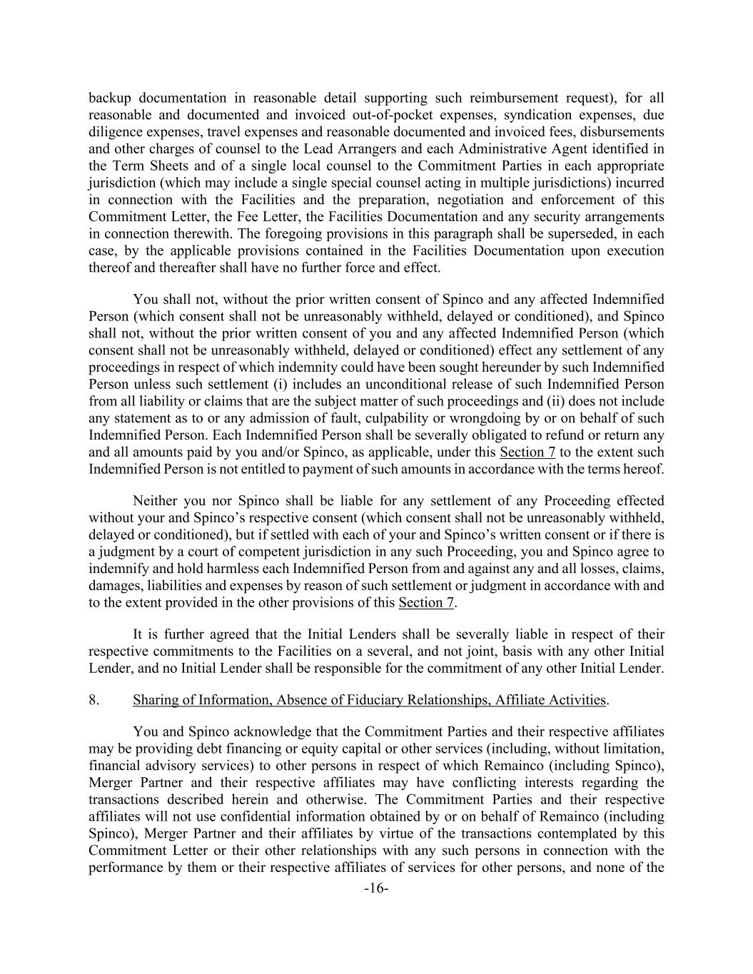 -16- backup documentation in reasonable detail supporting such reimbursement request), for all reasonable and documented and invoiced out-of-pocket expenses, syndication expenses, due diligence expenses, travel expenses and reasonable documented and invoiced fees, disbursements and other charges of counsel to the Lead Arrangers and each Administrative Agent identified in the Term Sheets and of a single local counsel to the Commitment Parties in each appropriate jurisdiction (which may include a single special counsel acting in multiple jurisdictions) incurred in connection with the Facilities and the preparation, negotiation and enforcement of this Commitment Letter, the Fee Letter, the Facilities Documentation and any security arrangements in connection therewith. The foregoing provisions in this paragraph shall be superseded, in each case, by the applicable provisions contained in the Facilities Documentation upon execution thereof and thereafter shall have no further force and effect. You shall not, without the prior written consent of Spinco and any affected Indemnified Person (which consent shall not be unreasonably withheld, delayed or conditioned), and Spinco shall not, without the prior written consent of you and any affected Indemnified Person (which consent shall not be unreasonably withheld, delayed or conditioned) effect any settlement of any proceedings in respect of which indemnity could have been sought hereunder by such Indemnified Person unless such settlement (i) includes an unconditional release of such Indemnified Person from all liability or claims that are the subject matter of such proceedings and (ii) does not include any statement as to or any admission of fault, culpability or wrongdoing by or on behalf of such Indemnified Person. Each Indemnified Person shall be severally obligated to refund or return any and all amounts paid by you and/or Spinco, as applicable, under this Section 7 to the extent such Indemnified Person is not entitled to payment of such amounts in accordance with the terms hereof. Neither you nor Spinco shall be liable for any settlement of any Proceeding effected without your and Spinco’s respective consent (which consent shall not be unreasonably withheld, delayed or conditioned), but if settled with each of your and Spinco’s written consent or if there is a judgment by a court of competent jurisdiction in any such Proceeding, you and Spinco agree to indemnify and hold harmless each Indemnified Person from and against any and all losses, claims, damages, liabilities and expenses by reason of such settlement or judgment in accordance with and to the extent provided in the other provisions of this Section 7. It is further agreed that the Initial Lenders shall be severally liable in respect of their respective commitments to the Facilities on a several, and not joint, basis with any other Initial Lender, and no Initial Lender shall be responsible for the commitment of any other Initial Lender. 8. Sharing of Information, Absence of Fiduciary Relationships, Affiliate Activities. You and Spinco acknowledge that the Commitment Parties and their respective affiliates may be providing debt financing or equity capital or other services (including, without limitation, financial advisory services) to other persons in respect of which Remainco (including Spinco), Merger Partner and their respective affiliates may have conflicting interests regarding the transactions described herein and otherwise. The Commitment Parties and their respective affiliates will not use confidential information obtained by or on behalf of Remainco (including Spinco), Merger Partner and their affiliates by virtue of the transactions contemplated by this Commitment Letter or their other relationships with any such persons in connection with the performance by them or their respective affiliates of services for other persons, and none of the