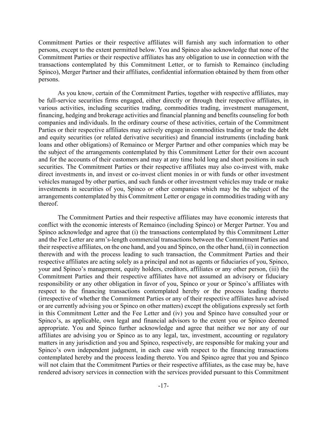 -17- Commitment Parties or their respective affiliates will furnish any such information to other persons, except to the extent permitted below. You and Spinco also acknowledge that none of the Commitment Parties or their respective affiliates has any obligation to use in connection with the transactions contemplated by this Commitment Letter, or to furnish to Remainco (including Spinco), Merger Partner and their affiliates, confidential information obtained by them from other persons. As you know, certain of the Commitment Parties, together with respective affiliates, may be full-service securities firms engaged, either directly or through their respective affiliates, in various activities, including securities trading, commodities trading, investment management, financing, hedging and brokerage activities and financial planning and benefits counseling for both companies and individuals. In the ordinary course of these activities, certain of the Commitment Parties or their respective affiliates may actively engage in commodities trading or trade the debt and equity securities (or related derivative securities) and financial instruments (including bank loans and other obligations) of Remainco or Merger Partner and other companies which may be the subject of the arrangements contemplated by this Commitment Letter for their own account and for the accounts of their customers and may at any time hold long and short positions in such securities. The Commitment Parties or their respective affiliates may also co-invest with, make direct investments in, and invest or co-invest client monies in or with funds or other investment vehicles managed by other parties, and such funds or other investment vehicles may trade or make investments in securities of you, Spinco or other companies which may be the subject of the arrangements contemplated by this Commitment Letter or engage in commodities trading with any thereof. The Commitment Parties and their respective affiliates may have economic interests that conflict with the economic interests of Remainco (including Spinco) or Merger Partner. You and Spinco acknowledge and agree that (i) the transactions contemplated by this Commitment Letter and the Fee Letter are arm’s-length commercial transactions between the Commitment Parties and their respective affiliates, on the one hand, and you and Spinco, on the other hand, (ii) in connection therewith and with the process leading to such transaction, the Commitment Parties and their respective affiliates are acting solely as a principal and not as agents or fiduciaries of you, Spinco, your and Spinco’s management, equity holders, creditors, affiliates or any other person, (iii) the Commitment Parties and their respective affiliates have not assumed an advisory or fiduciary responsibility or any other obligation in favor of you, Spinco or your or Spinco’s affiliates with respect to the financing transactions contemplated hereby or the process leading thereto (irrespective of whether the Commitment Parties or any of their respective affiliates have advised or are currently advising you or Spinco on other matters) except the obligations expressly set forth in this Commitment Letter and the Fee Letter and (iv) you and Spinco have consulted your or Spinco’s, as applicable, own legal and financial advisors to the extent you or Spinco deemed appropriate. You and Spinco further acknowledge and agree that neither we nor any of our affiliates are advising you or Spinco as to any legal, tax, investment, accounting or regulatory matters in any jurisdiction and you and Spinco, respectively, are responsible for making your and Spinco’s own independent judgment, in each case with respect to the financing transactions contemplated hereby and the process leading thereto. You and Spinco agree that you and Spinco will not claim that the Commitment Parties or their respective affiliates, as the case may be, have rendered advisory services in connection with the services provided pursuant to this Commitment