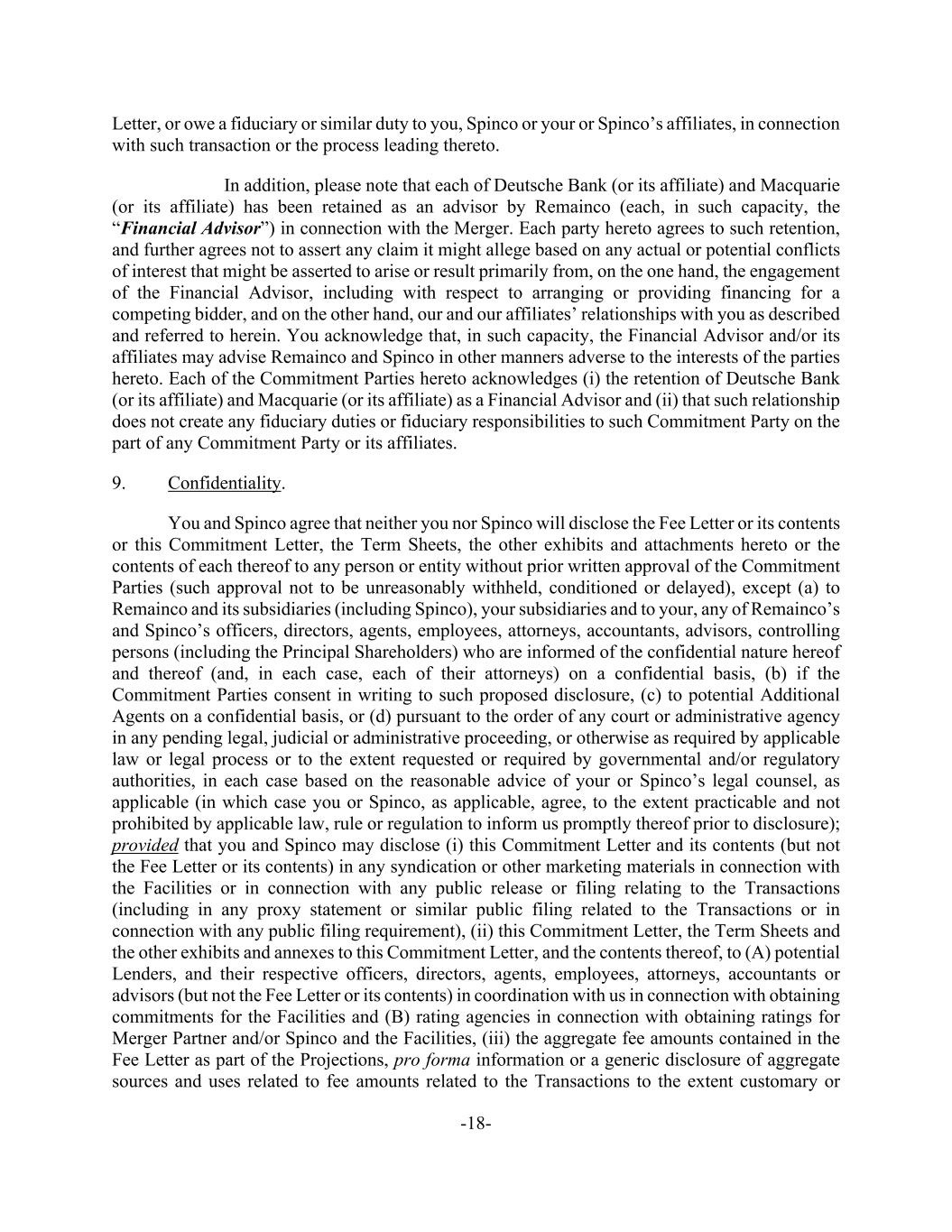 -18- Letter, or owe a fiduciary or similar duty to you, Spinco or your or Spinco’s affiliates, in connection with such transaction or the process leading thereto. In addition, please note that each of Deutsche Bank (or its affiliate) and Macquarie (or its affiliate) has been retained as an advisor by Remainco (each, in such capacity, the “Financial Advisor”) in connection with the Merger. Each party hereto agrees to such retention, and further agrees not to assert any claim it might allege based on any actual or potential conflicts of interest that might be asserted to arise or result primarily from, on the one hand, the engagement of the Financial Advisor, including with respect to arranging or providing financing for a competing bidder, and on the other hand, our and our affiliates’ relationships with you as described and referred to herein. You acknowledge that, in such capacity, the Financial Advisor and/or its affiliates may advise Remainco and Spinco in other manners adverse to the interests of the parties hereto. Each of the Commitment Parties hereto acknowledges (i) the retention of Deutsche Bank (or its affiliate) and Macquarie (or its affiliate) as a Financial Advisor and (ii) that such relationship does not create any fiduciary duties or fiduciary responsibilities to such Commitment Party on the part of any Commitment Party or its affiliates. 9. Confidentiality. You and Spinco agree that neither you nor Spinco will disclose the Fee Letter or its contents or this Commitment Letter, the Term Sheets, the other exhibits and attachments hereto or the contents of each thereof to any person or entity without prior written approval of the Commitment Parties (such approval not to be unreasonably withheld, conditioned or delayed), except (a) to Remainco and its subsidiaries (including Spinco), your subsidiaries and to your, any of Remainco’s and Spinco’s officers, directors, agents, employees, attorneys, accountants, advisors, controlling persons (including the Principal Shareholders) who are informed of the confidential nature hereof and thereof (and, in each case, each of their attorneys) on a confidential basis, (b) if the Commitment Parties consent in writing to such proposed disclosure, (c) to potential Additional Agents on a confidential basis, or (d) pursuant to the order of any court or administrative agency in any pending legal, judicial or administrative proceeding, or otherwise as required by applicable law or legal process or to the extent requested or required by governmental and/or regulatory authorities, in each case based on the reasonable advice of your or Spinco’s legal counsel, as applicable (in which case you or Spinco, as applicable, agree, to the extent practicable and not prohibited by applicable law, rule or regulation to inform us promptly thereof prior to disclosure); provided that you and Spinco may disclose (i) this Commitment Letter and its contents (but not the Fee Letter or its contents) in any syndication or other marketing materials in connection with the Facilities or in connection with any public release or filing relating to the Transactions (including in any proxy statement or similar public filing related to the Transactions or in connection with any public filing requirement), (ii) this Commitment Letter, the Term Sheets and the other exhibits and annexes to this Commitment Letter, and the contents thereof, to (A) potential Lenders, and their respective officers, directors, agents, employees, attorneys, accountants or advisors (but not the Fee Letter or its contents) in coordination with us in connection with obtaining commitments for the Facilities and (B) rating agencies in connection with obtaining ratings for Merger Partner and/or Spinco and the Facilities, (iii) the aggregate fee amounts contained in the Fee Letter as part of the Projections, pro forma information or a generic disclosure of aggregate sources and uses related to fee amounts related to the Transactions to the extent customary or