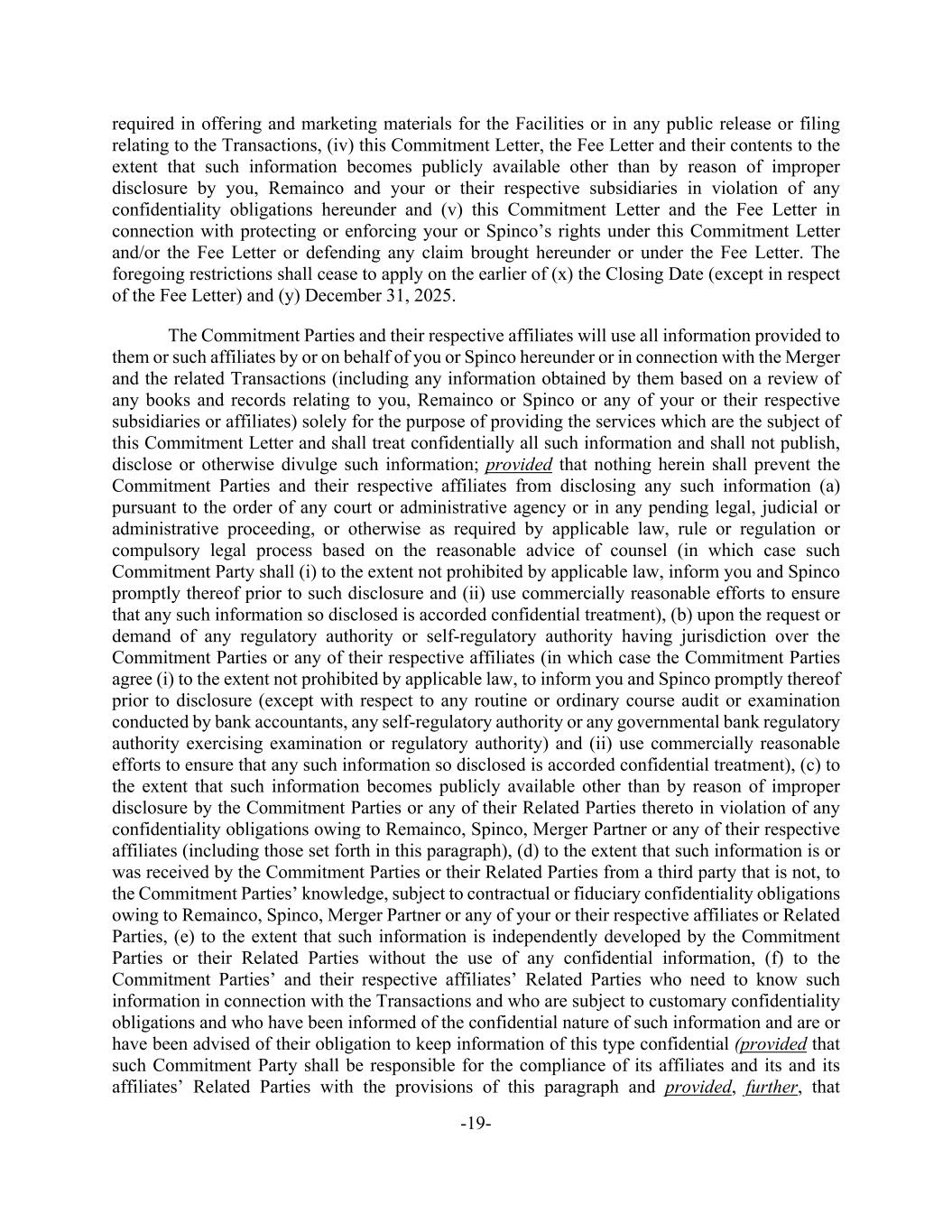 -19- required in offering and marketing materials for the Facilities or in any public release or filing relating to the Transactions, (iv) this Commitment Letter, the Fee Letter and their contents to the extent that such information becomes publicly available other than by reason of improper disclosure by you, Remainco and your or their respective subsidiaries in violation of any confidentiality obligations hereunder and (v) this Commitment Letter and the Fee Letter in connection with protecting or enforcing your or Spinco’s rights under this Commitment Letter and/or the Fee Letter or defending any claim brought hereunder or under the Fee Letter. The foregoing restrictions shall cease to apply on the earlier of (x) the Closing Date (except in respect of the Fee Letter) and (y) December 31, 2025. The Commitment Parties and their respective affiliates will use all information provided to them or such affiliates by or on behalf of you or Spinco hereunder or in connection with the Merger and the related Transactions (including any information obtained by them based on a review of any books and records relating to you, Remainco or Spinco or any of your or their respective subsidiaries or affiliates) solely for the purpose of providing the services which are the subject of this Commitment Letter and shall treat confidentially all such information and shall not publish, disclose or otherwise divulge such information; provided that nothing herein shall prevent the Commitment Parties and their respective affiliates from disclosing any such information (a) pursuant to the order of any court or administrative agency or in any pending legal, judicial or administrative proceeding, or otherwise as required by applicable law, rule or regulation or compulsory legal process based on the reasonable advice of counsel (in which case such Commitment Party shall (i) to the extent not prohibited by applicable law, inform you and Spinco promptly thereof prior to such disclosure and (ii) use commercially reasonable efforts to ensure that any such information so disclosed is accorded confidential treatment), (b) upon the request or demand of any regulatory authority or self-regulatory authority having jurisdiction over the Commitment Parties or any of their respective affiliates (in which case the Commitment Parties agree (i) to the extent not prohibited by applicable law, to inform you and Spinco promptly thereof prior to disclosure (except with respect to any routine or ordinary course audit or examination conducted by bank accountants, any self-regulatory authority or any governmental bank regulatory authority exercising examination or regulatory authority) and (ii) use commercially reasonable efforts to ensure that any such information so disclosed is accorded confidential treatment), (c) to the extent that such information becomes publicly available other than by reason of improper disclosure by the Commitment Parties or any of their Related Parties thereto in violation of any confidentiality obligations owing to Remainco, Spinco, Merger Partner or any of their respective affiliates (including those set forth in this paragraph), (d) to the extent that such information is or was received by the Commitment Parties or their Related Parties from a third party that is not, to the Commitment Parties’ knowledge, subject to contractual or fiduciary confidentiality obligations owing to Remainco, Spinco, Merger Partner or any of your or their respective affiliates or Related Parties, (e) to the extent that such information is independently developed by the Commitment Parties or their Related Parties without the use of any confidential information, (f) to the Commitment Parties’ and their respective affiliates’ Related Parties who need to know such information in connection with the Transactions and who are subject to customary confidentiality obligations and who have been informed of the confidential nature of such information and are or have been advised of their obligation to keep information of this type confidential (provided that such Commitment Party shall be responsible for the compliance of its affiliates and its and its affiliates’ Related Parties with the provisions of this paragraph and provided, further, that
