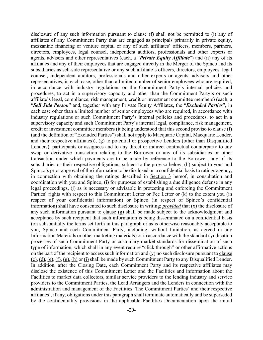 -20- disclosure of any such information pursuant to clause (f) shall not be permitted to (i) any of affiliates of any Commitment Party that are engaged as principals primarily in private equity, mezzanine financing or venture capital or any of such affiliates’ officers, members, partners, directors, employees, legal counsel, independent auditors, professionals and other experts or agents, advisors and other representatives (each, a “Private Equity Affiliate”) and (ii) any of its affiliates and any of their employees that are engaged directly in the Merger of the Spinco and its subsidiaries as sell-side representative or any such affiliate’s officers, directors, employees, legal counsel, independent auditors, professionals and other experts or agents, advisors and other representatives, in each case, other than a limited number of senior employees who are required, in accordance with industry regulations or the Commitment Party’s internal policies and procedures, to act in a supervisory capacity and other than the Commitment Party’s or such affiliate’s legal, compliance, risk management, credit or investment committee members) (each, a “Sell Side Person” and, together with any Private Equity Affiliates, the “Excluded Parties”, in each case other than a limited number of senior employees who are required, in accordance with industry regulations or such Commitment Party’s internal policies and procedures, to act in a supervisory capacity and such Commitment Party’s internal legal, compliance, risk management, credit or investment committee members (it being understood that this second proviso to clause (f) (and the definition of “Excluded Parties”) shall not apply to Macquarie Capital, Macquarie Lender, and their respective affiliates)), (g) to potential or prospective Lenders (other than Disqualified Lenders), participants or assignees and to any direct or indirect contractual counterparty to any swap or derivative transaction relating to the Borrower or any of its subsidiaries or other transaction under which payments are to be made by reference to the Borrower, any of its subsidiaries or their respective obligations, subject to the proviso below, (h) subject to your and Spinco’s prior approval of the information to be disclosed on a confidential basis to ratings agency, in connection with obtaining the ratings described in Section 3 hereof, in consultation and coordination with you and Spinco, (i) for purposes of establishing a due diligence defense in any legal proceedings, (j) as is necessary or advisable in protecting and enforcing the Commitment Parties’ rights with respect to this Commitment Letter or Fee Letter or (k) to the extent you (in respect of your confidential information) or Spinco (in respect of Spinco’s confidential information) shall have consented to such disclosure in writing; provided that (x) the disclosure of any such information pursuant to clause (g) shall be made subject to the acknowledgment and acceptance by such recipient that such information is being disseminated on a confidential basis (on substantially the terms set forth in this paragraph or as is otherwise reasonably acceptable to you, Spinco and each Commitment Party, including, without limitation, as agreed in any Information Materials or other marketing materials) or in accordance with the standard syndication processes of such Commitment Party or customary market standards for dissemination of such type of information, which shall in any event require “click through” or other affirmative actions on the part of the recipient to access such information and (y) no such disclosure pursuant to clause (c), (d), (e), (f), (g), (h) or (i) shall be made by such Commitment Party to any Disqualified Lender. In addition, after the Closing Date, each Commitment Party and its respective affiliates may disclose the existence of this Commitment Letter and the Facilities and information about the Facilities to market data collectors, similar service providers to the lending industry and service providers to the Commitment Parties, the Lead Arrangers and the Lenders in connection with the administration and management of the Facilities. The Commitment Parties’ and their respective affiliates’, if any, obligations under this paragraph shall terminate automatically and be superseded by the confidentiality provisions in the applicable Facilities Documentation upon the initial