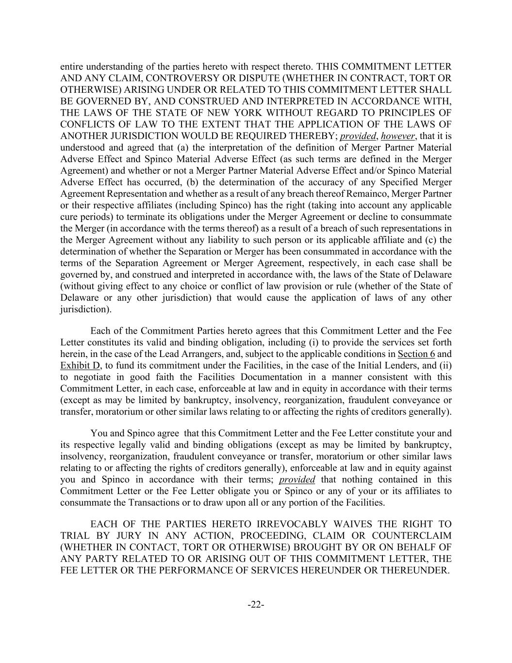 -22- entire understanding of the parties hereto with respect thereto. THIS COMMITMENT LETTER AND ANY CLAIM, CONTROVERSY OR DISPUTE (WHETHER IN CONTRACT, TORT OR OTHERWISE) ARISING UNDER OR RELATED TO THIS COMMITMENT LETTER SHALL BE GOVERNED BY, AND CONSTRUED AND INTERPRETED IN ACCORDANCE WITH, THE LAWS OF THE STATE OF NEW YORK WITHOUT REGARD TO PRINCIPLES OF CONFLICTS OF LAW TO THE EXTENT THAT THE APPLICATION OF THE LAWS OF ANOTHER JURISDICTION WOULD BE REQUIRED THEREBY; provided, however, that it is understood and agreed that (a) the interpretation of the definition of Merger Partner Material Adverse Effect and Spinco Material Adverse Effect (as such terms are defined in the Merger Agreement) and whether or not a Merger Partner Material Adverse Effect and/or Spinco Material Adverse Effect has occurred, (b) the determination of the accuracy of any Specified Merger Agreement Representation and whether as a result of any breach thereof Remainco, Merger Partner or their respective affiliates (including Spinco) has the right (taking into account any applicable cure periods) to terminate its obligations under the Merger Agreement or decline to consummate the Merger (in accordance with the terms thereof) as a result of a breach of such representations in the Merger Agreement without any liability to such person or its applicable affiliate and (c) the determination of whether the Separation or Merger has been consummated in accordance with the terms of the Separation Agreement or Merger Agreement, respectively, in each case shall be governed by, and construed and interpreted in accordance with, the laws of the State of Delaware (without giving effect to any choice or conflict of law provision or rule (whether of the State of Delaware or any other jurisdiction) that would cause the application of laws of any other jurisdiction). Each of the Commitment Parties hereto agrees that this Commitment Letter and the Fee Letter constitutes its valid and binding obligation, including (i) to provide the services set forth herein, in the case of the Lead Arrangers, and, subject to the applicable conditions in Section 6 and Exhibit D, to fund its commitment under the Facilities, in the case of the Initial Lenders, and (ii) to negotiate in good faith the Facilities Documentation in a manner consistent with this Commitment Letter, in each case, enforceable at law and in equity in accordance with their terms (except as may be limited by bankruptcy, insolvency, reorganization, fraudulent conveyance or transfer, moratorium or other similar laws relating to or affecting the rights of creditors generally). You and Spinco agree that this Commitment Letter and the Fee Letter constitute your and its respective legally valid and binding obligations (except as may be limited by bankruptcy, insolvency, reorganization, fraudulent conveyance or transfer, moratorium or other similar laws relating to or affecting the rights of creditors generally), enforceable at law and in equity against you and Spinco in accordance with their terms; provided that nothing contained in this Commitment Letter or the Fee Letter obligate you or Spinco or any of your or its affiliates to consummate the Transactions or to draw upon all or any portion of the Facilities. EACH OF THE PARTIES HERETO IRREVOCABLY WAIVES THE RIGHT TO TRIAL BY JURY IN ANY ACTION, PROCEEDING, CLAIM OR COUNTERCLAIM (WHETHER IN CONTACT, TORT OR OTHERWISE) BROUGHT BY OR ON BEHALF OF ANY PARTY RELATED TO OR ARISING OUT OF THIS COMMITMENT LETTER, THE FEE LETTER OR THE PERFORMANCE OF SERVICES HEREUNDER OR THEREUNDER.