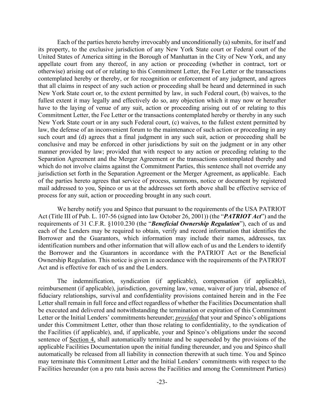 -23- Each of the parties hereto hereby irrevocably and unconditionally (a) submits, for itself and its property, to the exclusive jurisdiction of any New York State court or Federal court of the United States of America sitting in the Borough of Manhattan in the City of New York, and any appellate court from any thereof, in any action or proceeding (whether in contract, tort or otherwise) arising out of or relating to this Commitment Letter, the Fee Letter or the transactions contemplated hereby or thereby, or for recognition or enforcement of any judgment, and agrees that all claims in respect of any such action or proceeding shall be heard and determined in such New York State court or, to the extent permitted by law, in such Federal court, (b) waives, to the fullest extent it may legally and effectively do so, any objection which it may now or hereafter have to the laying of venue of any suit, action or proceeding arising out of or relating to this Commitment Letter, the Fee Letter or the transactions contemplated hereby or thereby in any such New York State court or in any such Federal court, (c) waives, to the fullest extent permitted by law, the defense of an inconvenient forum to the maintenance of such action or proceeding in any such court and (d) agrees that a final judgment in any such suit, action or proceeding shall be conclusive and may be enforced in other jurisdictions by suit on the judgment or in any other manner provided by law; provided that with respect to any action or preceding relating to the Separation Agreement and the Merger Agreement or the transactions contemplated thereby and which do not involve claims against the Commitment Parties, this sentence shall not override any jurisdiction set forth in the Separation Agreement or the Merger Agreement, as applicable. Each of the parties hereto agrees that service of process, summons, notice or document by registered mail addressed to you, Spinco or us at the addresses set forth above shall be effective service of process for any suit, action or proceeding brought in any such court. We hereby notify you and Spinco that pursuant to the requirements of the USA PATRIOT Act (Title III of Pub. L. 107-56 (signed into law October 26, 2001)) (the “PATRIOT Act”) and the requirements of 31 C.F.R. §1010.230 (the “Beneficial Ownership Regulation”), each of us and each of the Lenders may be required to obtain, verify and record information that identifies the Borrower and the Guarantors, which information may include their names, addresses, tax identification numbers and other information that will allow each of us and the Lenders to identify the Borrower and the Guarantors in accordance with the PATRIOT Act or the Beneficial Ownership Regulation. This notice is given in accordance with the requirements of the PATRIOT Act and is effective for each of us and the Lenders. The indemnification, syndication (if applicable), compensation (if applicable), reimbursement (if applicable), jurisdiction, governing law, venue, waiver of jury trial, absence of fiduciary relationships, survival and confidentiality provisions contained herein and in the Fee Letter shall remain in full force and effect regardless of whether the Facilities Documentation shall be executed and delivered and notwithstanding the termination or expiration of this Commitment Letter or the Initial Lenders’ commitments hereunder; provided that your and Spinco’s obligations under this Commitment Letter, other than those relating to confidentiality, to the syndication of the Facilities (if applicable), and, if applicable, your and Spinco’s obligations under the second sentence of Section 4, shall automatically terminate and be superseded by the provisions of the applicable Facilities Documentation upon the initial funding thereunder, and you and Spinco shall automatically be released from all liability in connection therewith at such time. You and Spinco may terminate this Commitment Letter and the Initial Lenders’ commitments with respect to the Facilities hereunder (on a pro rata basis across the Facilities and among the Commitment Parties)