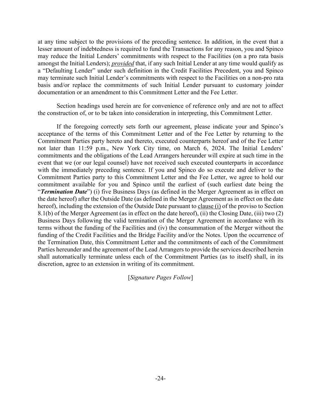 -24- at any time subject to the provisions of the preceding sentence. In addition, in the event that a lesser amount of indebtedness is required to fund the Transactions for any reason, you and Spinco may reduce the Initial Lenders’ commitments with respect to the Facilities (on a pro rata basis amongst the Initial Lenders); provided that, if any such Initial Lender at any time would qualify as a “Defaulting Lender” under such definition in the Credit Facilities Precedent, you and Spinco may terminate such Initial Lender’s commitments with respect to the Facilities on a non-pro rata basis and/or replace the commitments of such Initial Lender pursuant to customary joinder documentation or an amendment to this Commitment Letter and the Fee Letter. Section headings used herein are for convenience of reference only and are not to affect the construction of, or to be taken into consideration in interpreting, this Commitment Letter. If the foregoing correctly sets forth our agreement, please indicate your and Spinco’s acceptance of the terms of this Commitment Letter and of the Fee Letter by returning to the Commitment Parties party hereto and thereto, executed counterparts hereof and of the Fee Letter not later than 11:59 p.m., New York City time, on March 6, 2024. The Initial Lenders’ commitments and the obligations of the Lead Arrangers hereunder will expire at such time in the event that we (or our legal counsel) have not received such executed counterparts in accordance with the immediately preceding sentence. If you and Spinco do so execute and deliver to the Commitment Parties party to this Commitment Letter and the Fee Letter, we agree to hold our commitment available for you and Spinco until the earliest of (such earliest date being the “Termination Date”) (i) five Business Days (as defined in the Merger Agreement as in effect on the date hereof) after the Outside Date (as defined in the Merger Agreement as in effect on the date hereof), including the extension of the Outside Date pursuant to clause (i) of the proviso to Section 8.1(b) of the Merger Agreement (as in effect on the date hereof), (ii) the Closing Date, (iii) two (2) Business Days following the valid termination of the Merger Agreement in accordance with its terms without the funding of the Facilities and (iv) the consummation of the Merger without the funding of the Credit Facilities and the Bridge Facility and/or the Notes. Upon the occurrence of the Termination Date, this Commitment Letter and the commitments of each of the Commitment Parties hereunder and the agreement of the Lead Arrangers to provide the services described herein shall automatically terminate unless each of the Commitment Parties (as to itself) shall, in its discretion, agree to an extension in writing of its commitment. [Signature Pages Follow]