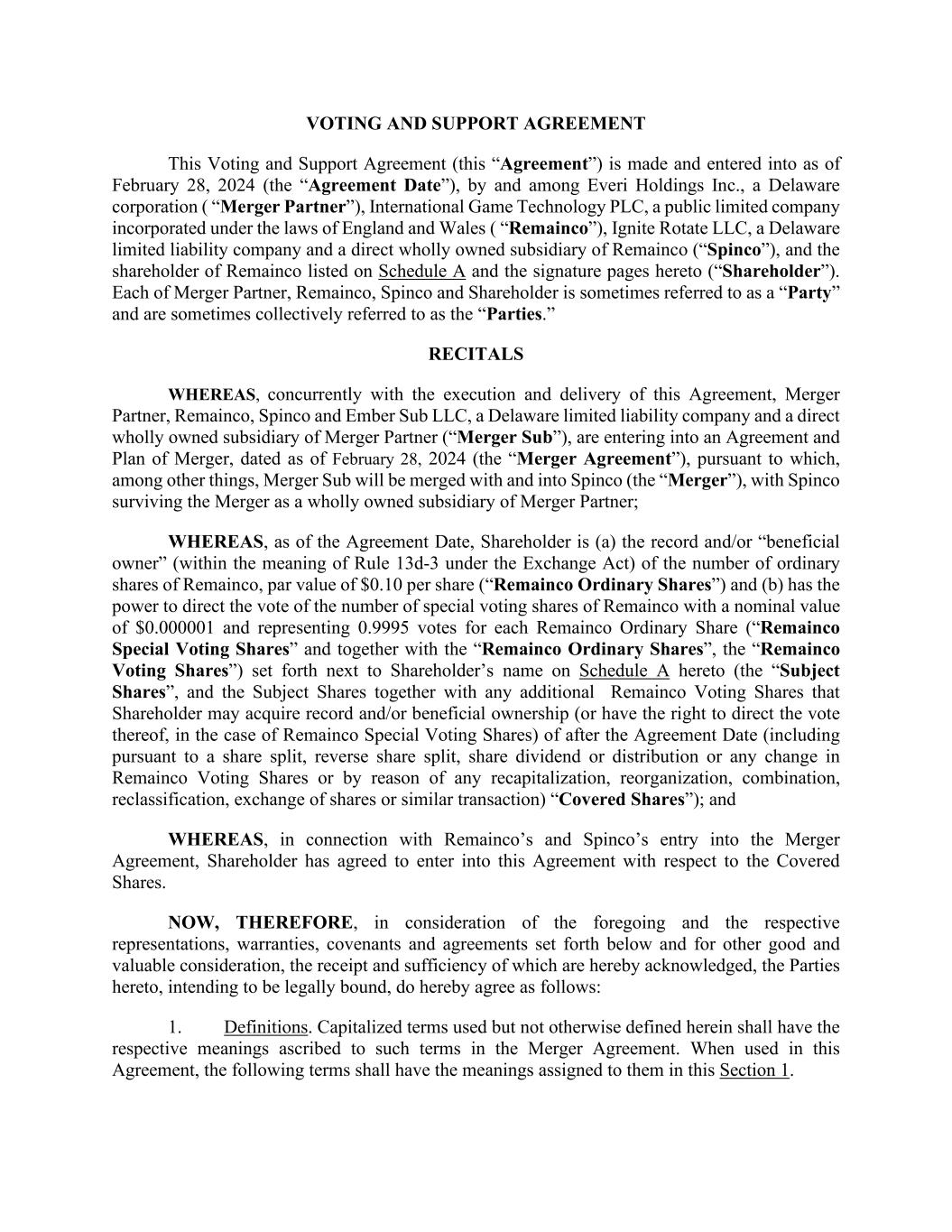 VOTING AND SUPPORT AGREEMENT This Voting and Support Agreement (this “Agreement”) is made and entered into as of February 28, 2024 (the “Agreement Date”), by and among Everi Holdings Inc., a Delaware corporation ( “Merger Partner”), International Game Technology PLC, a public limited company incorporated under the laws of England and Wales ( “Remainco”), Ignite Rotate LLC, a Delaware limited liability company and a direct wholly owned subsidiary of Remainco (“Spinco”), and the shareholder of Remainco listed on Schedule A and the signature pages hereto (“Shareholder”). Each of Merger Partner, Remainco, Spinco and Shareholder is sometimes referred to as a “Party” and are sometimes collectively referred to as the “Parties.” RECITALS WHEREAS, concurrently with the execution and delivery of this Agreement, Merger Partner, Remainco, Spinco and Ember Sub LLC, a Delaware limited liability company and a direct wholly owned subsidiary of Merger Partner (“Merger Sub”), are entering into an Agreement and Plan of Merger, dated as of February 28, 2024 (the “Merger Agreement”), pursuant to which, among other things, Merger Sub will be merged with and into Spinco (the “Merger”), with Spinco surviving the Merger as a wholly owned subsidiary of Merger Partner; WHEREAS, as of the Agreement Date, Shareholder is (a) the record and/or “beneficial owner” (within the meaning of Rule 13d-3 under the Exchange Act) of the number of ordinary shares of Remainco, par value of $0.10 per share (“Remainco Ordinary Shares”) and (b) has the power to direct the vote of the number of special voting shares of Remainco with a nominal value of $0.000001 and representing 0.9995 votes for each Remainco Ordinary Share (“Remainco Special Voting Shares” and together with the “Remainco Ordinary Shares”, the “Remainco Voting Shares”) set forth next to Shareholder’s name on Schedule A hereto (the “Subject Shares”, and the Subject Shares together with any additional Remainco Voting Shares that Shareholder may acquire record and/or beneficial ownership (or have the right to direct the vote thereof, in the case of Remainco Special Voting Shares) of after the Agreement Date (including pursuant to a share split, reverse share split, share dividend or distribution or any change in Remainco Voting Shares or by reason of any recapitalization, reorganization, combination, reclassification, exchange of shares or similar transaction) “Covered Shares”); and WHEREAS, in connection with Remainco’s and Spinco’s entry into the Merger Agreement, Shareholder has agreed to enter into this Agreement with respect to the Covered Shares. NOW, THEREFORE, in consideration of the foregoing and the respective representations, warranties, covenants and agreements set forth below and for other good and valuable consideration, the receipt and sufficiency of which are hereby acknowledged, the Parties hereto, intending to be legally bound, do hereby agree as follows: 1. Definitions. Capitalized terms used but not otherwise defined herein shall have the respective meanings ascribed to such terms in the Merger Agreement. When used in this Agreement, the following terms shall have the meanings assigned to them in this Section 1.