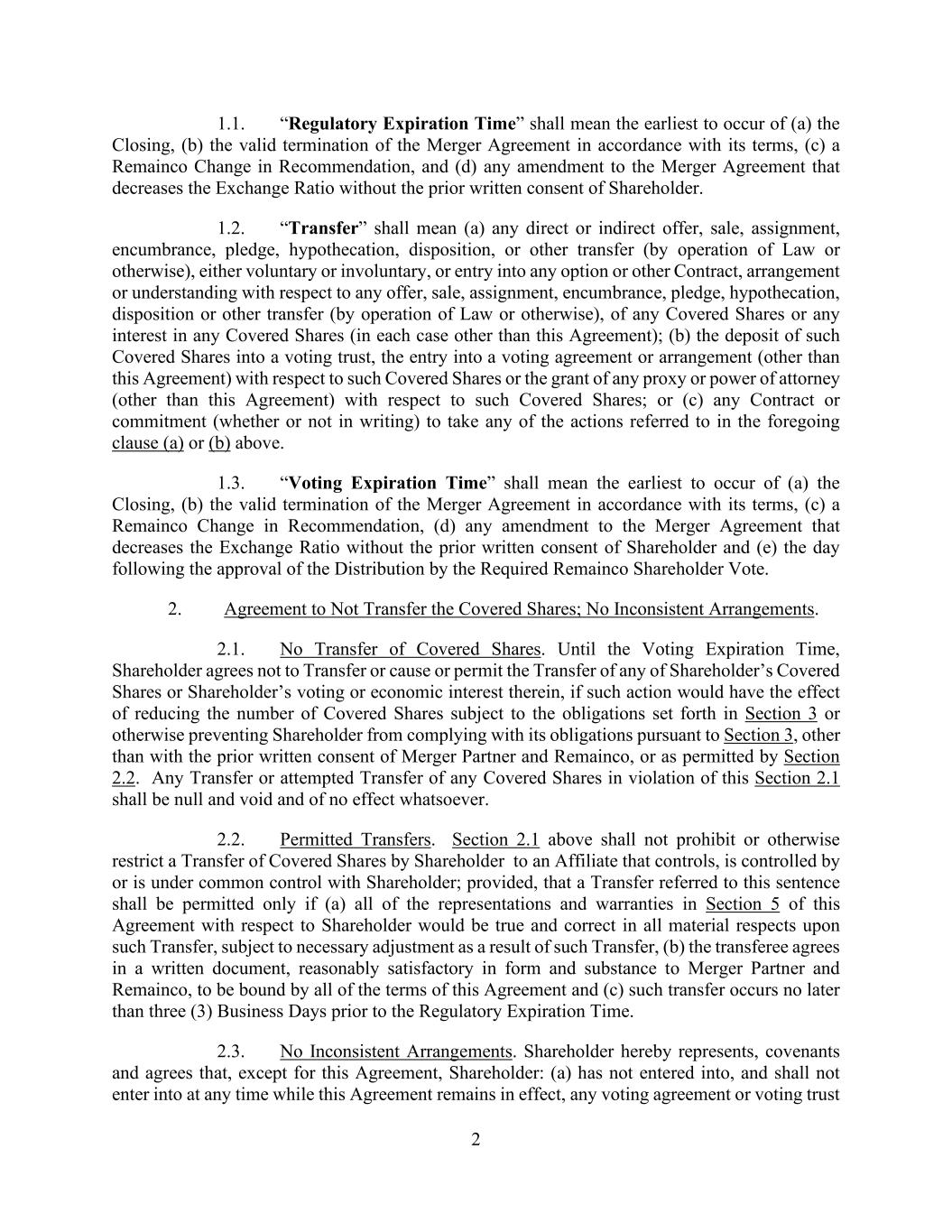 2 1.1. “Regulatory Expiration Time” shall mean the earliest to occur of (a) the Closing, (b) the valid termination of the Merger Agreement in accordance with its terms, (c) a Remainco Change in Recommendation, and (d) any amendment to the Merger Agreement that decreases the Exchange Ratio without the prior written consent of Shareholder. 1.2. “Transfer” shall mean (a) any direct or indirect offer, sale, assignment, encumbrance, pledge, hypothecation, disposition, or other transfer (by operation of Law or otherwise), either voluntary or involuntary, or entry into any option or other Contract, arrangement or understanding with respect to any offer, sale, assignment, encumbrance, pledge, hypothecation, disposition or other transfer (by operation of Law or otherwise), of any Covered Shares or any interest in any Covered Shares (in each case other than this Agreement); (b) the deposit of such Covered Shares into a voting trust, the entry into a voting agreement or arrangement (other than this Agreement) with respect to such Covered Shares or the grant of any proxy or power of attorney (other than this Agreement) with respect to such Covered Shares; or (c) any Contract or commitment (whether or not in writing) to take any of the actions referred to in the foregoing clause (a) or (b) above. 1.3. “Voting Expiration Time” shall mean the earliest to occur of (a) the Closing, (b) the valid termination of the Merger Agreement in accordance with its terms, (c) a Remainco Change in Recommendation, (d) any amendment to the Merger Agreement that decreases the Exchange Ratio without the prior written consent of Shareholder and (e) the day following the approval of the Distribution by the Required Remainco Shareholder Vote. 2. Agreement to Not Transfer the Covered Shares; No Inconsistent Arrangements. 2.1. No Transfer of Covered Shares. Until the Voting Expiration Time, Shareholder agrees not to Transfer or cause or permit the Transfer of any of Shareholder’s Covered Shares or Shareholder’s voting or economic interest therein, if such action would have the effect of reducing the number of Covered Shares subject to the obligations set forth in Section 3 or otherwise preventing Shareholder from complying with its obligations pursuant to Section 3, other than with the prior written consent of Merger Partner and Remainco, or as permitted by Section 2.2. Any Transfer or attempted Transfer of any Covered Shares in violation of this Section 2.1 shall be null and void and of no effect whatsoever. 2.2. Permitted Transfers. Section 2.1 above shall not prohibit or otherwise restrict a Transfer of Covered Shares by Shareholder to an Affiliate that controls, is controlled by or is under common control with Shareholder; provided, that a Transfer referred to this sentence shall be permitted only if (a) all of the representations and warranties in Section 5 of this Agreement with respect to Shareholder would be true and correct in all material respects upon such Transfer, subject to necessary adjustment as a result of such Transfer, (b) the transferee agrees in a written document, reasonably satisfactory in form and substance to Merger Partner and Remainco, to be bound by all of the terms of this Agreement and (c) such transfer occurs no later than three (3) Business Days prior to the Regulatory Expiration Time. 2.3. No Inconsistent Arrangements. Shareholder hereby represents, covenants and agrees that, except for this Agreement, Shareholder: (a) has not entered into, and shall not enter into at any time while this Agreement remains in effect, any voting agreement or voting trust
