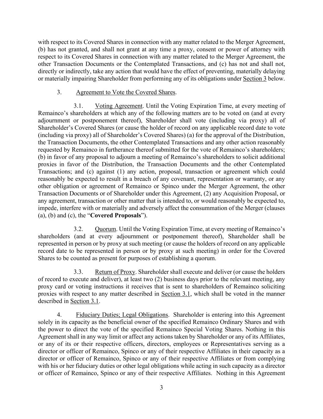 3 with respect to its Covered Shares in connection with any matter related to the Merger Agreement, (b) has not granted, and shall not grant at any time a proxy, consent or power of attorney with respect to its Covered Shares in connection with any matter related to the Merger Agreement, the other Transaction Documents or the Contemplated Transactions, and (c) has not and shall not, directly or indirectly, take any action that would have the effect of preventing, materially delaying or materially impairing Shareholder from performing any of its obligations under Section 3 below. 3. Agreement to Vote the Covered Shares. 3.1. Voting Agreement. Until the Voting Expiration Time, at every meeting of Remainco’s shareholders at which any of the following matters are to be voted on (and at every adjournment or postponement thereof), Shareholder shall vote (including via proxy) all of Shareholder’s Covered Shares (or cause the holder of record on any applicable record date to vote (including via proxy) all of Shareholder’s Covered Shares) (a) for the approval of the Distribution, the Transaction Documents, the other Contemplated Transactions and any other action reasonably requested by Remainco in furtherance thereof submitted for the vote of Remainco’s shareholders; (b) in favor of any proposal to adjourn a meeting of Remainco’s shareholders to solicit additional proxies in favor of the Distribution, the Transaction Documents and the other Contemplated Transactions; and (c) against (1) any action, proposal, transaction or agreement which could reasonably be expected to result in a breach of any covenant, representation or warranty, or any other obligation or agreement of Remainco or Spinco under the Merger Agreement, the other Transaction Documents or of Shareholder under this Agreement, (2) any Acquisition Proposal, or any agreement, transaction or other matter that is intended to, or would reasonably be expected to, impede, interfere with or materially and adversely affect the consummation of the Merger (clauses (a), (b) and (c), the “Covered Proposals”). 3.2. Quorum. Until the Voting Expiration Time, at every meeting of Remainco’s shareholders (and at every adjournment or postponement thereof), Shareholder shall be represented in person or by proxy at such meeting (or cause the holders of record on any applicable record date to be represented in person or by proxy at such meeting) in order for the Covered Shares to be counted as present for purposes of establishing a quorum. 3.3. Return of Proxy. Shareholder shall execute and deliver (or cause the holders of record to execute and deliver), at least two (2) business days prior to the relevant meeting, any proxy card or voting instructions it receives that is sent to shareholders of Remainco soliciting proxies with respect to any matter described in Section 3.1, which shall be voted in the manner described in Section 3.1. 4. Fiduciary Duties; Legal Obligations. Shareholder is entering into this Agreement solely in its capacity as the beneficial owner of the specified Remainco Ordinary Shares and with the power to direct the vote of the specified Remainco Special Voting Shares. Nothing in this Agreement shall in any way limit or affect any actions taken by Shareholder or any of its Affiliates, or any of its or their respective officers, directors, employees or Representatives serving as a director or officer of Remainco, Spinco or any of their respective Affiliates in their capacity as a director or officer of Remainco, Spinco or any of their respective Affiliates or from complying with his or her fiduciary duties or other legal obligations while acting in such capacity as a director or officer of Remainco, Spinco or any of their respective Affiliates. Nothing in this Agreement