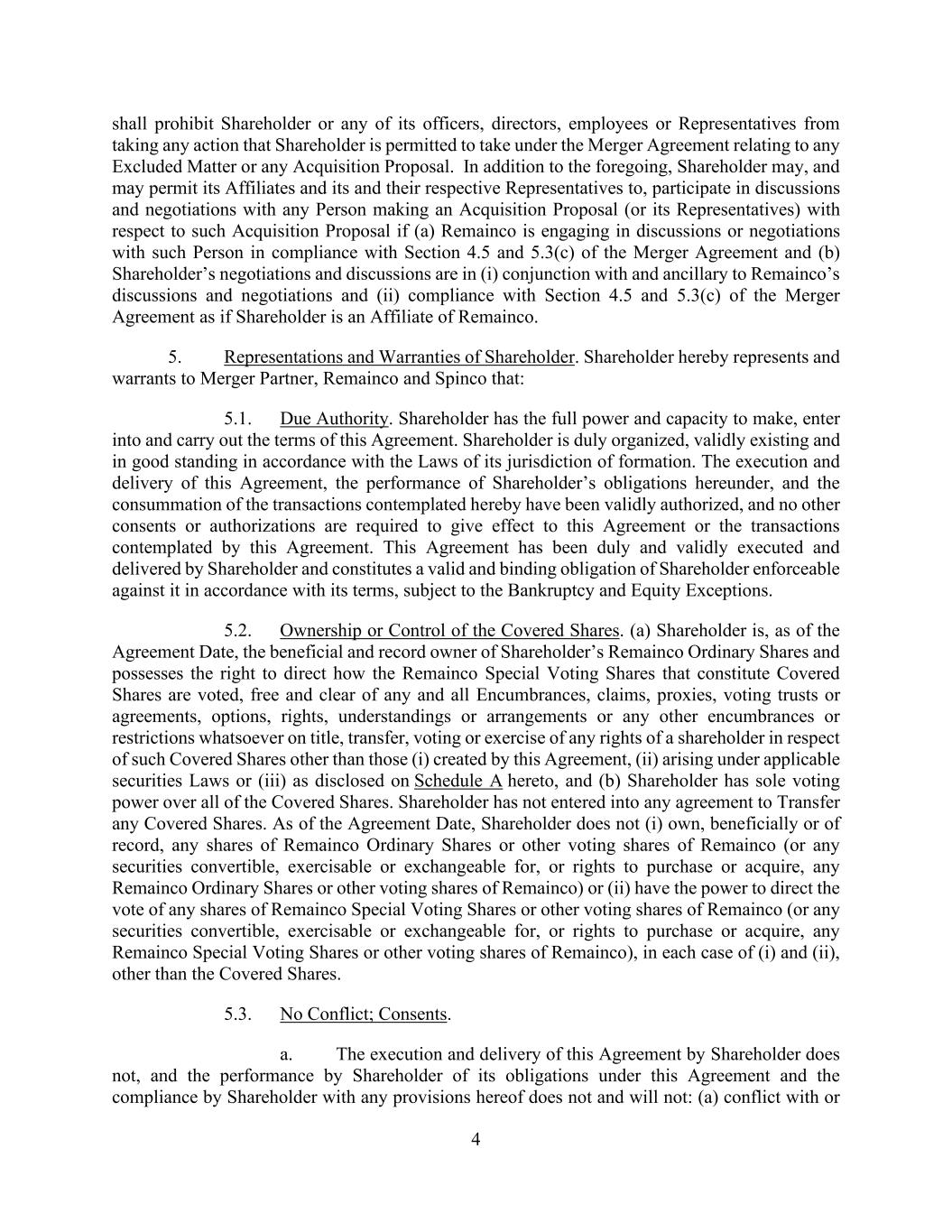 4 shall prohibit Shareholder or any of its officers, directors, employees or Representatives from taking any action that Shareholder is permitted to take under the Merger Agreement relating to any Excluded Matter or any Acquisition Proposal. In addition to the foregoing, Shareholder may, and may permit its Affiliates and its and their respective Representatives to, participate in discussions and negotiations with any Person making an Acquisition Proposal (or its Representatives) with respect to such Acquisition Proposal if (a) Remainco is engaging in discussions or negotiations with such Person in compliance with Section 4.5 and 5.3(c) of the Merger Agreement and (b) Shareholder’s negotiations and discussions are in (i) conjunction with and ancillary to Remainco’s discussions and negotiations and (ii) compliance with Section 4.5 and 5.3(c) of the Merger Agreement as if Shareholder is an Affiliate of Remainco. 5. Representations and Warranties of Shareholder. Shareholder hereby represents and warrants to Merger Partner, Remainco and Spinco that: 5.1. Due Authority. Shareholder has the full power and capacity to make, enter into and carry out the terms of this Agreement. Shareholder is duly organized, validly existing and in good standing in accordance with the Laws of its jurisdiction of formation. The execution and delivery of this Agreement, the performance of Shareholder’s obligations hereunder, and the consummation of the transactions contemplated hereby have been validly authorized, and no other consents or authorizations are required to give effect to this Agreement or the transactions contemplated by this Agreement. This Agreement has been duly and validly executed and delivered by Shareholder and constitutes a valid and binding obligation of Shareholder enforceable against it in accordance with its terms, subject to the Bankruptcy and Equity Exceptions. 5.2. Ownership or Control of the Covered Shares. (a) Shareholder is, as of the Agreement Date, the beneficial and record owner of Shareholder’s Remainco Ordinary Shares and possesses the right to direct how the Remainco Special Voting Shares that constitute Covered Shares are voted, free and clear of any and all Encumbrances, claims, proxies, voting trusts or agreements, options, rights, understandings or arrangements or any other encumbrances or restrictions whatsoever on title, transfer, voting or exercise of any rights of a shareholder in respect of such Covered Shares other than those (i) created by this Agreement, (ii) arising under applicable securities Laws or (iii) as disclosed on Schedule A hereto, and (b) Shareholder has sole voting power over all of the Covered Shares. Shareholder has not entered into any agreement to Transfer any Covered Shares. As of the Agreement Date, Shareholder does not (i) own, beneficially or of record, any shares of Remainco Ordinary Shares or other voting shares of Remainco (or any securities convertible, exercisable or exchangeable for, or rights to purchase or acquire, any Remainco Ordinary Shares or other voting shares of Remainco) or (ii) have the power to direct the vote of any shares of Remainco Special Voting Shares or other voting shares of Remainco (or any securities convertible, exercisable or exchangeable for, or rights to purchase or acquire, any Remainco Special Voting Shares or other voting shares of Remainco), in each case of (i) and (ii), other than the Covered Shares. 5.3. No Conflict; Consents. a. The execution and delivery of this Agreement by Shareholder does not, and the performance by Shareholder of its obligations under this Agreement and the compliance by Shareholder with any provisions hereof does not and will not: (a) conflict with or