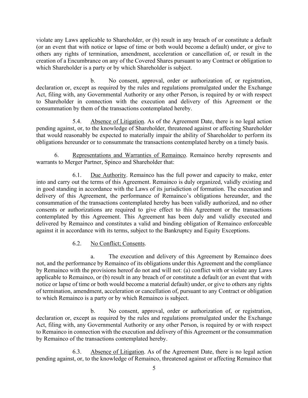 5 violate any Laws applicable to Shareholder, or (b) result in any breach of or constitute a default (or an event that with notice or lapse of time or both would become a default) under, or give to others any rights of termination, amendment, acceleration or cancellation of, or result in the creation of a Encumbrance on any of the Covered Shares pursuant to any Contract or obligation to which Shareholder is a party or by which Shareholder is subject. b. No consent, approval, order or authorization of, or registration, declaration or, except as required by the rules and regulations promulgated under the Exchange Act, filing with, any Governmental Authority or any other Person, is required by or with respect to Shareholder in connection with the execution and delivery of this Agreement or the consummation by them of the transactions contemplated hereby. 5.4. Absence of Litigation. As of the Agreement Date, there is no legal action pending against, or, to the knowledge of Shareholder, threatened against or affecting Shareholder that would reasonably be expected to materially impair the ability of Shareholder to perform its obligations hereunder or to consummate the transactions contemplated hereby on a timely basis. 6. Representations and Warranties of Remainco. Remainco hereby represents and warrants to Merger Partner, Spinco and Shareholder that: 6.1. Due Authority. Remainco has the full power and capacity to make, enter into and carry out the terms of this Agreement. Remainco is duly organized, validly existing and in good standing in accordance with the Laws of its jurisdiction of formation. The execution and delivery of this Agreement, the performance of Remainco’s obligations hereunder, and the consummation of the transactions contemplated hereby has been validly authorized, and no other consents or authorizations are required to give effect to this Agreement or the transactions contemplated by this Agreement. This Agreement has been duly and validly executed and delivered by Remainco and constitutes a valid and binding obligation of Remainco enforceable against it in accordance with its terms, subject to the Bankruptcy and Equity Exceptions. 6.2. No Conflict; Consents. a. The execution and delivery of this Agreement by Remainco does not, and the performance by Remainco of its obligations under this Agreement and the compliance by Remainco with the provisions hereof do not and will not: (a) conflict with or violate any Laws applicable to Remainco, or (b) result in any breach of or constitute a default (or an event that with notice or lapse of time or both would become a material default) under, or give to others any rights of termination, amendment, acceleration or cancellation of, pursuant to any Contract or obligation to which Remainco is a party or by which Remainco is subject. b. No consent, approval, order or authorization of, or registration, declaration or, except as required by the rules and regulations promulgated under the Exchange Act, filing with, any Governmental Authority or any other Person, is required by or with respect to Remainco in connection with the execution and delivery of this Agreement or the consummation by Remainco of the transactions contemplated hereby. 6.3. Absence of Litigation. As of the Agreement Date, there is no legal action pending against, or, to the knowledge of Remainco, threatened against or affecting Remainco that