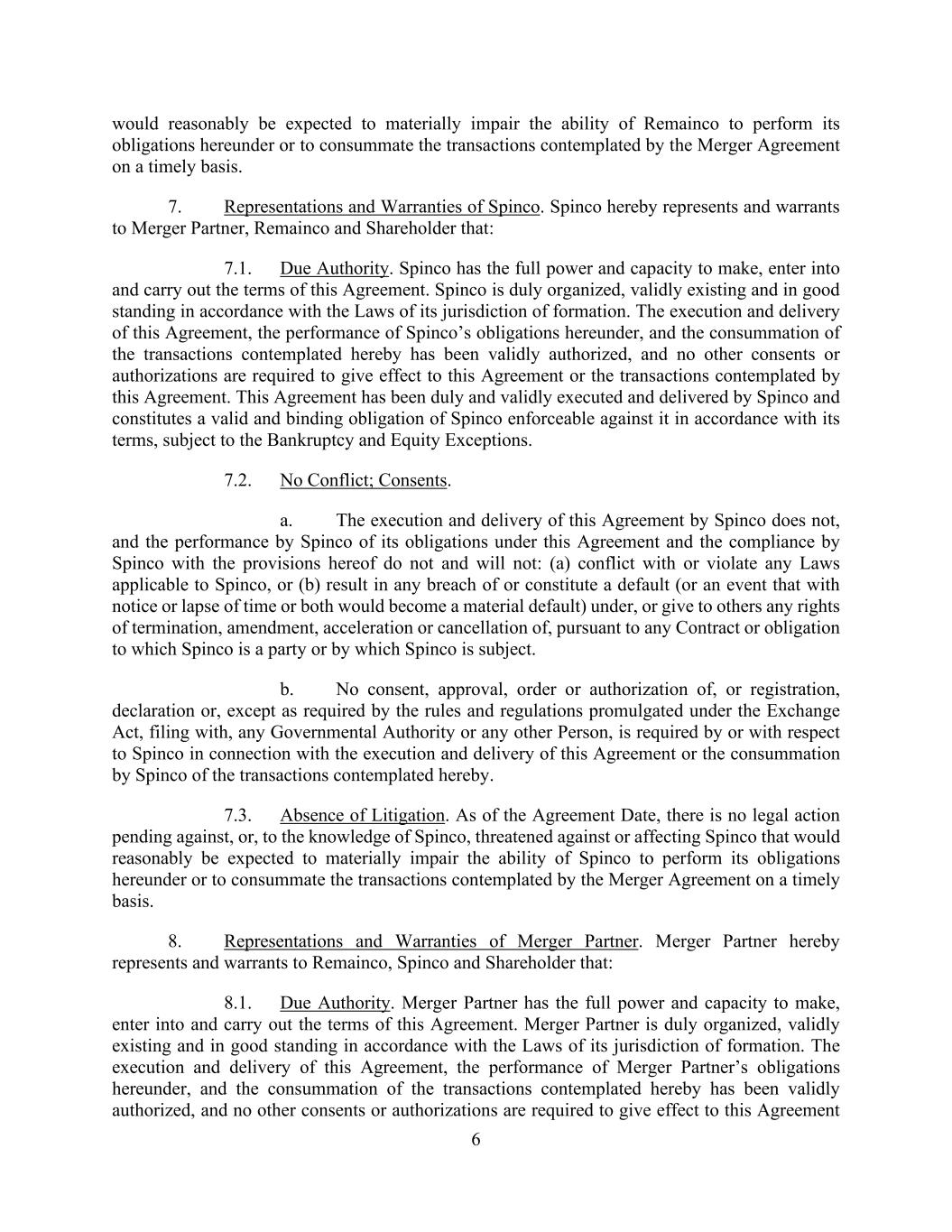 6 would reasonably be expected to materially impair the ability of Remainco to perform its obligations hereunder or to consummate the transactions contemplated by the Merger Agreement on a timely basis. 7. Representations and Warranties of Spinco. Spinco hereby represents and warrants to Merger Partner, Remainco and Shareholder that: 7.1. Due Authority. Spinco has the full power and capacity to make, enter into and carry out the terms of this Agreement. Spinco is duly organized, validly existing and in good standing in accordance with the Laws of its jurisdiction of formation. The execution and delivery of this Agreement, the performance of Spinco’s obligations hereunder, and the consummation of the transactions contemplated hereby has been validly authorized, and no other consents or authorizations are required to give effect to this Agreement or the transactions contemplated by this Agreement. This Agreement has been duly and validly executed and delivered by Spinco and constitutes a valid and binding obligation of Spinco enforceable against it in accordance with its terms, subject to the Bankruptcy and Equity Exceptions. 7.2. No Conflict; Consents. a. The execution and delivery of this Agreement by Spinco does not, and the performance by Spinco of its obligations under this Agreement and the compliance by Spinco with the provisions hereof do not and will not: (a) conflict with or violate any Laws applicable to Spinco, or (b) result in any breach of or constitute a default (or an event that with notice or lapse of time or both would become a material default) under, or give to others any rights of termination, amendment, acceleration or cancellation of, pursuant to any Contract or obligation to which Spinco is a party or by which Spinco is subject. b. No consent, approval, order or authorization of, or registration, declaration or, except as required by the rules and regulations promulgated under the Exchange Act, filing with, any Governmental Authority or any other Person, is required by or with respect to Spinco in connection with the execution and delivery of this Agreement or the consummation by Spinco of the transactions contemplated hereby. 7.3. Absence of Litigation. As of the Agreement Date, there is no legal action pending against, or, to the knowledge of Spinco, threatened against or affecting Spinco that would reasonably be expected to materially impair the ability of Spinco to perform its obligations hereunder or to consummate the transactions contemplated by the Merger Agreement on a timely basis. 8. Representations and Warranties of Merger Partner. Merger Partner hereby represents and warrants to Remainco, Spinco and Shareholder that: 8.1. Due Authority. Merger Partner has the full power and capacity to make, enter into and carry out the terms of this Agreement. Merger Partner is duly organized, validly existing and in good standing in accordance with the Laws of its jurisdiction of formation. The execution and delivery of this Agreement, the performance of Merger Partner’s obligations hereunder, and the consummation of the transactions contemplated hereby has been validly authorized, and no other consents or authorizations are required to give effect to this Agreement