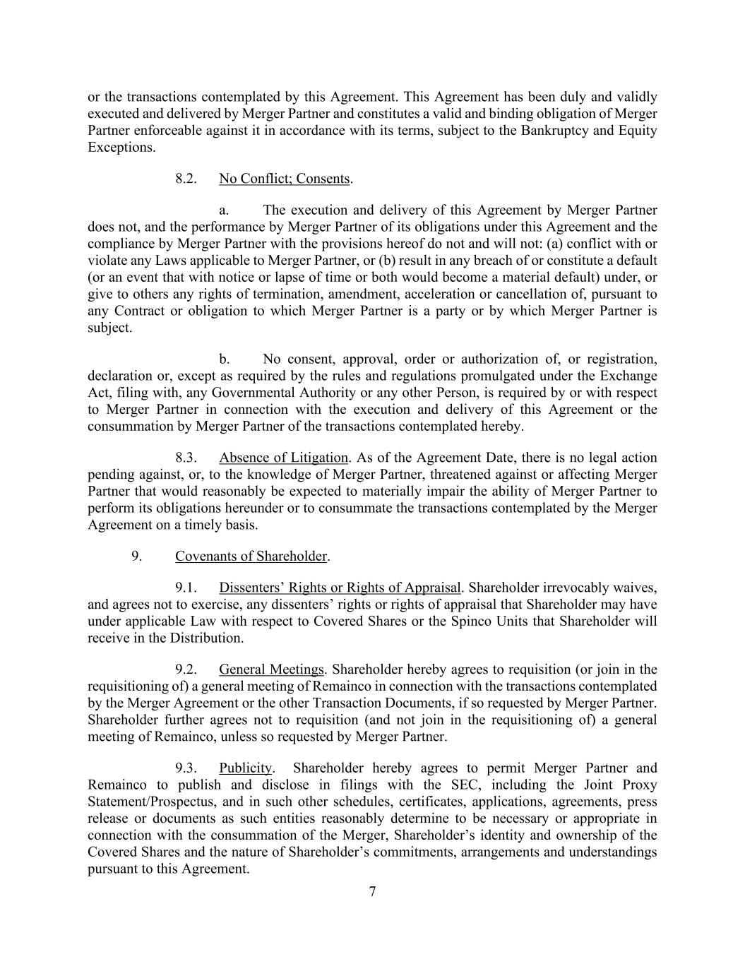 7 or the transactions contemplated by this Agreement. This Agreement has been duly and validly executed and delivered by Merger Partner and constitutes a valid and binding obligation of Merger Partner enforceable against it in accordance with its terms, subject to the Bankruptcy and Equity Exceptions. 8.2. No Conflict; Consents. a. The execution and delivery of this Agreement by Merger Partner does not, and the performance by Merger Partner of its obligations under this Agreement and the compliance by Merger Partner with the provisions hereof do not and will not: (a) conflict with or violate any Laws applicable to Merger Partner, or (b) result in any breach of or constitute a default (or an event that with notice or lapse of time or both would become a material default) under, or give to others any rights of termination, amendment, acceleration or cancellation of, pursuant to any Contract or obligation to which Merger Partner is a party or by which Merger Partner is subject. b. No consent, approval, order or authorization of, or registration, declaration or, except as required by the rules and regulations promulgated under the Exchange Act, filing with, any Governmental Authority or any other Person, is required by or with respect to Merger Partner in connection with the execution and delivery of this Agreement or the consummation by Merger Partner of the transactions contemplated hereby. 8.3. Absence of Litigation. As of the Agreement Date, there is no legal action pending against, or, to the knowledge of Merger Partner, threatened against or affecting Merger Partner that would reasonably be expected to materially impair the ability of Merger Partner to perform its obligations hereunder or to consummate the transactions contemplated by the Merger Agreement on a timely basis. 9. Covenants of Shareholder. 9.1. Dissenters’ Rights or Rights of Appraisal. Shareholder irrevocably waives, and agrees not to exercise, any dissenters’ rights or rights of appraisal that Shareholder may have under applicable Law with respect to Covered Shares or the Spinco Units that Shareholder will receive in the Distribution. 9.2. General Meetings. Shareholder hereby agrees to requisition (or join in the requisitioning of) a general meeting of Remainco in connection with the transactions contemplated by the Merger Agreement or the other Transaction Documents, if so requested by Merger Partner. Shareholder further agrees not to requisition (and not join in the requisitioning of) a general meeting of Remainco, unless so requested by Merger Partner. 9.3. Publicity. Shareholder hereby agrees to permit Merger Partner and Remainco to publish and disclose in filings with the SEC, including the Joint Proxy Statement/Prospectus, and in such other schedules, certificates, applications, agreements, press release or documents as such entities reasonably determine to be necessary or appropriate in connection with the consummation of the Merger, Shareholder’s identity and ownership of the Covered Shares and the nature of Shareholder’s commitments, arrangements and understandings pursuant to this Agreement.