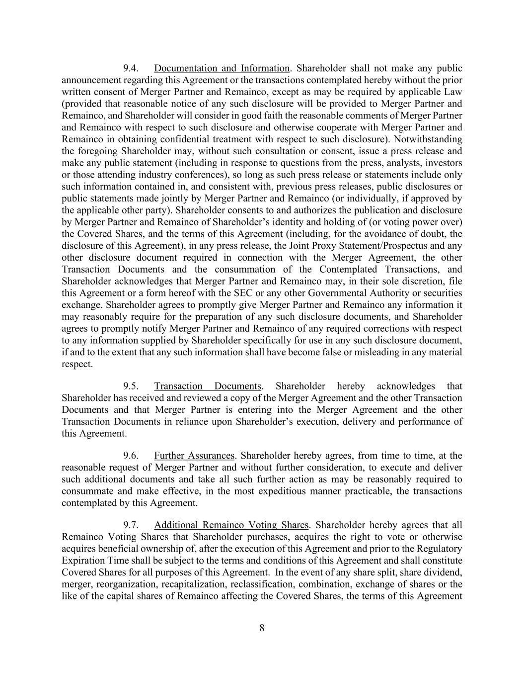 8 9.4. Documentation and Information. Shareholder shall not make any public announcement regarding this Agreement or the transactions contemplated hereby without the prior written consent of Merger Partner and Remainco, except as may be required by applicable Law (provided that reasonable notice of any such disclosure will be provided to Merger Partner and Remainco, and Shareholder will consider in good faith the reasonable comments of Merger Partner and Remainco with respect to such disclosure and otherwise cooperate with Merger Partner and Remainco in obtaining confidential treatment with respect to such disclosure). Notwithstanding the foregoing Shareholder may, without such consultation or consent, issue a press release and make any public statement (including in response to questions from the press, analysts, investors or those attending industry conferences), so long as such press release or statements include only such information contained in, and consistent with, previous press releases, public disclosures or public statements made jointly by Merger Partner and Remainco (or individually, if approved by the applicable other party). Shareholder consents to and authorizes the publication and disclosure by Merger Partner and Remainco of Shareholder’s identity and holding of (or voting power over) the Covered Shares, and the terms of this Agreement (including, for the avoidance of doubt, the disclosure of this Agreement), in any press release, the Joint Proxy Statement/Prospectus and any other disclosure document required in connection with the Merger Agreement, the other Transaction Documents and the consummation of the Contemplated Transactions, and Shareholder acknowledges that Merger Partner and Remainco may, in their sole discretion, file this Agreement or a form hereof with the SEC or any other Governmental Authority or securities exchange. Shareholder agrees to promptly give Merger Partner and Remainco any information it may reasonably require for the preparation of any such disclosure documents, and Shareholder agrees to promptly notify Merger Partner and Remainco of any required corrections with respect to any information supplied by Shareholder specifically for use in any such disclosure document, if and to the extent that any such information shall have become false or misleading in any material respect. 9.5. Transaction Documents. Shareholder hereby acknowledges that Shareholder has received and reviewed a copy of the Merger Agreement and the other Transaction Documents and that Merger Partner is entering into the Merger Agreement and the other Transaction Documents in reliance upon Shareholder’s execution, delivery and performance of this Agreement. 9.6. Further Assurances. Shareholder hereby agrees, from time to time, at the reasonable request of Merger Partner and without further consideration, to execute and deliver such additional documents and take all such further action as may be reasonably required to consummate and make effective, in the most expeditious manner practicable, the transactions contemplated by this Agreement. 9.7. Additional Remainco Voting Shares. Shareholder hereby agrees that all Remainco Voting Shares that Shareholder purchases, acquires the right to vote or otherwise acquires beneficial ownership of, after the execution of this Agreement and prior to the Regulatory Expiration Time shall be subject to the terms and conditions of this Agreement and shall constitute Covered Shares for all purposes of this Agreement. In the event of any share split, share dividend, merger, reorganization, recapitalization, reclassification, combination, exchange of shares or the like of the capital shares of Remainco affecting the Covered Shares, the terms of this Agreement