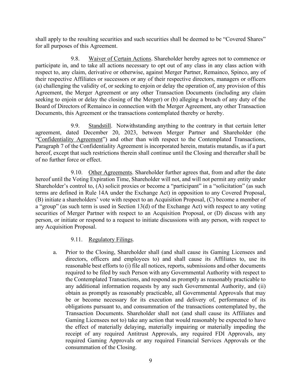 9 shall apply to the resulting securities and such securities shall be deemed to be “Covered Shares” for all purposes of this Agreement. 9.8. Waiver of Certain Actions. Shareholder hereby agrees not to commence or participate in, and to take all actions necessary to opt out of any class in any class action with respect to, any claim, derivative or otherwise, against Merger Partner, Remainco, Spinco, any of their respective Affiliates or successors or any of their respective directors, managers or officers (a) challenging the validity of, or seeking to enjoin or delay the operation of, any provision of this Agreement, the Merger Agreement or any other Transaction Documents (including any claim seeking to enjoin or delay the closing of the Merger) or (b) alleging a breach of any duty of the Board of Directors of Remainco in connection with the Merger Agreement, any other Transaction Documents, this Agreement or the transactions contemplated thereby or hereby. 9.9. Standstill. Notwithstanding anything to the contrary in that certain letter agreement, dated December 20, 2023, between Merger Partner and Shareholder (the “Confidentiality Agreement”) and other than with respect to the Contemplated Transactions, Paragraph 7 of the Confidentiality Agreement is incorporated herein, mutatis mutandis, as if a part hereof, except that such restrictions therein shall continue until the Closing and thereafter shall be of no further force or effect. 9.10. Other Agreements. Shareholder further agrees that, from and after the date hereof until the Voting Expiration Time, Shareholder will not, and will not permit any entity under Shareholder’s control to, (A) solicit proxies or become a “participant” in a “solicitation” (as such terms are defined in Rule 14A under the Exchange Act) in opposition to any Covered Proposal, (B) initiate a shareholders’ vote with respect to an Acquisition Proposal, (C) become a member of a “group” (as such term is used in Section 13(d) of the Exchange Act) with respect to any voting securities of Merger Partner with respect to an Acquisition Proposal, or (D) discuss with any person, or initiate or respond to a request to initiate discussions with any person, with respect to any Acquisition Proposal. 9.11. Regulatory Filings. a. Prior to the Closing, Shareholder shall (and shall cause its Gaming Licensees and directors, officers and employees to) and shall cause its Affiliates to, use its reasonable best efforts to (i) file all notices, reports, submissions and other documents required to be filed by such Person with any Governmental Authority with respect to the Contemplated Transactions, and respond as promptly as reasonably practicable to any additional information requests by any such Governmental Authority, and (ii) obtain as promptly as reasonably practicable, all Governmental Approvals that may be or become necessary for its execution and delivery of, performance of its obligations pursuant to, and consummation of the transactions contemplated by, the Transaction Documents. Shareholder shall not (and shall cause its Affiliates and Gaming Licensees not to) take any action that would reasonably be expected to have the effect of materially delaying, materially impairing or materially impeding the receipt of any required Antitrust Approvals, any required FDI Approvals, any required Gaming Approvals or any required Financial Services Approvals or the consummation of the Closing.