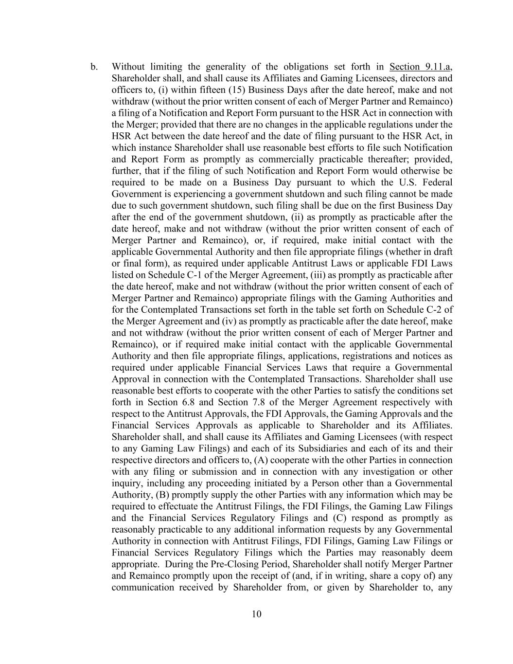10 b. Without limiting the generality of the obligations set forth in Section 9.11.a, Shareholder shall, and shall cause its Affiliates and Gaming Licensees, directors and officers to, (i) within fifteen (15) Business Days after the date hereof, make and not withdraw (without the prior written consent of each of Merger Partner and Remainco) a filing of a Notification and Report Form pursuant to the HSR Act in connection with the Merger; provided that there are no changes in the applicable regulations under the HSR Act between the date hereof and the date of filing pursuant to the HSR Act, in which instance Shareholder shall use reasonable best efforts to file such Notification and Report Form as promptly as commercially practicable thereafter; provided, further, that if the filing of such Notification and Report Form would otherwise be required to be made on a Business Day pursuant to which the U.S. Federal Government is experiencing a government shutdown and such filing cannot be made due to such government shutdown, such filing shall be due on the first Business Day after the end of the government shutdown, (ii) as promptly as practicable after the date hereof, make and not withdraw (without the prior written consent of each of Merger Partner and Remainco), or, if required, make initial contact with the applicable Governmental Authority and then file appropriate filings (whether in draft or final form), as required under applicable Antitrust Laws or applicable FDI Laws listed on Schedule C-1 of the Merger Agreement, (iii) as promptly as practicable after the date hereof, make and not withdraw (without the prior written consent of each of Merger Partner and Remainco) appropriate filings with the Gaming Authorities and for the Contemplated Transactions set forth in the table set forth on Schedule C-2 of the Merger Agreement and (iv) as promptly as practicable after the date hereof, make and not withdraw (without the prior written consent of each of Merger Partner and Remainco), or if required make initial contact with the applicable Governmental Authority and then file appropriate filings, applications, registrations and notices as required under applicable Financial Services Laws that require a Governmental Approval in connection with the Contemplated Transactions. Shareholder shall use reasonable best efforts to cooperate with the other Parties to satisfy the conditions set forth in Section 6.8 and Section 7.8 of the Merger Agreement respectively with respect to the Antitrust Approvals, the FDI Approvals, the Gaming Approvals and the Financial Services Approvals as applicable to Shareholder and its Affiliates. Shareholder shall, and shall cause its Affiliates and Gaming Licensees (with respect to any Gaming Law Filings) and each of its Subsidiaries and each of its and their respective directors and officers to, (A) cooperate with the other Parties in connection with any filing or submission and in connection with any investigation or other inquiry, including any proceeding initiated by a Person other than a Governmental Authority, (B) promptly supply the other Parties with any information which may be required to effectuate the Antitrust Filings, the FDI Filings, the Gaming Law Filings and the Financial Services Regulatory Filings and (C) respond as promptly as reasonably practicable to any additional information requests by any Governmental Authority in connection with Antitrust Filings, FDI Filings, Gaming Law Filings or Financial Services Regulatory Filings which the Parties may reasonably deem appropriate. During the Pre-Closing Period, Shareholder shall notify Merger Partner and Remainco promptly upon the receipt of (and, if in writing, share a copy of) any communication received by Shareholder from, or given by Shareholder to, any