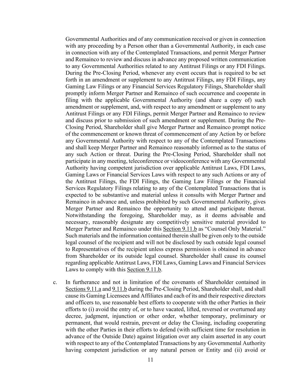 11 Governmental Authorities and of any communication received or given in connection with any proceeding by a Person other than a Governmental Authority, in each case in connection with any of the Contemplated Transactions, and permit Merger Partner and Remainco to review and discuss in advance any proposed written communication to any Governmental Authorities related to any Antitrust Filings or any FDI Filings. During the Pre-Closing Period, whenever any event occurs that is required to be set forth in an amendment or supplement to any Antitrust Filings, any FDI Filings, any Gaming Law Filings or any Financial Services Regulatory Filings, Shareholder shall promptly inform Merger Partner and Remainco of such occurrence and cooperate in filing with the applicable Governmental Authority (and share a copy of) such amendment or supplement, and, with respect to any amendment or supplement to any Antitrust Filings or any FDI Filings, permit Merger Partner and Remainco to review and discuss prior to submission of such amendment or supplement. During the Pre- Closing Period, Shareholder shall give Merger Partner and Remainco prompt notice of the commencement or known threat of commencement of any Action by or before any Governmental Authority with respect to any of the Contemplated Transactions and shall keep Merger Partner and Remainco reasonably informed as to the status of any such Action or threat. During the Pre-Closing Period, Shareholder shall not participate in any meeting, teleconference or videoconference with any Governmental Authority having competent jurisdiction over applicable Antitrust Laws, FDI Laws, Gaming Laws or Financial Services Laws with respect to any such Actions or any of the Antitrust Filings, the FDI Filings, the Gaming Law Filings or the Financial Services Regulatory Filings relating to any of the Contemplated Transactions that is expected to be substantive and material unless it consults with Merger Partner and Remainco in advance and, unless prohibited by such Governmental Authority, gives Merger Partner and Remainco the opportunity to attend and participate thereat. Notwithstanding the foregoing, Shareholder may, as it deems advisable and necessary, reasonably designate any competitively sensitive material provided to Merger Partner and Remainco under this Section 9.11.b as “Counsel Only Material.” Such materials and the information contained therein shall be given only to the outside legal counsel of the recipient and will not be disclosed by such outside legal counsel to Representatives of the recipient unless express permission is obtained in advance from Shareholder or its outside legal counsel. Shareholder shall cause its counsel regarding applicable Antitrust Laws, FDI Laws, Gaming Laws and Financial Services Laws to comply with this Section 9.11.b. c. In furtherance and not in limitation of the covenants of Shareholder contained in Sections 9.11.a and 9.11.b during the Pre-Closing Period, Shareholder shall, and shall cause its Gaming Licensees and Affiliates and each of its and their respective directors and officers to, use reasonable best efforts to cooperate with the other Parties in their efforts to (i) avoid the entry of, or to have vacated, lifted, reversed or overturned any decree, judgment, injunction or other order, whether temporary, preliminary or permanent, that would restrain, prevent or delay the Closing, including cooperating with the other Parties in their efforts to defend (with sufficient time for resolution in advance of the Outside Date) against litigation over any claim asserted in any court with respect to any of the Contemplated Transactions by any Governmental Authority having competent jurisdiction or any natural person or Entity and (ii) avoid or