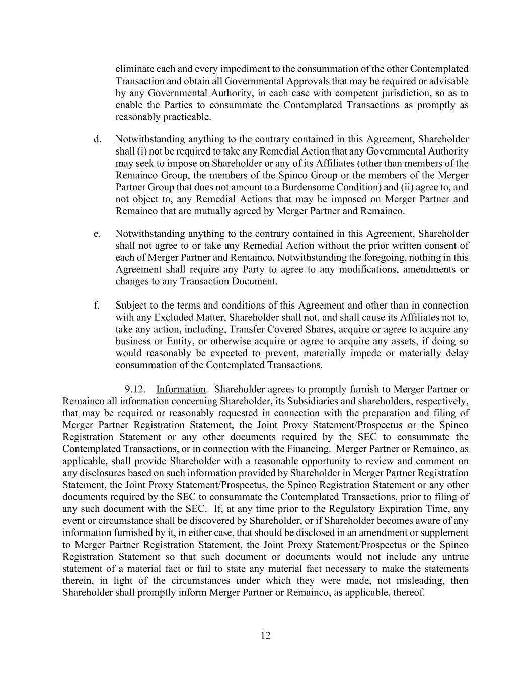 12 eliminate each and every impediment to the consummation of the other Contemplated Transaction and obtain all Governmental Approvals that may be required or advisable by any Governmental Authority, in each case with competent jurisdiction, so as to enable the Parties to consummate the Contemplated Transactions as promptly as reasonably practicable. d. Notwithstanding anything to the contrary contained in this Agreement, Shareholder shall (i) not be required to take any Remedial Action that any Governmental Authority may seek to impose on Shareholder or any of its Affiliates (other than members of the Remainco Group, the members of the Spinco Group or the members of the Merger Partner Group that does not amount to a Burdensome Condition) and (ii) agree to, and not object to, any Remedial Actions that may be imposed on Merger Partner and Remainco that are mutually agreed by Merger Partner and Remainco. e. Notwithstanding anything to the contrary contained in this Agreement, Shareholder shall not agree to or take any Remedial Action without the prior written consent of each of Merger Partner and Remainco. Notwithstanding the foregoing, nothing in this Agreement shall require any Party to agree to any modifications, amendments or changes to any Transaction Document. f. Subject to the terms and conditions of this Agreement and other than in connection with any Excluded Matter, Shareholder shall not, and shall cause its Affiliates not to, take any action, including, Transfer Covered Shares, acquire or agree to acquire any business or Entity, or otherwise acquire or agree to acquire any assets, if doing so would reasonably be expected to prevent, materially impede or materially delay consummation of the Contemplated Transactions. 9.12. Information. Shareholder agrees to promptly furnish to Merger Partner or Remainco all information concerning Shareholder, its Subsidiaries and shareholders, respectively, that may be required or reasonably requested in connection with the preparation and filing of Merger Partner Registration Statement, the Joint Proxy Statement/Prospectus or the Spinco Registration Statement or any other documents required by the SEC to consummate the Contemplated Transactions, or in connection with the Financing. Merger Partner or Remainco, as applicable, shall provide Shareholder with a reasonable opportunity to review and comment on any disclosures based on such information provided by Shareholder in Merger Partner Registration Statement, the Joint Proxy Statement/Prospectus, the Spinco Registration Statement or any other documents required by the SEC to consummate the Contemplated Transactions, prior to filing of any such document with the SEC. If, at any time prior to the Regulatory Expiration Time, any event or circumstance shall be discovered by Shareholder, or if Shareholder becomes aware of any information furnished by it, in either case, that should be disclosed in an amendment or supplement to Merger Partner Registration Statement, the Joint Proxy Statement/Prospectus or the Spinco Registration Statement so that such document or documents would not include any untrue statement of a material fact or fail to state any material fact necessary to make the statements therein, in light of the circumstances under which they were made, not misleading, then Shareholder shall promptly inform Merger Partner or Remainco, as applicable, thereof.