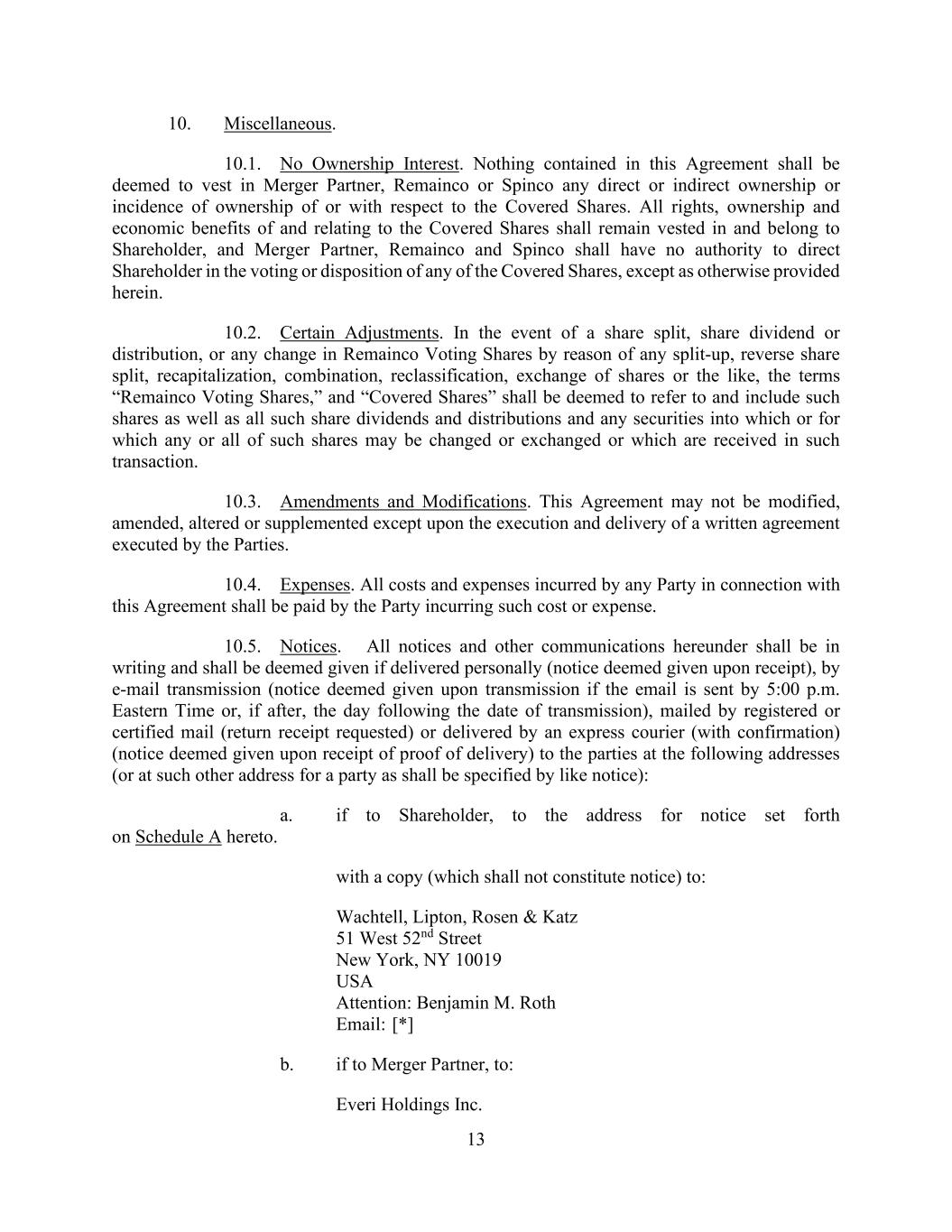 13 10. Miscellaneous. 10.1. No Ownership Interest. Nothing contained in this Agreement shall be deemed to vest in Merger Partner, Remainco or Spinco any direct or indirect ownership or incidence of ownership of or with respect to the Covered Shares. All rights, ownership and economic benefits of and relating to the Covered Shares shall remain vested in and belong to Shareholder, and Merger Partner, Remainco and Spinco shall have no authority to direct Shareholder in the voting or disposition of any of the Covered Shares, except as otherwise provided herein. 10.2. Certain Adjustments. In the event of a share split, share dividend or distribution, or any change in Remainco Voting Shares by reason of any split-up, reverse share split, recapitalization, combination, reclassification, exchange of shares or the like, the terms “Remainco Voting Shares,” and “Covered Shares” shall be deemed to refer to and include such shares as well as all such share dividends and distributions and any securities into which or for which any or all of such shares may be changed or exchanged or which are received in such transaction. 10.3. Amendments and Modifications. This Agreement may not be modified, amended, altered or supplemented except upon the execution and delivery of a written agreement executed by the Parties. 10.4. Expenses. All costs and expenses incurred by any Party in connection with this Agreement shall be paid by the Party incurring such cost or expense. 10.5. Notices. All notices and other communications hereunder shall be in writing and shall be deemed given if delivered personally (notice deemed given upon receipt), by e-mail transmission (notice deemed given upon transmission if the email is sent by 5:00 p.m. Eastern Time or, if after, the day following the date of transmission), mailed by registered or certified mail (return receipt requested) or delivered by an express courier (with confirmation) (notice deemed given upon receipt of proof of delivery) to the parties at the following addresses (or at such other address for a party as shall be specified by like notice): a. if to Shareholder, to the address for notice set forth on Schedule A hereto. with a copy (which shall not constitute notice) to: Wachtell, Lipton, Rosen & Katz 51 West 52nd Street New York, NY 10019 USA Attention: Benjamin M. Roth Email: [*] b. if to Merger Partner, to: Everi Holdings Inc.