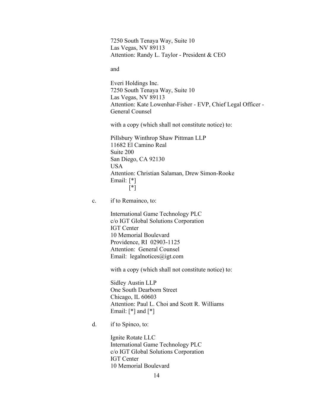14 7250 South Tenaya Way, Suite 10 Las Vegas, NV 89113 Attention: Randy L. Taylor - President & CEO and Everi Holdings Inc. 7250 South Tenaya Way, Suite 10 Las Vegas, NV 89113 Attention: Kate Lowenhar-Fisher - EVP, Chief Legal Officer - General Counsel with a copy (which shall not constitute notice) to: Pillsbury Winthrop Shaw Pittman LLP 11682 El Camino Real Suite 200 San Diego, CA 92130 USA Attention: Christian Salaman, Drew Simon-Rooke Email: [*] [*] c. if to Remainco, to: International Game Technology PLC c/o IGT Global Solutions Corporation IGT Center 10 Memorial Boulevard Providence, RI 02903-1125 Attention: General Counsel Email: legalnotices@igt.com with a copy (which shall not constitute notice) to: Sidley Austin LLP One South Dearborn Street Chicago, IL 60603 Attention: Paul L. Choi and Scott R. Williams Email: [*] and [*] d. if to Spinco, to: Ignite Rotate LLC International Game Technology PLC c/o IGT Global Solutions Corporation IGT Center 10 Memorial Boulevard