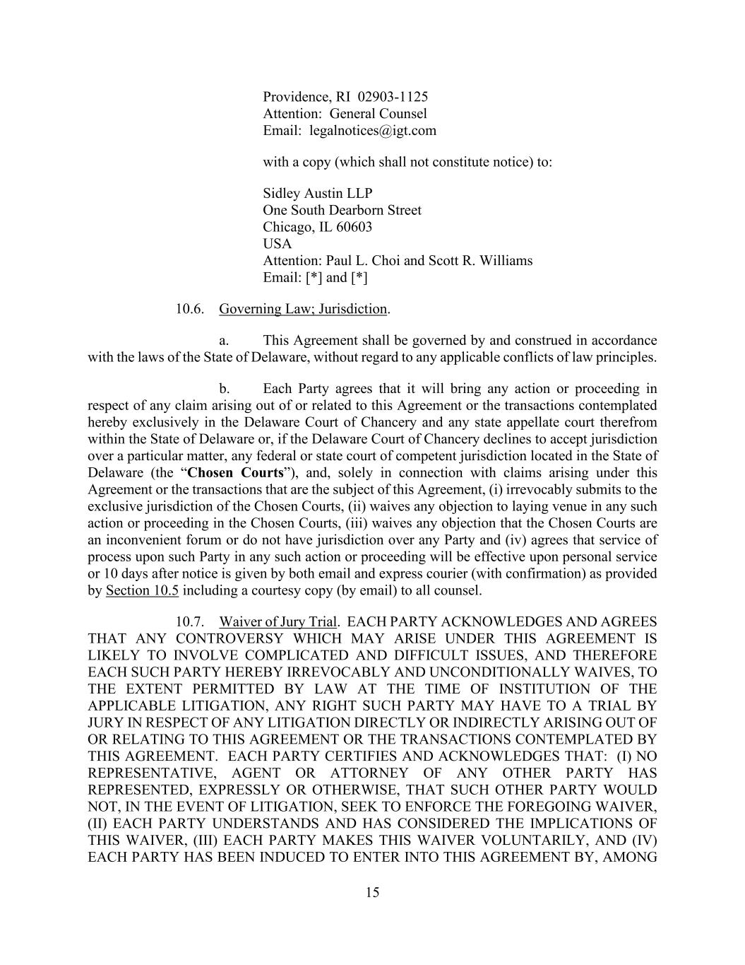 15 Providence, RI 02903-1125 Attention: General Counsel Email: legalnotices@igt.com with a copy (which shall not constitute notice) to: Sidley Austin LLP One South Dearborn Street Chicago, IL 60603 USA Attention: Paul L. Choi and Scott R. Williams Email: [*] and [*] 10.6. Governing Law; Jurisdiction. a. This Agreement shall be governed by and construed in accordance with the laws of the State of Delaware, without regard to any applicable conflicts of law principles. b. Each Party agrees that it will bring any action or proceeding in respect of any claim arising out of or related to this Agreement or the transactions contemplated hereby exclusively in the Delaware Court of Chancery and any state appellate court therefrom within the State of Delaware or, if the Delaware Court of Chancery declines to accept jurisdiction over a particular matter, any federal or state court of competent jurisdiction located in the State of Delaware (the “Chosen Courts”), and, solely in connection with claims arising under this Agreement or the transactions that are the subject of this Agreement, (i) irrevocably submits to the exclusive jurisdiction of the Chosen Courts, (ii) waives any objection to laying venue in any such action or proceeding in the Chosen Courts, (iii) waives any objection that the Chosen Courts are an inconvenient forum or do not have jurisdiction over any Party and (iv) agrees that service of process upon such Party in any such action or proceeding will be effective upon personal service or 10 days after notice is given by both email and express courier (with confirmation) as provided by Section 10.5 including a courtesy copy (by email) to all counsel. 10.7. Waiver of Jury Trial. EACH PARTY ACKNOWLEDGES AND AGREES THAT ANY CONTROVERSY WHICH MAY ARISE UNDER THIS AGREEMENT IS LIKELY TO INVOLVE COMPLICATED AND DIFFICULT ISSUES, AND THEREFORE EACH SUCH PARTY HEREBY IRREVOCABLY AND UNCONDITIONALLY WAIVES, TO THE EXTENT PERMITTED BY LAW AT THE TIME OF INSTITUTION OF THE APPLICABLE LITIGATION, ANY RIGHT SUCH PARTY MAY HAVE TO A TRIAL BY JURY IN RESPECT OF ANY LITIGATION DIRECTLY OR INDIRECTLY ARISING OUT OF OR RELATING TO THIS AGREEMENT OR THE TRANSACTIONS CONTEMPLATED BY THIS AGREEMENT. EACH PARTY CERTIFIES AND ACKNOWLEDGES THAT: (I) NO REPRESENTATIVE, AGENT OR ATTORNEY OF ANY OTHER PARTY HAS REPRESENTED, EXPRESSLY OR OTHERWISE, THAT SUCH OTHER PARTY WOULD NOT, IN THE EVENT OF LITIGATION, SEEK TO ENFORCE THE FOREGOING WAIVER, (II) EACH PARTY UNDERSTANDS AND HAS CONSIDERED THE IMPLICATIONS OF THIS WAIVER, (III) EACH PARTY MAKES THIS WAIVER VOLUNTARILY, AND (IV) EACH PARTY HAS BEEN INDUCED TO ENTER INTO THIS AGREEMENT BY, AMONG