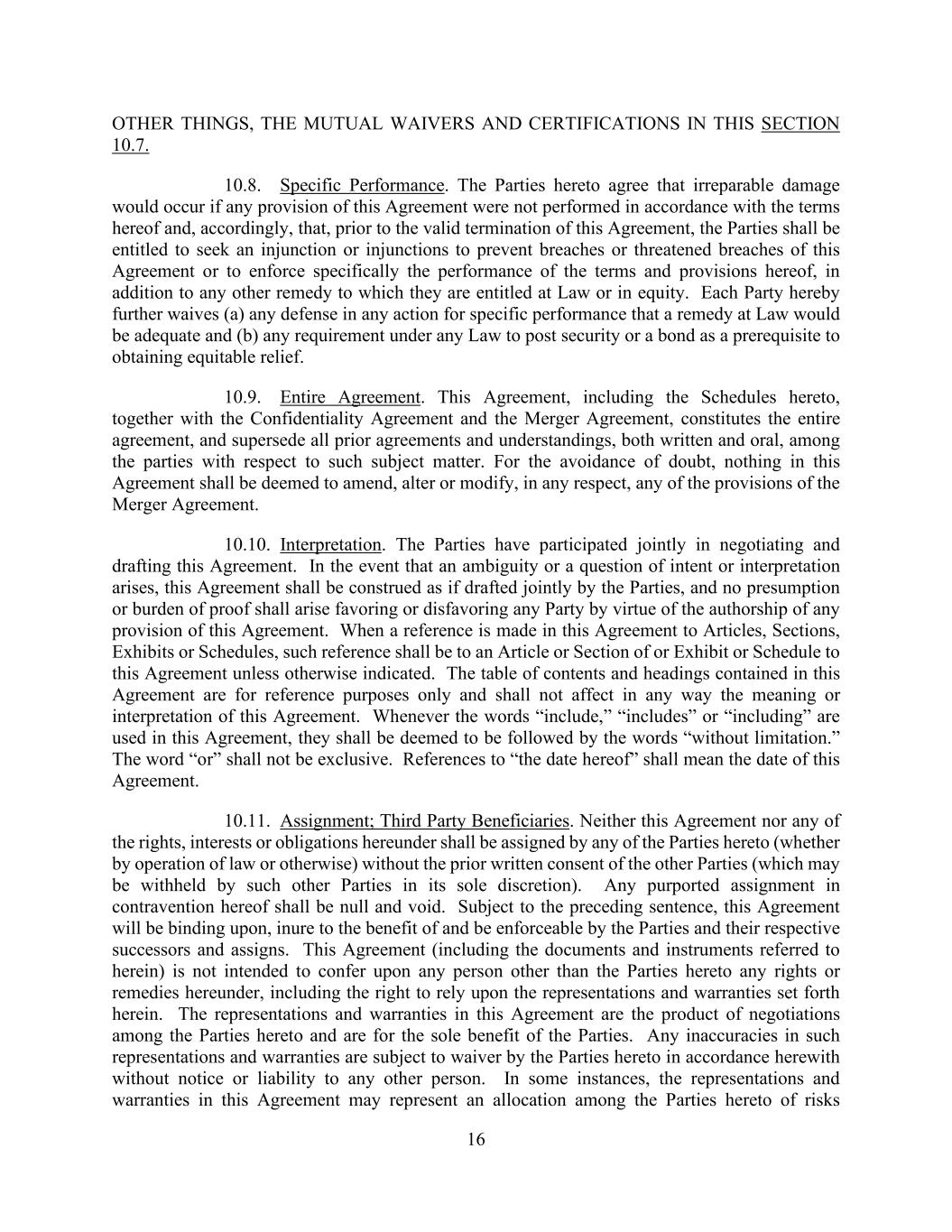 16 OTHER THINGS, THE MUTUAL WAIVERS AND CERTIFICATIONS IN THIS SECTION 10.7. 10.8. Specific Performance. The Parties hereto agree that irreparable damage would occur if any provision of this Agreement were not performed in accordance with the terms hereof and, accordingly, that, prior to the valid termination of this Agreement, the Parties shall be entitled to seek an injunction or injunctions to prevent breaches or threatened breaches of this Agreement or to enforce specifically the performance of the terms and provisions hereof, in addition to any other remedy to which they are entitled at Law or in equity. Each Party hereby further waives (a) any defense in any action for specific performance that a remedy at Law would be adequate and (b) any requirement under any Law to post security or a bond as a prerequisite to obtaining equitable relief. 10.9. Entire Agreement. This Agreement, including the Schedules hereto, together with the Confidentiality Agreement and the Merger Agreement, constitutes the entire agreement, and supersede all prior agreements and understandings, both written and oral, among the parties with respect to such subject matter. For the avoidance of doubt, nothing in this Agreement shall be deemed to amend, alter or modify, in any respect, any of the provisions of the Merger Agreement. 10.10. Interpretation. The Parties have participated jointly in negotiating and drafting this Agreement. In the event that an ambiguity or a question of intent or interpretation arises, this Agreement shall be construed as if drafted jointly by the Parties, and no presumption or burden of proof shall arise favoring or disfavoring any Party by virtue of the authorship of any provision of this Agreement. When a reference is made in this Agreement to Articles, Sections, Exhibits or Schedules, such reference shall be to an Article or Section of or Exhibit or Schedule to this Agreement unless otherwise indicated. The table of contents and headings contained in this Agreement are for reference purposes only and shall not affect in any way the meaning or interpretation of this Agreement. Whenever the words “include,” “includes” or “including” are used in this Agreement, they shall be deemed to be followed by the words “without limitation.” The word “or” shall not be exclusive. References to “the date hereof” shall mean the date of this Agreement. 10.11. Assignment; Third Party Beneficiaries. Neither this Agreement nor any of the rights, interests or obligations hereunder shall be assigned by any of the Parties hereto (whether by operation of law or otherwise) without the prior written consent of the other Parties (which may be withheld by such other Parties in its sole discretion). Any purported assignment in contravention hereof shall be null and void. Subject to the preceding sentence, this Agreement will be binding upon, inure to the benefit of and be enforceable by the Parties and their respective successors and assigns. This Agreement (including the documents and instruments referred to herein) is not intended to confer upon any person other than the Parties hereto any rights or remedies hereunder, including the right to rely upon the representations and warranties set forth herein. The representations and warranties in this Agreement are the product of negotiations among the Parties hereto and are for the sole benefit of the Parties. Any inaccuracies in such representations and warranties are subject to waiver by the Parties hereto in accordance herewith without notice or liability to any other person. In some instances, the representations and warranties in this Agreement may represent an allocation among the Parties hereto of risks
