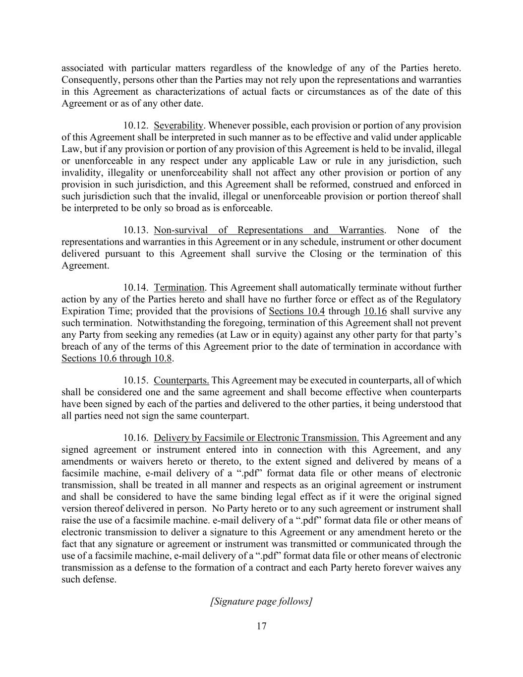 17 associated with particular matters regardless of the knowledge of any of the Parties hereto. Consequently, persons other than the Parties may not rely upon the representations and warranties in this Agreement as characterizations of actual facts or circumstances as of the date of this Agreement or as of any other date. 10.12. Severability. Whenever possible, each provision or portion of any provision of this Agreement shall be interpreted in such manner as to be effective and valid under applicable Law, but if any provision or portion of any provision of this Agreement is held to be invalid, illegal or unenforceable in any respect under any applicable Law or rule in any jurisdiction, such invalidity, illegality or unenforceability shall not affect any other provision or portion of any provision in such jurisdiction, and this Agreement shall be reformed, construed and enforced in such jurisdiction such that the invalid, illegal or unenforceable provision or portion thereof shall be interpreted to be only so broad as is enforceable. 10.13. Non-survival of Representations and Warranties. None of the representations and warranties in this Agreement or in any schedule, instrument or other document delivered pursuant to this Agreement shall survive the Closing or the termination of this Agreement. 10.14. Termination. This Agreement shall automatically terminate without further action by any of the Parties hereto and shall have no further force or effect as of the Regulatory Expiration Time; provided that the provisions of Sections 10.4 through 10.16 shall survive any such termination. Notwithstanding the foregoing, termination of this Agreement shall not prevent any Party from seeking any remedies (at Law or in equity) against any other party for that party’s breach of any of the terms of this Agreement prior to the date of termination in accordance with Sections 10.6 through 10.8. 10.15. Counterparts. This Agreement may be executed in counterparts, all of which shall be considered one and the same agreement and shall become effective when counterparts have been signed by each of the parties and delivered to the other parties, it being understood that all parties need not sign the same counterpart. 10.16. Delivery by Facsimile or Electronic Transmission. This Agreement and any signed agreement or instrument entered into in connection with this Agreement, and any amendments or waivers hereto or thereto, to the extent signed and delivered by means of a facsimile machine, e-mail delivery of a “.pdf” format data file or other means of electronic transmission, shall be treated in all manner and respects as an original agreement or instrument and shall be considered to have the same binding legal effect as if it were the original signed version thereof delivered in person. No Party hereto or to any such agreement or instrument shall raise the use of a facsimile machine. e-mail delivery of a “.pdf” format data file or other means of electronic transmission to deliver a signature to this Agreement or any amendment hereto or the fact that any signature or agreement or instrument was transmitted or communicated through the use of a facsimile machine, e-mail delivery of a “.pdf” format data file or other means of electronic transmission as a defense to the formation of a contract and each Party hereto forever waives any such defense. [Signature page follows]