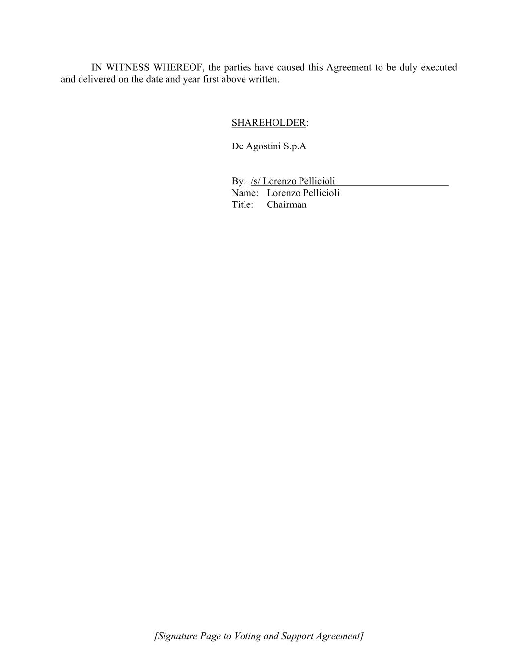 [Signature Page to Voting and Support Agreement] IN WITNESS WHEREOF, the parties have caused this Agreement to be duly executed and delivered on the date and year first above written. SHAREHOLDER: De Agostini S.p.A By: /s/ Lorenzo Pellicioli Name: Lorenzo Pellicioli Title: Chairman