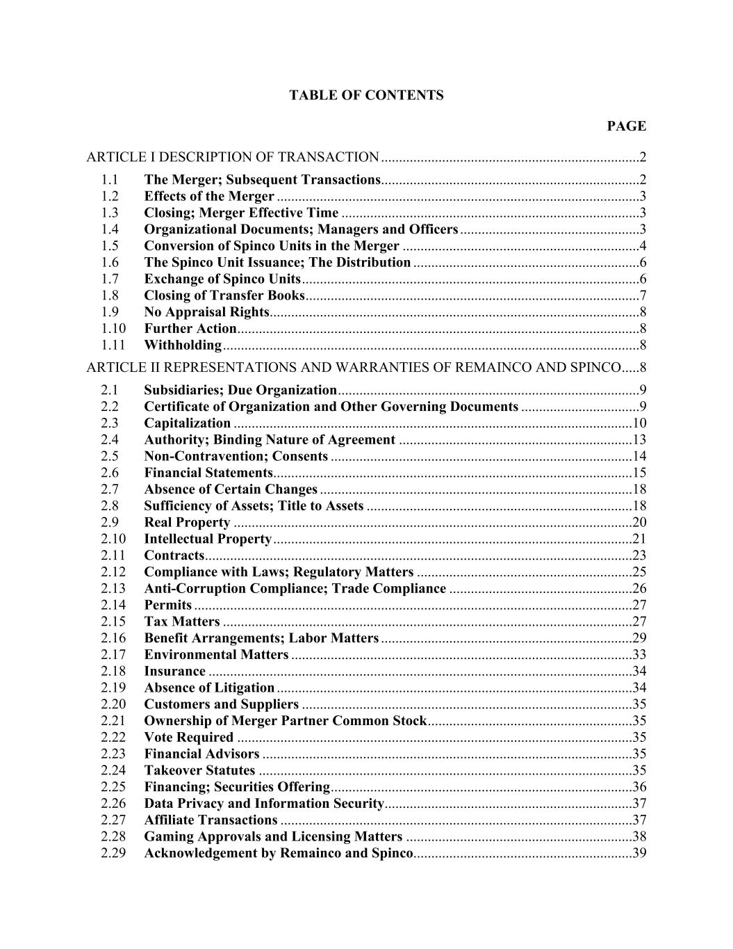 TABLE OF CONTENTS PAGE ARTICLE I DESCRIPTION OF TRANSACTION ........................................................................2 1.1 The Merger; Subsequent Transactions........................................................................2 1.2 Effects of the Merger .....................................................................................................3 1.3 Closing; Merger Effective Time ...................................................................................3 1.4 Organizational Documents; Managers and Officers ..................................................3 1.5 Conversion of Spinco Units in the Merger ..................................................................4 1.6 The Spinco Unit Issuance; The Distribution ...............................................................6 1.7 Exchange of Spinco Units ..............................................................................................6 1.8 Closing of Transfer Books .............................................................................................7 1.9 No Appraisal Rights .......................................................................................................8 1.10 Further Action ................................................................................................................8 1.11 Withholding ....................................................................................................................8 ARTICLE II REPRESENTATIONS AND WARRANTIES OF REMAINCO AND SPINCO .....8 2.1 Subsidiaries; Due Organization ....................................................................................9 2.2 Certificate of Organization and Other Governing Documents .................................9 2.3 Capitalization ...............................................................................................................10 2.4 Authority; Binding Nature of Agreement .................................................................13 2.5 Non-Contravention; Consents ....................................................................................14 2.6 Financial Statements ....................................................................................................15 2.7 Absence of Certain Changes .......................................................................................18 2.8 Sufficiency of Assets; Title to Assets ..........................................................................18 2.9 Real Property ...............................................................................................................20 2.10 Intellectual Property ....................................................................................................21 2.11 Contracts .......................................................................................................................23 2.12 Compliance with Laws; Regulatory Matters ............................................................25 2.13 Anti-Corruption Compliance; Trade Compliance ...................................................26 2.14 Permits ..........................................................................................................................27 2.15 Tax Matters ..................................................................................................................27 2.16 Benefit Arrangements; Labor Matters ......................................................................29 2.17 Environmental Matters ...............................................................................................33 2.18 Insurance ......................................................................................................................34 2.19 Absence of Litigation ...................................................................................................34 2.20 Customers and Suppliers ............................................................................................35 2.21 Ownership of Merger Partner Common Stock .........................................................35 2.22 Vote Required ..............................................................................................................35 2.23 Financial Advisors .......................................................................................................35 2.24 Takeover Statutes ........................................................................................................35 2.25 Financing; Securities Offering ....................................................................................36 2.26 Data Privacy and Information Security.....................................................................37 2.27 Affiliate Transactions ..................................................................................................37 2.28 Gaming Approvals and Licensing Matters ...............................................................38 2.29 Acknowledgement by Remainco and Spinco.............................................................39