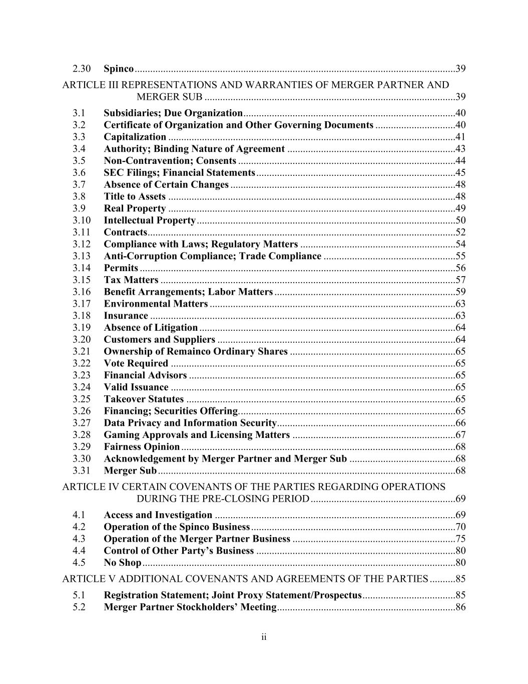 ii 2.30 Spinco ............................................................................................................................39 ARTICLE III REPRESENTATIONS AND WARRANTIES OF MERGER PARTNER AND MERGER SUB .................................................................................................39 3.1 Subsidiaries; Due Organization ..................................................................................40 3.2 Certificate of Organization and Other Governing Documents ...............................40 3.3 Capitalization ...............................................................................................................41 3.4 Authority; Binding Nature of Agreement .................................................................43 3.5 Non-Contravention; Consents ....................................................................................44 3.6 SEC Filings; Financial Statements .............................................................................45 3.7 Absence of Certain Changes .......................................................................................48 3.8 Title to Assets ...............................................................................................................48 3.9 Real Property ...............................................................................................................49 3.10 Intellectual Property ....................................................................................................50 3.11 Contracts .......................................................................................................................52 3.12 Compliance with Laws; Regulatory Matters ............................................................54 3.13 Anti-Corruption Compliance; Trade Compliance ...................................................55 3.14 Permits ..........................................................................................................................56 3.15 Tax Matters ..................................................................................................................57 3.16 Benefit Arrangements; Labor Matters ......................................................................59 3.17 Environmental Matters ...............................................................................................63 3.18 Insurance ......................................................................................................................63 3.19 Absence of Litigation ...................................................................................................64 3.20 Customers and Suppliers ............................................................................................64 3.21 Ownership of Remainco Ordinary Shares ................................................................65 3.22 Vote Required ..............................................................................................................65 3.23 Financial Advisors .......................................................................................................65 3.24 Valid Issuance ..............................................................................................................65 3.25 Takeover Statutes ........................................................................................................65 3.26 Financing; Securities Offering. ...................................................................................65 3.27 Data Privacy and Information Security.....................................................................66 3.28 Gaming Approvals and Licensing Matters ...............................................................67 3.29 Fairness Opinion ..........................................................................................................68 3.30 Acknowledgement by Merger Partner and Merger Sub .........................................68 3.31 Merger Sub ...................................................................................................................68 ARTICLE IV CERTAIN COVENANTS OF THE PARTIES REGARDING OPERATIONS DURING THE PRE-CLOSING PERIOD ........................................................69 4.1 Access and Investigation .............................................................................................69 4.2 Operation of the Spinco Business ...............................................................................70 4.3 Operation of the Merger Partner Business ...............................................................75 4.4 Control of Other Party’s Business .............................................................................80 4.5 No Shop .........................................................................................................................80 ARTICLE V ADDITIONAL COVENANTS AND AGREEMENTS OF THE PARTIES ..........85 5.1 Registration Statement; Joint Proxy Statement/Prospectus ....................................85 5.2 Merger Partner Stockholders’ Meeting .....................................................................86