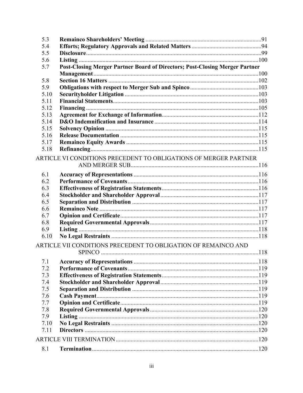 iii 5.3 Remainco Shareholders’ Meeting ..............................................................................91 5.4 Efforts; Regulatory Approvals and Related Matters ...............................................94 5.5 Disclosure ......................................................................................................................99 5.6 Listing .........................................................................................................................100 5.7 Post-Closing Merger Partner Board of Directors; Post-Closing Merger Partner Management ...............................................................................................................100 5.8 Section 16 Matters .....................................................................................................102 5.9 Obligations with respect to Merger Sub and Spinco ..............................................103 5.10 Securityholder Litigation ..........................................................................................103 5.11 Financial Statements ..................................................................................................103 5.12 Financing ....................................................................................................................105 5.13 Agreement for Exchange of Information .................................................................112 5.14 D&O Indemnification and Insurance ......................................................................114 5.15 Solvency Opinion .......................................................................................................115 5.16 Release Documentation .............................................................................................115 5.17 Remainco Equity Awards .........................................................................................115 5.18 Refinancing .................................................................................................................115 ARTICLE VI CONDITIONS PRECEDENT TO OBLIGATIONS OF MERGER PARTNER AND MERGER SUB ......................................................................................116 6.1 Accuracy of Representations ....................................................................................116 6.2 Performance of Covenants ........................................................................................116 6.3 Effectiveness of Registration Statements .................................................................116 6.4 Stockholder and Shareholder Approval ..................................................................117 6.5 Separation and Distribution .....................................................................................117 6.6 Remainco Note ...........................................................................................................117 6.7 Opinion and Certificate .............................................................................................117 6.8 Required Governmental Approvals .........................................................................117 6.9 Listing .........................................................................................................................118 6.10 No Legal Restraints ...................................................................................................118 ARTICLE VII CONDITIONS PRECEDENT TO OBLIGATION OF REMAINCO AND SPINCO ..........................................................................................................118 7.1 Accuracy of Representations ....................................................................................118 7.2 Performance of Covenants ........................................................................................119 7.3 Effectiveness of Registration Statements .................................................................119 7.4 Stockholder and Shareholder Approval ..................................................................119 7.5 Separation and Distribution .....................................................................................119 7.6 Cash Payment .............................................................................................................119 7.7 Opinion and Certificate .............................................................................................119 7.8 Required Governmental Approvals .........................................................................120 7.9 Listing .........................................................................................................................120 7.10 No Legal Restraints ...................................................................................................120 7.11 Directors .....................................................................................................................120 ARTICLE VIII TERMINATION ................................................................................................120 8.1 Termination ................................................................................................................120