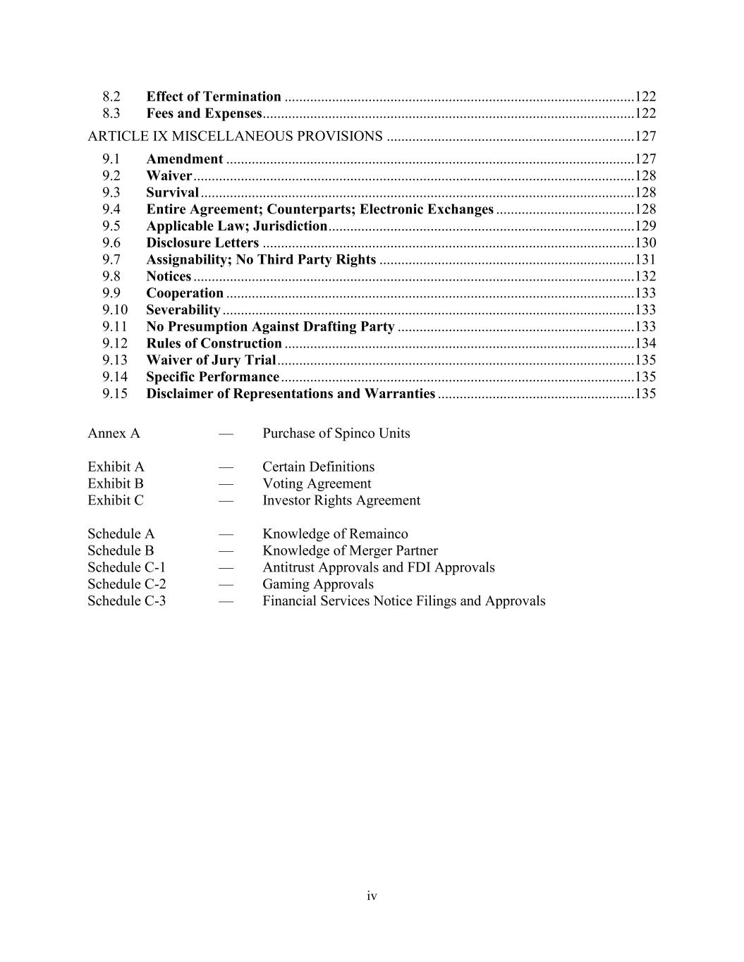 iv 8.2 Effect of Termination ................................................................................................122 8.3 Fees and Expenses ......................................................................................................122 ARTICLE IX MISCELLANEOUS PROVISIONS ....................................................................127 9.1 Amendment ................................................................................................................127 9.2 Waiver .........................................................................................................................128 9.3 Survival .......................................................................................................................128 9.4 Entire Agreement; Counterparts; Electronic Exchanges ......................................128 9.5 Applicable Law; Jurisdiction ....................................................................................129 9.6 Disclosure Letters ......................................................................................................130 9.7 Assignability; No Third Party Rights ......................................................................131 9.8 Notices .........................................................................................................................132 9.9 Cooperation ................................................................................................................133 9.10 Severability .................................................................................................................133 9.11 No Presumption Against Drafting Party .................................................................133 9.12 Rules of Construction ................................................................................................134 9.13 Waiver of Jury Trial ..................................................................................................135 9.14 Specific Performance .................................................................................................135 9.15 Disclaimer of Representations and Warranties ......................................................135 Annex A — Purchase of Spinco Units Exhibit A — Certain Definitions Exhibit B — Voting Agreement Exhibit C — Investor Rights Agreement Schedule A — Knowledge of Remainco Schedule B — Knowledge of Merger Partner Schedule C-1 — Antitrust Approvals and FDI Approvals Schedule C-2 — Gaming Approvals Schedule C-3 — Financial Services Notice Filings and Approvals