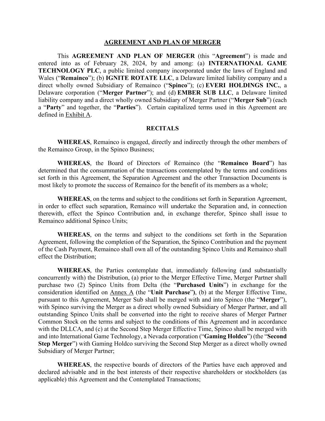 AGREEMENT AND PLAN OF MERGER This AGREEMENT AND PLAN OF MERGER (this “Agreement”) is made and entered into as of February 28, 2024, by and among: (a) INTERNATIONAL GAME TECHNOLOGY PLC, a public limited company incorporated under the laws of England and Wales (“Remainco”); (b) IGNITE ROTATE LLC, a Delaware limited liability company and a direct wholly owned Subsidiary of Remainco (“Spinco”); (c) EVERI HOLDINGS INC., a Delaware corporation (“Merger Partner”); and (d) EMBER SUB LLC, a Delaware limited liability company and a direct wholly owned Subsidiary of Merger Partner (“Merger Sub”) (each a “Party” and together, the “Parties”). Certain capitalized terms used in this Agreement are defined in Exhibit A. RECITALS WHEREAS, Remainco is engaged, directly and indirectly through the other members of the Remainco Group, in the Spinco Business; WHEREAS, the Board of Directors of Remainco (the “Remainco Board”) has determined that the consummation of the transactions contemplated by the terms and conditions set forth in this Agreement, the Separation Agreement and the other Transaction Documents is most likely to promote the success of Remainco for the benefit of its members as a whole; WHEREAS, on the terms and subject to the conditions set forth in Separation Agreement, in order to effect such separation, Remainco will undertake the Separation and, in connection therewith, effect the Spinco Contribution and, in exchange therefor, Spinco shall issue to Remainco additional Spinco Units; WHEREAS, on the terms and subject to the conditions set forth in the Separation Agreement, following the completion of the Separation, the Spinco Contribution and the payment of the Cash Payment, Remainco shall own all of the outstanding Spinco Units and Remainco shall effect the Distribution; WHEREAS, the Parties contemplate that, immediately following (and substantially concurrently with) the Distribution, (a) prior to the Merger Effective Time, Merger Partner shall purchase two (2) Spinco Units from Delta (the “Purchased Units”) in exchange for the consideration identified on Annex A (the “Unit Purchase”), (b) at the Merger Effective Time, pursuant to this Agreement, Merger Sub shall be merged with and into Spinco (the “Merger”), with Spinco surviving the Merger as a direct wholly owned Subsidiary of Merger Partner, and all outstanding Spinco Units shall be converted into the right to receive shares of Merger Partner Common Stock on the terms and subject to the conditions of this Agreement and in accordance with the DLLCA, and (c) at the Second Step Merger Effective Time, Spinco shall be merged with and into International Game Technology, a Nevada corporation (“Gaming Holdco”) (the “Second Step Merger”) with Gaming Holdco surviving the Second Step Merger as a direct wholly owned Subsidiary of Merger Partner; WHEREAS, the respective boards of directors of the Parties have each approved and declared advisable and in the best interests of their respective shareholders or stockholders (as applicable) this Agreement and the Contemplated Transactions;