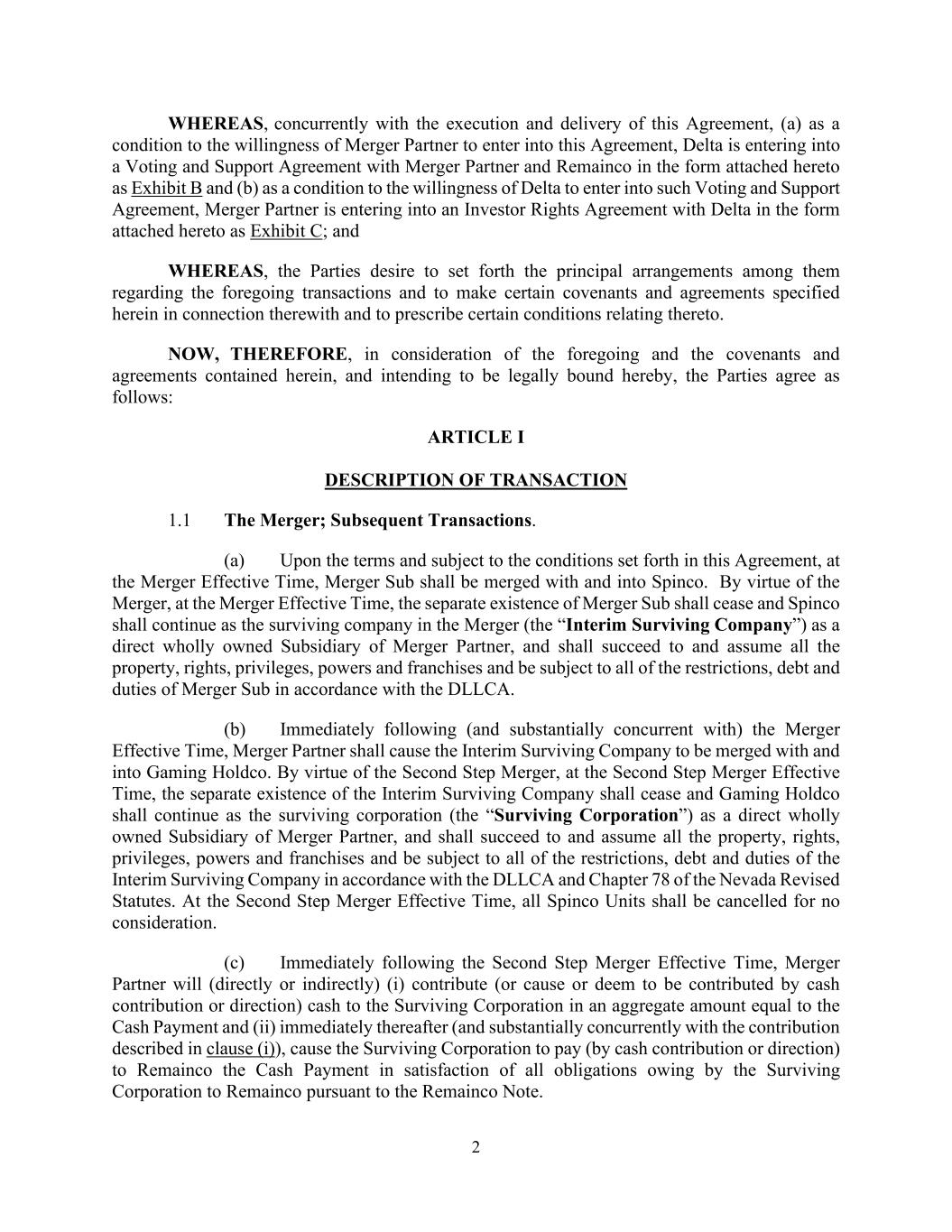 2 WHEREAS, concurrently with the execution and delivery of this Agreement, (a) as a condition to the willingness of Merger Partner to enter into this Agreement, Delta is entering into a Voting and Support Agreement with Merger Partner and Remainco in the form attached hereto as Exhibit B and (b) as a condition to the willingness of Delta to enter into such Voting and Support Agreement, Merger Partner is entering into an Investor Rights Agreement with Delta in the form attached hereto as Exhibit C; and WHEREAS, the Parties desire to set forth the principal arrangements among them regarding the foregoing transactions and to make certain covenants and agreements specified herein in connection therewith and to prescribe certain conditions relating thereto. NOW, THEREFORE, in consideration of the foregoing and the covenants and agreements contained herein, and intending to be legally bound hereby, the Parties agree as follows: ARTICLE I DESCRIPTION OF TRANSACTION 1.1 The Merger; Subsequent Transactions. (a) Upon the terms and subject to the conditions set forth in this Agreement, at the Merger Effective Time, Merger Sub shall be merged with and into Spinco. By virtue of the Merger, at the Merger Effective Time, the separate existence of Merger Sub shall cease and Spinco shall continue as the surviving company in the Merger (the “Interim Surviving Company”) as a direct wholly owned Subsidiary of Merger Partner, and shall succeed to and assume all the property, rights, privileges, powers and franchises and be subject to all of the restrictions, debt and duties of Merger Sub in accordance with the DLLCA. (b) Immediately following (and substantially concurrent with) the Merger Effective Time, Merger Partner shall cause the Interim Surviving Company to be merged with and into Gaming Holdco. By virtue of the Second Step Merger, at the Second Step Merger Effective Time, the separate existence of the Interim Surviving Company shall cease and Gaming Holdco shall continue as the surviving corporation (the “Surviving Corporation”) as a direct wholly owned Subsidiary of Merger Partner, and shall succeed to and assume all the property, rights, privileges, powers and franchises and be subject to all of the restrictions, debt and duties of the Interim Surviving Company in accordance with the DLLCA and Chapter 78 of the Nevada Revised Statutes. At the Second Step Merger Effective Time, all Spinco Units shall be cancelled for no consideration. (c) Immediately following the Second Step Merger Effective Time, Merger Partner will (directly or indirectly) (i) contribute (or cause or deem to be contributed by cash contribution or direction) cash to the Surviving Corporation in an aggregate amount equal to the Cash Payment and (ii) immediately thereafter (and substantially concurrently with the contribution described in clause (i)), cause the Surviving Corporation to pay (by cash contribution or direction) to Remainco the Cash Payment in satisfaction of all obligations owing by the Surviving Corporation to Remainco pursuant to the Remainco Note.