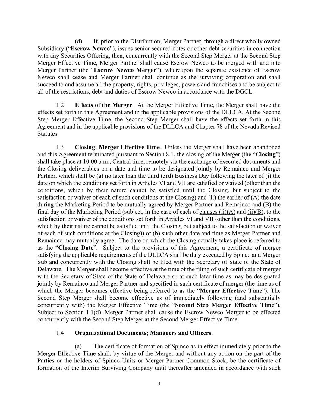 3 (d) If, prior to the Distribution, Merger Partner, through a direct wholly owned Subsidiary (“Escrow Newco”), issues senior secured notes or other debt securities in connection with any Securities Offering, then, concurrently with the Second Step Merger at the Second Step Merger Effective Time, Merger Partner shall cause Escrow Newco to be merged with and into Merger Partner (the “Escrow Newco Merger”), whereupon the separate existence of Escrow Newco shall cease and Merger Partner shall continue as the surviving corporation and shall succeed to and assume all the property, rights, privileges, powers and franchises and be subject to all of the restrictions, debt and duties of Escrow Newco in accordance with the DGCL. 1.2 Effects of the Merger. At the Merger Effective Time, the Merger shall have the effects set forth in this Agreement and in the applicable provisions of the DLLCA. At the Second Step Merger Effective Time, the Second Step Merger shall have the effects set forth in this Agreement and in the applicable provisions of the DLLCA and Chapter 78 of the Nevada Revised Statutes. 1.3 Closing; Merger Effective Time. Unless the Merger shall have been abandoned and this Agreement terminated pursuant to Section 8.1, the closing of the Merger (the “Closing”) shall take place at 10:00 a.m., Central time, remotely via the exchange of executed documents and the Closing deliverables on a date and time to be designated jointly by Remainco and Merger Partner, which shall be (a) no later than the third (3rd) Business Day following the later of (i) the date on which the conditions set forth in Articles VI and VII are satisfied or waived (other than the conditions, which by their nature cannot be satisfied until the Closing, but subject to the satisfaction or waiver of each of such conditions at the Closing) and (ii) the earlier of (A) the date during the Marketing Period to be mutually agreed by Merger Partner and Remainco and (B) the final day of the Marketing Period (subject, in the case of each of clauses (ii)(A) and (ii)(B), to the satisfaction or waiver of the conditions set forth in Articles VI and VII (other than the conditions, which by their nature cannot be satisfied until the Closing, but subject to the satisfaction or waiver of each of such conditions at the Closing)) or (b) such other date and time as Merger Partner and Remainco may mutually agree. The date on which the Closing actually takes place is referred to as the “Closing Date”. Subject to the provisions of this Agreement, a certificate of merger satisfying the applicable requirements of the DLLCA shall be duly executed by Spinco and Merger Sub and concurrently with the Closing shall be filed with the Secretary of State of the State of Delaware. The Merger shall become effective at the time of the filing of such certificate of merger with the Secretary of State of the State of Delaware or at such later time as may be designated jointly by Remainco and Merger Partner and specified in such certificate of merger (the time as of which the Merger becomes effective being referred to as the “Merger Effective Time”). The Second Step Merger shall become effective as of immediately following (and substantially concurrently with) the Merger Effective Time (the “Second Step Merger Effective Time”). Subject to Section 1.1(d), Merger Partner shall cause the Escrow Newco Merger to be effected concurrently with the Second Step Merger at the Second Merger Effective Time. 1.4 Organizational Documents; Managers and Officers. (a) The certificate of formation of Spinco as in effect immediately prior to the Merger Effective Time shall, by virtue of the Merger and without any action on the part of the Parties or the holders of Spinco Units or Merger Partner Common Stock, be the certificate of formation of the Interim Surviving Company until thereafter amended in accordance with such