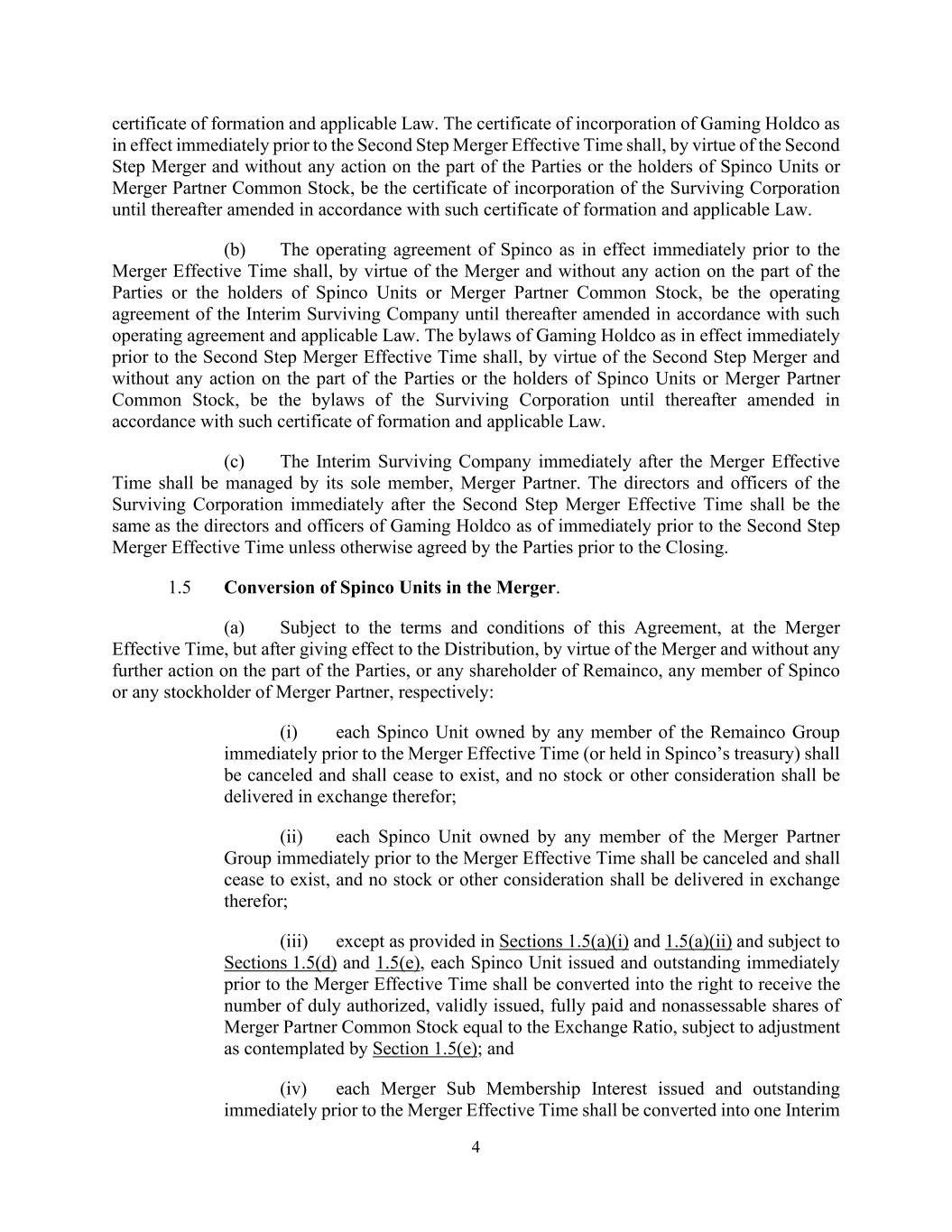 4 certificate of formation and applicable Law. The certificate of incorporation of Gaming Holdco as in effect immediately prior to the Second Step Merger Effective Time shall, by virtue of the Second Step Merger and without any action on the part of the Parties or the holders of Spinco Units or Merger Partner Common Stock, be the certificate of incorporation of the Surviving Corporation until thereafter amended in accordance with such certificate of formation and applicable Law. (b) The operating agreement of Spinco as in effect immediately prior to the Merger Effective Time shall, by virtue of the Merger and without any action on the part of the Parties or the holders of Spinco Units or Merger Partner Common Stock, be the operating agreement of the Interim Surviving Company until thereafter amended in accordance with such operating agreement and applicable Law. The bylaws of Gaming Holdco as in effect immediately prior to the Second Step Merger Effective Time shall, by virtue of the Second Step Merger and without any action on the part of the Parties or the holders of Spinco Units or Merger Partner Common Stock, be the bylaws of the Surviving Corporation until thereafter amended in accordance with such certificate of formation and applicable Law. (c) The Interim Surviving Company immediately after the Merger Effective Time shall be managed by its sole member, Merger Partner. The directors and officers of the Surviving Corporation immediately after the Second Step Merger Effective Time shall be the same as the directors and officers of Gaming Holdco as of immediately prior to the Second Step Merger Effective Time unless otherwise agreed by the Parties prior to the Closing. 1.5 Conversion of Spinco Units in the Merger. (a) Subject to the terms and conditions of this Agreement, at the Merger Effective Time, but after giving effect to the Distribution, by virtue of the Merger and without any further action on the part of the Parties, or any shareholder of Remainco, any member of Spinco or any stockholder of Merger Partner, respectively: (i) each Spinco Unit owned by any member of the Remainco Group immediately prior to the Merger Effective Time (or held in Spinco’s treasury) shall be canceled and shall cease to exist, and no stock or other consideration shall be delivered in exchange therefor; (ii) each Spinco Unit owned by any member of the Merger Partner Group immediately prior to the Merger Effective Time shall be canceled and shall cease to exist, and no stock or other consideration shall be delivered in exchange therefor; (iii) except as provided in Sections 1.5(a)(i) and 1.5(a)(ii) and subject to Sections 1.5(d) and 1.5(e), each Spinco Unit issued and outstanding immediately prior to the Merger Effective Time shall be converted into the right to receive the number of duly authorized, validly issued, fully paid and nonassessable shares of Merger Partner Common Stock equal to the Exchange Ratio, subject to adjustment as contemplated by Section 1.5(e); and (iv) each Merger Sub Membership Interest issued and outstanding immediately prior to the Merger Effective Time shall be converted into one Interim