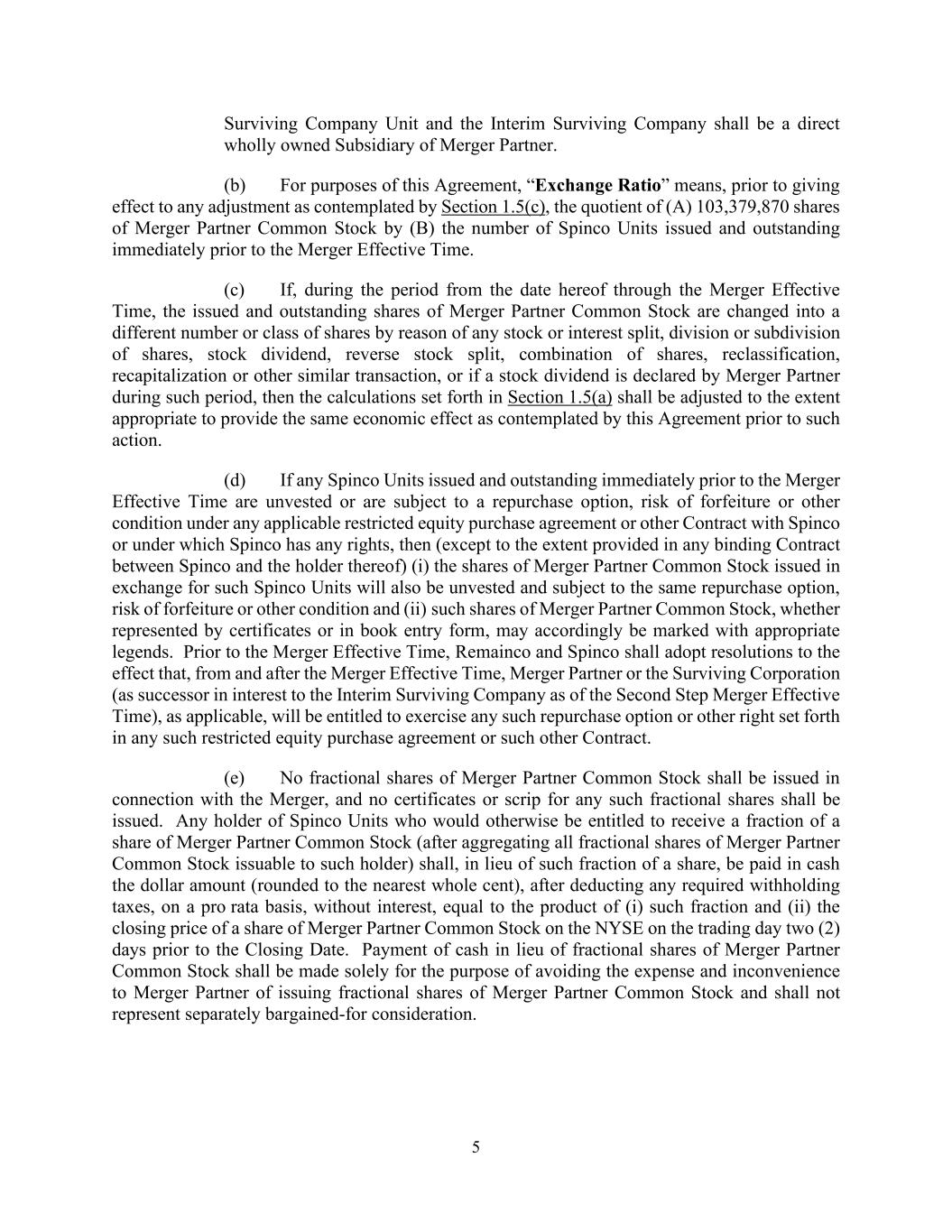 5 Surviving Company Unit and the Interim Surviving Company shall be a direct wholly owned Subsidiary of Merger Partner. (b) For purposes of this Agreement, “Exchange Ratio” means, prior to giving effect to any adjustment as contemplated by Section 1.5(c), the quotient of (A) 103,379,870 shares of Merger Partner Common Stock by (B) the number of Spinco Units issued and outstanding immediately prior to the Merger Effective Time. (c) If, during the period from the date hereof through the Merger Effective Time, the issued and outstanding shares of Merger Partner Common Stock are changed into a different number or class of shares by reason of any stock or interest split, division or subdivision of shares, stock dividend, reverse stock split, combination of shares, reclassification, recapitalization or other similar transaction, or if a stock dividend is declared by Merger Partner during such period, then the calculations set forth in Section 1.5(a) shall be adjusted to the extent appropriate to provide the same economic effect as contemplated by this Agreement prior to such action. (d) If any Spinco Units issued and outstanding immediately prior to the Merger Effective Time are unvested or are subject to a repurchase option, risk of forfeiture or other condition under any applicable restricted equity purchase agreement or other Contract with Spinco or under which Spinco has any rights, then (except to the extent provided in any binding Contract between Spinco and the holder thereof) (i) the shares of Merger Partner Common Stock issued in exchange for such Spinco Units will also be unvested and subject to the same repurchase option, risk of forfeiture or other condition and (ii) such shares of Merger Partner Common Stock, whether represented by certificates or in book entry form, may accordingly be marked with appropriate legends. Prior to the Merger Effective Time, Remainco and Spinco shall adopt resolutions to the effect that, from and after the Merger Effective Time, Merger Partner or the Surviving Corporation (as successor in interest to the Interim Surviving Company as of the Second Step Merger Effective Time), as applicable, will be entitled to exercise any such repurchase option or other right set forth in any such restricted equity purchase agreement or such other Contract. (e) No fractional shares of Merger Partner Common Stock shall be issued in connection with the Merger, and no certificates or scrip for any such fractional shares shall be issued. Any holder of Spinco Units who would otherwise be entitled to receive a fraction of a share of Merger Partner Common Stock (after aggregating all fractional shares of Merger Partner Common Stock issuable to such holder) shall, in lieu of such fraction of a share, be paid in cash the dollar amount (rounded to the nearest whole cent), after deducting any required withholding taxes, on a pro rata basis, without interest, equal to the product of (i) such fraction and (ii) the closing price of a share of Merger Partner Common Stock on the NYSE on the trading day two (2) days prior to the Closing Date. Payment of cash in lieu of fractional shares of Merger Partner Common Stock shall be made solely for the purpose of avoiding the expense and inconvenience to Merger Partner of issuing fractional shares of Merger Partner Common Stock and shall not represent separately bargained-for consideration.