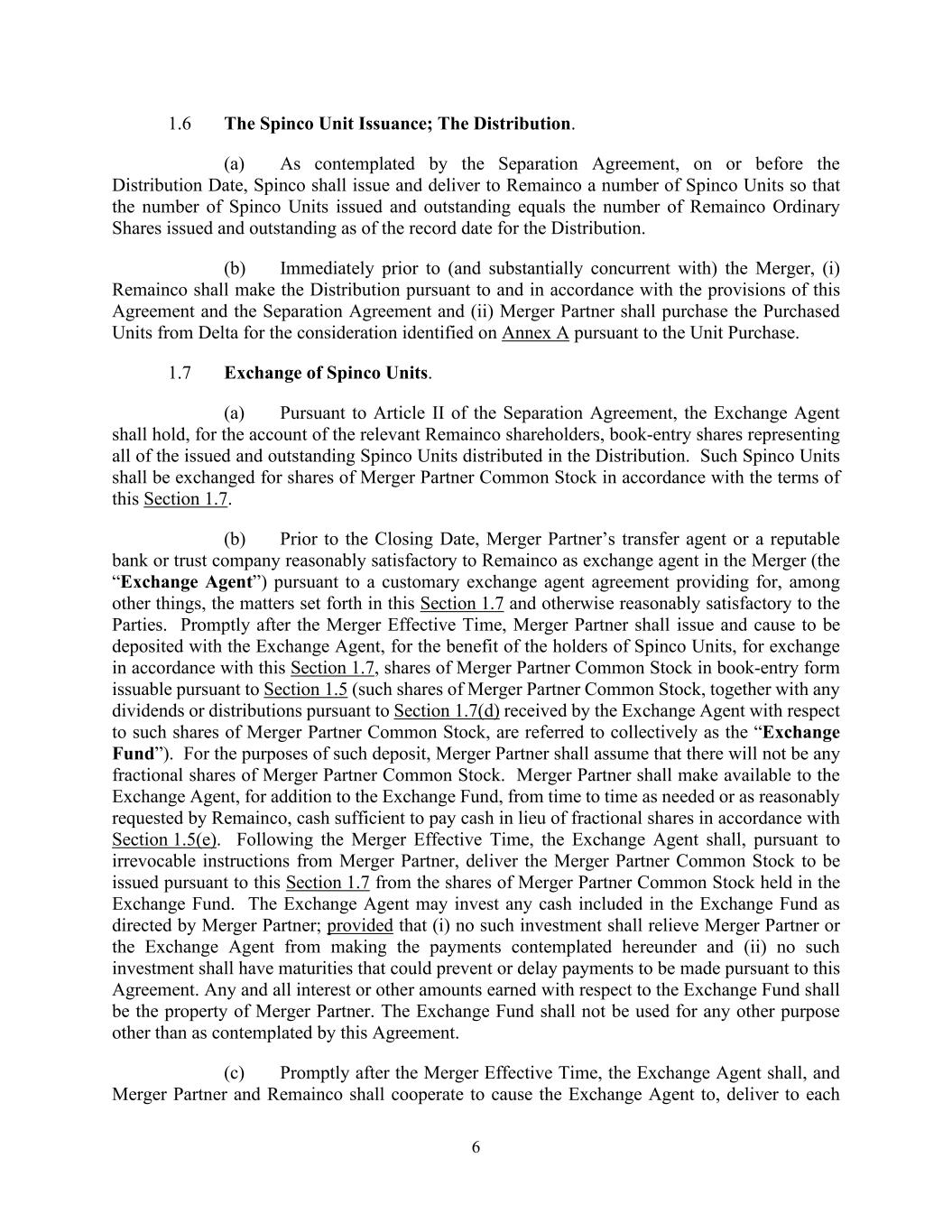 6 1.6 The Spinco Unit Issuance; The Distribution. (a) As contemplated by the Separation Agreement, on or before the Distribution Date, Spinco shall issue and deliver to Remainco a number of Spinco Units so that the number of Spinco Units issued and outstanding equals the number of Remainco Ordinary Shares issued and outstanding as of the record date for the Distribution. (b) Immediately prior to (and substantially concurrent with) the Merger, (i) Remainco shall make the Distribution pursuant to and in accordance with the provisions of this Agreement and the Separation Agreement and (ii) Merger Partner shall purchase the Purchased Units from Delta for the consideration identified on Annex A pursuant to the Unit Purchase. 1.7 Exchange of Spinco Units. (a) Pursuant to Article II of the Separation Agreement, the Exchange Agent shall hold, for the account of the relevant Remainco shareholders, book-entry shares representing all of the issued and outstanding Spinco Units distributed in the Distribution. Such Spinco Units shall be exchanged for shares of Merger Partner Common Stock in accordance with the terms of this Section 1.7. (b) Prior to the Closing Date, Merger Partner’s transfer agent or a reputable bank or trust company reasonably satisfactory to Remainco as exchange agent in the Merger (the “Exchange Agent”) pursuant to a customary exchange agent agreement providing for, among other things, the matters set forth in this Section 1.7 and otherwise reasonably satisfactory to the Parties. Promptly after the Merger Effective Time, Merger Partner shall issue and cause to be deposited with the Exchange Agent, for the benefit of the holders of Spinco Units, for exchange in accordance with this Section 1.7, shares of Merger Partner Common Stock in book-entry form issuable pursuant to Section 1.5 (such shares of Merger Partner Common Stock, together with any dividends or distributions pursuant to Section 1.7(d) received by the Exchange Agent with respect to such shares of Merger Partner Common Stock, are referred to collectively as the “Exchange Fund”). For the purposes of such deposit, Merger Partner shall assume that there will not be any fractional shares of Merger Partner Common Stock. Merger Partner shall make available to the Exchange Agent, for addition to the Exchange Fund, from time to time as needed or as reasonably requested by Remainco, cash sufficient to pay cash in lieu of fractional shares in accordance with Section 1.5(e). Following the Merger Effective Time, the Exchange Agent shall, pursuant to irrevocable instructions from Merger Partner, deliver the Merger Partner Common Stock to be issued pursuant to this Section 1.7 from the shares of Merger Partner Common Stock held in the Exchange Fund. The Exchange Agent may invest any cash included in the Exchange Fund as directed by Merger Partner; provided that (i) no such investment shall relieve Merger Partner or the Exchange Agent from making the payments contemplated hereunder and (ii) no such investment shall have maturities that could prevent or delay payments to be made pursuant to this Agreement. Any and all interest or other amounts earned with respect to the Exchange Fund shall be the property of Merger Partner. The Exchange Fund shall not be used for any other purpose other than as contemplated by this Agreement. (c) Promptly after the Merger Effective Time, the Exchange Agent shall, and Merger Partner and Remainco shall cooperate to cause the Exchange Agent to, deliver to each