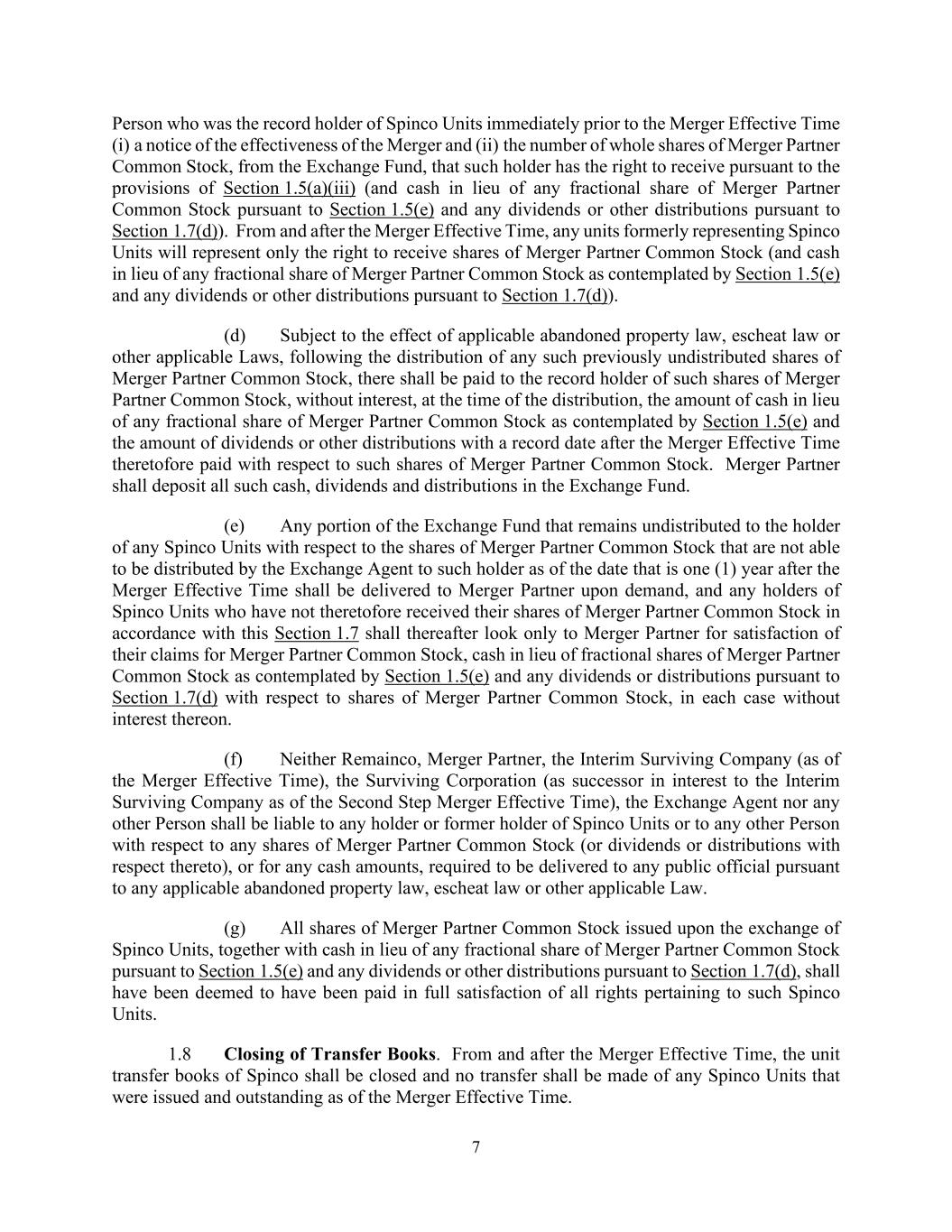 7 Person who was the record holder of Spinco Units immediately prior to the Merger Effective Time (i) a notice of the effectiveness of the Merger and (ii) the number of whole shares of Merger Partner Common Stock, from the Exchange Fund, that such holder has the right to receive pursuant to the provisions of Section 1.5(a)(iii) (and cash in lieu of any fractional share of Merger Partner Common Stock pursuant to Section 1.5(e) and any dividends or other distributions pursuant to Section 1.7(d)). From and after the Merger Effective Time, any units formerly representing Spinco Units will represent only the right to receive shares of Merger Partner Common Stock (and cash in lieu of any fractional share of Merger Partner Common Stock as contemplated by Section 1.5(e) and any dividends or other distributions pursuant to Section 1.7(d)). (d) Subject to the effect of applicable abandoned property law, escheat law or other applicable Laws, following the distribution of any such previously undistributed shares of Merger Partner Common Stock, there shall be paid to the record holder of such shares of Merger Partner Common Stock, without interest, at the time of the distribution, the amount of cash in lieu of any fractional share of Merger Partner Common Stock as contemplated by Section 1.5(e) and the amount of dividends or other distributions with a record date after the Merger Effective Time theretofore paid with respect to such shares of Merger Partner Common Stock. Merger Partner shall deposit all such cash, dividends and distributions in the Exchange Fund. (e) Any portion of the Exchange Fund that remains undistributed to the holder of any Spinco Units with respect to the shares of Merger Partner Common Stock that are not able to be distributed by the Exchange Agent to such holder as of the date that is one (1) year after the Merger Effective Time shall be delivered to Merger Partner upon demand, and any holders of Spinco Units who have not theretofore received their shares of Merger Partner Common Stock in accordance with this Section 1.7 shall thereafter look only to Merger Partner for satisfaction of their claims for Merger Partner Common Stock, cash in lieu of fractional shares of Merger Partner Common Stock as contemplated by Section 1.5(e) and any dividends or distributions pursuant to Section 1.7(d) with respect to shares of Merger Partner Common Stock, in each case without interest thereon. (f) Neither Remainco, Merger Partner, the Interim Surviving Company (as of the Merger Effective Time), the Surviving Corporation (as successor in interest to the Interim Surviving Company as of the Second Step Merger Effective Time), the Exchange Agent nor any other Person shall be liable to any holder or former holder of Spinco Units or to any other Person with respect to any shares of Merger Partner Common Stock (or dividends or distributions with respect thereto), or for any cash amounts, required to be delivered to any public official pursuant to any applicable abandoned property law, escheat law or other applicable Law. (g) All shares of Merger Partner Common Stock issued upon the exchange of Spinco Units, together with cash in lieu of any fractional share of Merger Partner Common Stock pursuant to Section 1.5(e) and any dividends or other distributions pursuant to Section 1.7(d), shall have been deemed to have been paid in full satisfaction of all rights pertaining to such Spinco Units. 1.8 Closing of Transfer Books. From and after the Merger Effective Time, the unit transfer books of Spinco shall be closed and no transfer shall be made of any Spinco Units that were issued and outstanding as of the Merger Effective Time.