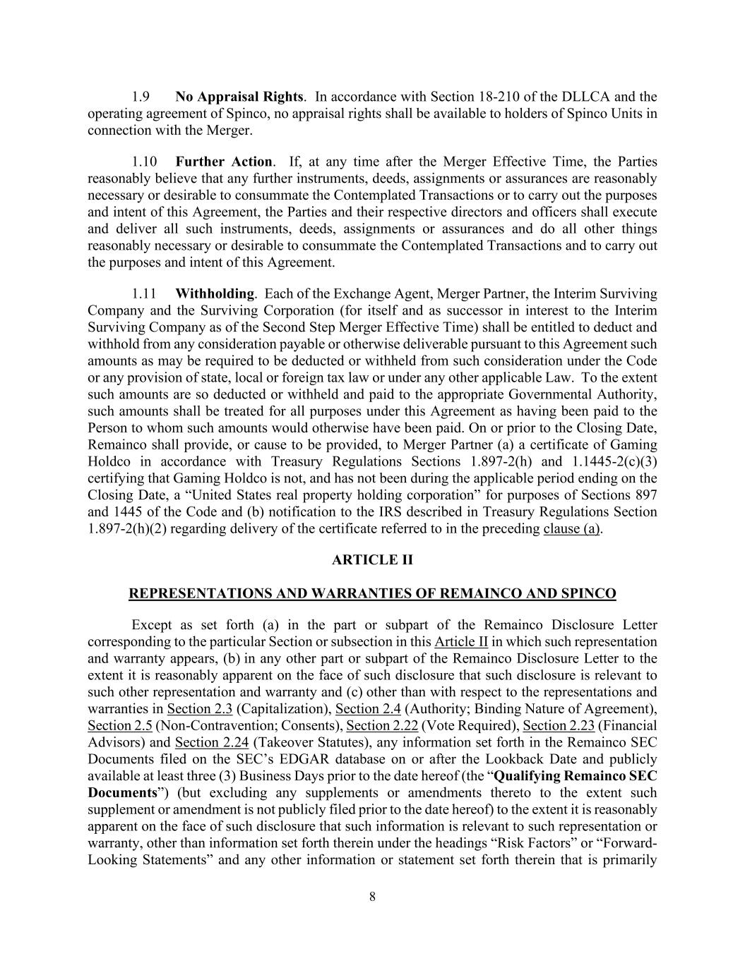 8 1.9 No Appraisal Rights. In accordance with Section 18-210 of the DLLCA and the operating agreement of Spinco, no appraisal rights shall be available to holders of Spinco Units in connection with the Merger. 1.10 Further Action. If, at any time after the Merger Effective Time, the Parties reasonably believe that any further instruments, deeds, assignments or assurances are reasonably necessary or desirable to consummate the Contemplated Transactions or to carry out the purposes and intent of this Agreement, the Parties and their respective directors and officers shall execute and deliver all such instruments, deeds, assignments or assurances and do all other things reasonably necessary or desirable to consummate the Contemplated Transactions and to carry out the purposes and intent of this Agreement. 1.11 Withholding. Each of the Exchange Agent, Merger Partner, the Interim Surviving Company and the Surviving Corporation (for itself and as successor in interest to the Interim Surviving Company as of the Second Step Merger Effective Time) shall be entitled to deduct and withhold from any consideration payable or otherwise deliverable pursuant to this Agreement such amounts as may be required to be deducted or withheld from such consideration under the Code or any provision of state, local or foreign tax law or under any other applicable Law. To the extent such amounts are so deducted or withheld and paid to the appropriate Governmental Authority, such amounts shall be treated for all purposes under this Agreement as having been paid to the Person to whom such amounts would otherwise have been paid. On or prior to the Closing Date, Remainco shall provide, or cause to be provided, to Merger Partner (a) a certificate of Gaming Holdco in accordance with Treasury Regulations Sections 1.897-2(h) and 1.1445-2(c)(3) certifying that Gaming Holdco is not, and has not been during the applicable period ending on the Closing Date, a “United States real property holding corporation” for purposes of Sections 897 and 1445 of the Code and (b) notification to the IRS described in Treasury Regulations Section 1.897-2(h)(2) regarding delivery of the certificate referred to in the preceding clause (a). ARTICLE II REPRESENTATIONS AND WARRANTIES OF REMAINCO AND SPINCO Except as set forth (a) in the part or subpart of the Remainco Disclosure Letter corresponding to the particular Section or subsection in this Article II in which such representation and warranty appears, (b) in any other part or subpart of the Remainco Disclosure Letter to the extent it is reasonably apparent on the face of such disclosure that such disclosure is relevant to such other representation and warranty and (c) other than with respect to the representations and warranties in Section 2.3 (Capitalization), Section 2.4 (Authority; Binding Nature of Agreement), Section 2.5 (Non-Contravention; Consents), Section 2.22 (Vote Required), Section 2.23 (Financial Advisors) and Section 2.24 (Takeover Statutes), any information set forth in the Remainco SEC Documents filed on the SEC’s EDGAR database on or after the Lookback Date and publicly available at least three (3) Business Days prior to the date hereof (the “Qualifying Remainco SEC Documents”) (but excluding any supplements or amendments thereto to the extent such supplement or amendment is not publicly filed prior to the date hereof) to the extent it is reasonably apparent on the face of such disclosure that such information is relevant to such representation or warranty, other than information set forth therein under the headings “Risk Factors” or “Forward- Looking Statements” and any other information or statement set forth therein that is primarily