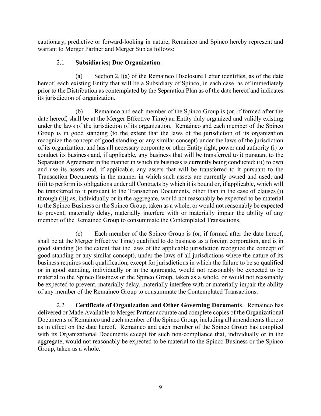 9 cautionary, predictive or forward-looking in nature, Remainco and Spinco hereby represent and warrant to Merger Partner and Merger Sub as follows: 2.1 Subsidiaries; Due Organization. (a) Section 2.1(a) of the Remainco Disclosure Letter identifies, as of the date hereof, each existing Entity that will be a Subsidiary of Spinco, in each case, as of immediately prior to the Distribution as contemplated by the Separation Plan as of the date hereof and indicates its jurisdiction of organization. (b) Remainco and each member of the Spinco Group is (or, if formed after the date hereof, shall be at the Merger Effective Time) an Entity duly organized and validly existing under the laws of the jurisdiction of its organization. Remainco and each member of the Spinco Group is in good standing (to the extent that the laws of the jurisdiction of its organization recognize the concept of good standing or any similar concept) under the laws of the jurisdiction of its organization, and has all necessary corporate or other Entity right, power and authority (i) to conduct its business and, if applicable, any business that will be transferred to it pursuant to the Separation Agreement in the manner in which its business is currently being conducted; (ii) to own and use its assets and, if applicable, any assets that will be transferred to it pursuant to the Transaction Documents in the manner in which such assets are currently owned and used; and (iii) to perform its obligations under all Contracts by which it is bound or, if applicable, which will be transferred to it pursuant to the Transaction Documents, other than in the case of clauses (i) through (iii) as, individually or in the aggregate, would not reasonably be expected to be material to the Spinco Business or the Spinco Group, taken as a whole, or would not reasonably be expected to prevent, materially delay, materially interfere with or materially impair the ability of any member of the Remainco Group to consummate the Contemplated Transactions. (c) Each member of the Spinco Group is (or, if formed after the date hereof, shall be at the Merger Effective Time) qualified to do business as a foreign corporation, and is in good standing (to the extent that the laws of the applicable jurisdiction recognize the concept of good standing or any similar concept), under the laws of all jurisdictions where the nature of its business requires such qualification, except for jurisdictions in which the failure to be so qualified or in good standing, individually or in the aggregate, would not reasonably be expected to be material to the Spinco Business or the Spinco Group, taken as a whole, or would not reasonably be expected to prevent, materially delay, materially interfere with or materially impair the ability of any member of the Remainco Group to consummate the Contemplated Transactions. 2.2 Certificate of Organization and Other Governing Documents. Remainco has delivered or Made Available to Merger Partner accurate and complete copies of the Organizational Documents of Remainco and each member of the Spinco Group, including all amendments thereto as in effect on the date hereof. Remainco and each member of the Spinco Group has complied with its Organizational Documents except for such non-compliance that, individually or in the aggregate, would not reasonably be expected to be material to the Spinco Business or the Spinco Group, taken as a whole.