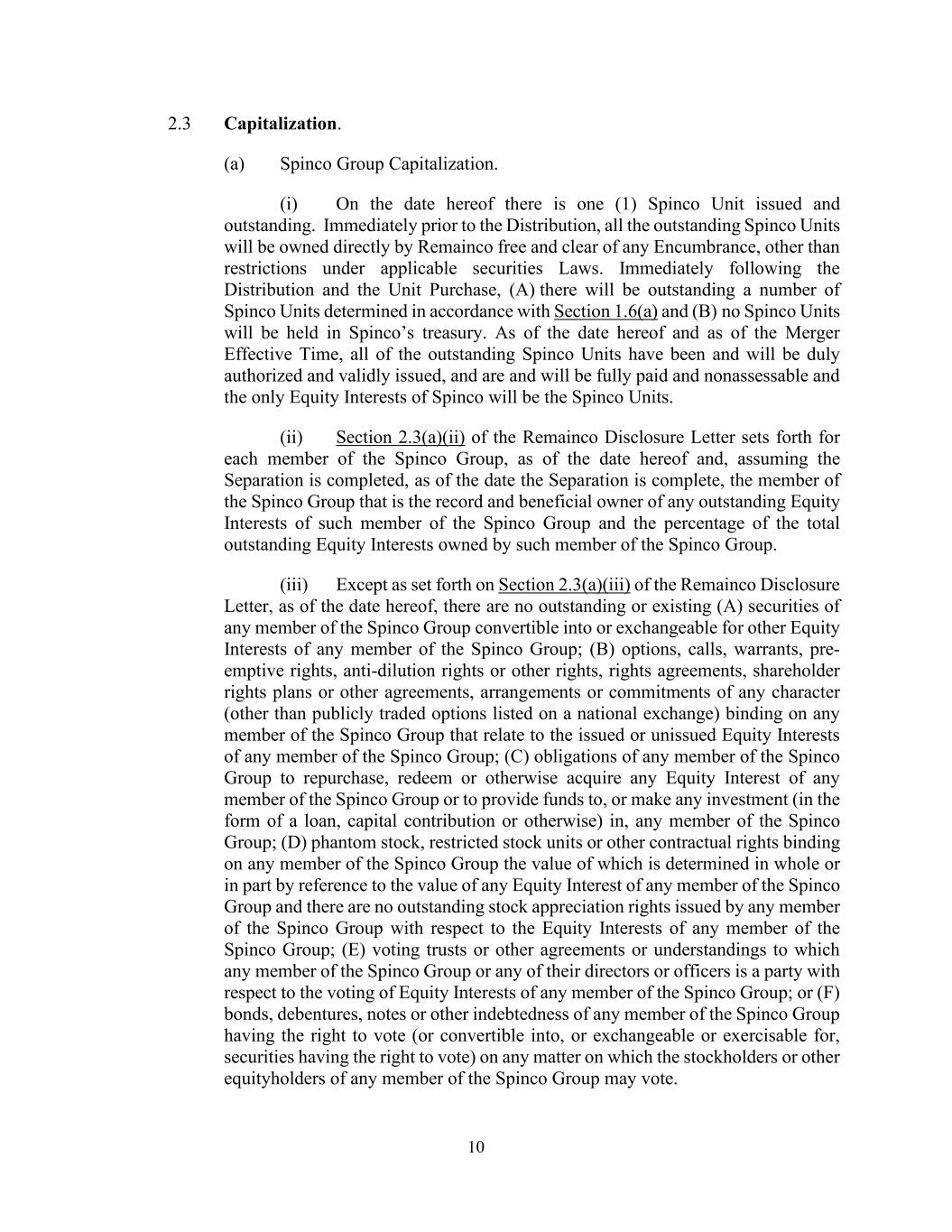 10 2.3 Capitalization. (a) Spinco Group Capitalization. (i) On the date hereof there is one (1) Spinco Unit issued and outstanding. Immediately prior to the Distribution, all the outstanding Spinco Units will be owned directly by Remainco free and clear of any Encumbrance, other than restrictions under applicable securities Laws. Immediately following the Distribution and the Unit Purchase, (A) there will be outstanding a number of Spinco Units determined in accordance with Section 1.6(a) and (B) no Spinco Units will be held in Spinco’s treasury. As of the date hereof and as of the Merger Effective Time, all of the outstanding Spinco Units have been and will be duly authorized and validly issued, and are and will be fully paid and nonassessable and the only Equity Interests of Spinco will be the Spinco Units. (ii) Section 2.3(a)(ii) of the Remainco Disclosure Letter sets forth for each member of the Spinco Group, as of the date hereof and, assuming the Separation is completed, as of the date the Separation is complete, the member of the Spinco Group that is the record and beneficial owner of any outstanding Equity Interests of such member of the Spinco Group and the percentage of the total outstanding Equity Interests owned by such member of the Spinco Group. (iii) Except as set forth on Section 2.3(a)(iii) of the Remainco Disclosure Letter, as of the date hereof, there are no outstanding or existing (A) securities of any member of the Spinco Group convertible into or exchangeable for other Equity Interests of any member of the Spinco Group; (B) options, calls, warrants, pre- emptive rights, anti-dilution rights or other rights, rights agreements, shareholder rights plans or other agreements, arrangements or commitments of any character (other than publicly traded options listed on a national exchange) binding on any member of the Spinco Group that relate to the issued or unissued Equity Interests of any member of the Spinco Group; (C) obligations of any member of the Spinco Group to repurchase, redeem or otherwise acquire any Equity Interest of any member of the Spinco Group or to provide funds to, or make any investment (in the form of a loan, capital contribution or otherwise) in, any member of the Spinco Group; (D) phantom stock, restricted stock units or other contractual rights binding on any member of the Spinco Group the value of which is determined in whole or in part by reference to the value of any Equity Interest of any member of the Spinco Group and there are no outstanding stock appreciation rights issued by any member of the Spinco Group with respect to the Equity Interests of any member of the Spinco Group; (E) voting trusts or other agreements or understandings to which any member of the Spinco Group or any of their directors or officers is a party with respect to the voting of Equity Interests of any member of the Spinco Group; or (F) bonds, debentures, notes or other indebtedness of any member of the Spinco Group having the right to vote (or convertible into, or exchangeable or exercisable for, securities having the right to vote) on any matter on which the stockholders or other equityholders of any member of the Spinco Group may vote.
