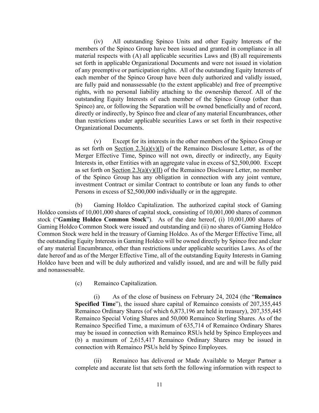 11 (iv) All outstanding Spinco Units and other Equity Interests of the members of the Spinco Group have been issued and granted in compliance in all material respects with (A) all applicable securities Laws and (B) all requirements set forth in applicable Organizational Documents and were not issued in violation of any preemptive or participation rights. All of the outstanding Equity Interests of each member of the Spinco Group have been duly authorized and validly issued, are fully paid and nonassessable (to the extent applicable) and free of preemptive rights, with no personal liability attaching to the ownership thereof. All of the outstanding Equity Interests of each member of the Spinco Group (other than Spinco) are, or following the Separation will be owned beneficially and of record, directly or indirectly, by Spinco free and clear of any material Encumbrances, other than restrictions under applicable securities Laws or set forth in their respective Organizational Documents. (v) Except for its interests in the other members of the Spinco Group or as set forth on Section 2.3(a)(v)(I) of the Remainco Disclosure Letter, as of the Merger Effective Time, Spinco will not own, directly or indirectly, any Equity Interests in, other Entities with an aggregate value in excess of $2,500,000. Except as set forth on Section 2.3(a)(v)(II) of the Remainco Disclosure Letter, no member of the Spinco Group has any obligation in connection with any joint venture, investment Contract or similar Contract to contribute or loan any funds to other Persons in excess of $2,500,000 individually or in the aggregate. (b) Gaming Holdco Capitalization. The authorized capital stock of Gaming Holdco consists of 10,001,000 shares of capital stock, consisting of 10,001,000 shares of common stock (“Gaming Holdco Common Stock”). As of the date hereof, (i) 10,001,000 shares of Gaming Holdco Common Stock were issued and outstanding and (ii) no shares of Gaming Holdco Common Stock were held in the treasury of Gaming Holdco. As of the Merger Effective Time, all the outstanding Equity Interests in Gaming Holdco will be owned directly by Spinco free and clear of any material Encumbrance, other than restrictions under applicable securities Laws. As of the date hereof and as of the Merger Effective Time, all of the outstanding Equity Interests in Gaming Holdco have been and will be duly authorized and validly issued, and are and will be fully paid and nonassessable. (c) Remainco Capitalization. (i) As of the close of business on February 24, 2024 (the “Remainco Specified Time”), the issued share capital of Remainco consists of 207,355,445 Remainco Ordinary Shares (of which 6,873,196 are held in treasury), 207,355,445 Remainco Special Voting Shares and 50,000 Remainco Sterling Shares. As of the Remainco Specified Time, a maximum of 635,714 of Remainco Ordinary Shares may be issued in connection with Remainco RSUs held by Spinco Employees and (b) a maximum of 2,615,417 Remainco Ordinary Shares may be issued in connection with Remainco PSUs held by Spinco Employees. (ii) Remainco has delivered or Made Available to Merger Partner a complete and accurate list that sets forth the following information with respect to