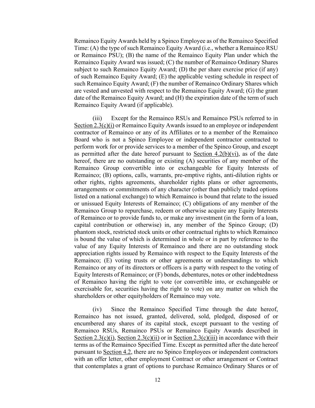 12 Remainco Equity Awards held by a Spinco Employee as of the Remainco Specified Time: (A) the type of such Remainco Equity Award (i.e., whether a Remainco RSU or Remainco PSU); (B) the name of the Remainco Equity Plan under which the Remainco Equity Award was issued; (C) the number of Remainco Ordinary Shares subject to such Remainco Equity Award; (D) the per share exercise price (if any) of such Remainco Equity Award; (E) the applicable vesting schedule in respect of such Remainco Equity Award; (F) the number of Remainco Ordinary Shares which are vested and unvested with respect to the Remainco Equity Award; (G) the grant date of the Remainco Equity Award; and (H) the expiration date of the term of such Remainco Equity Award (if applicable). (iii) Except for the Remainco RSUs and Remainco PSUs referred to in Section 2.3(c)(i) or Remainco Equity Awards issued to an employee or independent contractor of Remainco or any of its Affiliates or to a member of the Remainco Board who is not a Spinco Employee or independent contractor contracted to perform work for or provide services to a member of the Spinco Group, and except as permitted after the date hereof pursuant to Section 4.2(b)(vi), as of the date hereof, there are no outstanding or existing (A) securities of any member of the Remainco Group convertible into or exchangeable for Equity Interests of Remainco; (B) options, calls, warrants, pre-emptive rights, anti-dilution rights or other rights, rights agreements, shareholder rights plans or other agreements, arrangements or commitments of any character (other than publicly traded options listed on a national exchange) to which Remainco is bound that relate to the issued or unissued Equity Interests of Remainco; (C) obligations of any member of the Remainco Group to repurchase, redeem or otherwise acquire any Equity Interests of Remainco or to provide funds to, or make any investment (in the form of a loan, capital contribution or otherwise) in, any member of the Spinco Group; (D) phantom stock, restricted stock units or other contractual rights to which Remainco is bound the value of which is determined in whole or in part by reference to the value of any Equity Interests of Remainco and there are no outstanding stock appreciation rights issued by Remainco with respect to the Equity Interests of the Remainco; (E) voting trusts or other agreements or understandings to which Remainco or any of its directors or officers is a party with respect to the voting of Equity Interests of Remainco; or (F) bonds, debentures, notes or other indebtedness of Remainco having the right to vote (or convertible into, or exchangeable or exercisable for, securities having the right to vote) on any matter on which the shareholders or other equityholders of Remainco may vote. (iv) Since the Remainco Specified Time through the date hereof, Remainco has not issued, granted, delivered, sold, pledged, disposed of or encumbered any shares of its capital stock, except pursuant to the vesting of Remainco RSUs, Remainco PSUs or Remainco Equity Awards described in Section 2.3(c)(i), Section 2.3(c)(ii) or in Section 2.3(c)(iii) in accordance with their terms as of the Remainco Specified Time. Except as permitted after the date hereof pursuant to Section 4.2, there are no Spinco Employees or independent contractors with an offer letter, other employment Contract or other arrangement or Contract that contemplates a grant of options to purchase Remainco Ordinary Shares or of