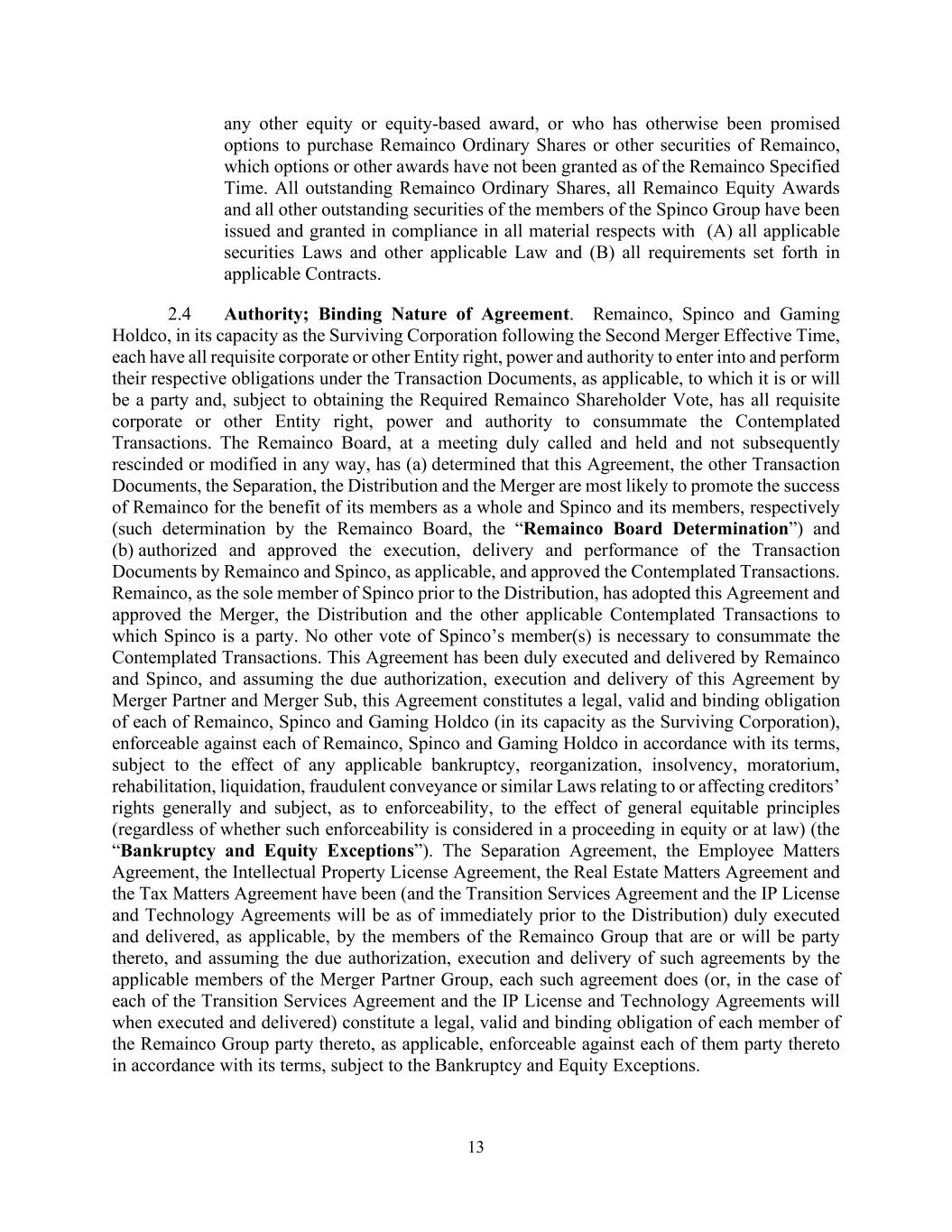 13 any other equity or equity-based award, or who has otherwise been promised options to purchase Remainco Ordinary Shares or other securities of Remainco, which options or other awards have not been granted as of the Remainco Specified Time. All outstanding Remainco Ordinary Shares, all Remainco Equity Awards and all other outstanding securities of the members of the Spinco Group have been issued and granted in compliance in all material respects with (A) all applicable securities Laws and other applicable Law and (B) all requirements set forth in applicable Contracts. 2.4 Authority; Binding Nature of Agreement. Remainco, Spinco and Gaming Holdco, in its capacity as the Surviving Corporation following the Second Merger Effective Time, each have all requisite corporate or other Entity right, power and authority to enter into and perform their respective obligations under the Transaction Documents, as applicable, to which it is or will be a party and, subject to obtaining the Required Remainco Shareholder Vote, has all requisite corporate or other Entity right, power and authority to consummate the Contemplated Transactions. The Remainco Board, at a meeting duly called and held and not subsequently rescinded or modified in any way, has (a) determined that this Agreement, the other Transaction Documents, the Separation, the Distribution and the Merger are most likely to promote the success of Remainco for the benefit of its members as a whole and Spinco and its members, respectively (such determination by the Remainco Board, the “Remainco Board Determination”) and (b) authorized and approved the execution, delivery and performance of the Transaction Documents by Remainco and Spinco, as applicable, and approved the Contemplated Transactions. Remainco, as the sole member of Spinco prior to the Distribution, has adopted this Agreement and approved the Merger, the Distribution and the other applicable Contemplated Transactions to which Spinco is a party. No other vote of Spinco’s member(s) is necessary to consummate the Contemplated Transactions. This Agreement has been duly executed and delivered by Remainco and Spinco, and assuming the due authorization, execution and delivery of this Agreement by Merger Partner and Merger Sub, this Agreement constitutes a legal, valid and binding obligation of each of Remainco, Spinco and Gaming Holdco (in its capacity as the Surviving Corporation), enforceable against each of Remainco, Spinco and Gaming Holdco in accordance with its terms, subject to the effect of any applicable bankruptcy, reorganization, insolvency, moratorium, rehabilitation, liquidation, fraudulent conveyance or similar Laws relating to or affecting creditors’ rights generally and subject, as to enforceability, to the effect of general equitable principles (regardless of whether such enforceability is considered in a proceeding in equity or at law) (the “Bankruptcy and Equity Exceptions”). The Separation Agreement, the Employee Matters Agreement, the Intellectual Property License Agreement, the Real Estate Matters Agreement and the Tax Matters Agreement have been (and the Transition Services Agreement and the IP License and Technology Agreements will be as of immediately prior to the Distribution) duly executed and delivered, as applicable, by the members of the Remainco Group that are or will be party thereto, and assuming the due authorization, execution and delivery of such agreements by the applicable members of the Merger Partner Group, each such agreement does (or, in the case of each of the Transition Services Agreement and the IP License and Technology Agreements will when executed and delivered) constitute a legal, valid and binding obligation of each member of the Remainco Group party thereto, as applicable, enforceable against each of them party thereto in accordance with its terms, subject to the Bankruptcy and Equity Exceptions.