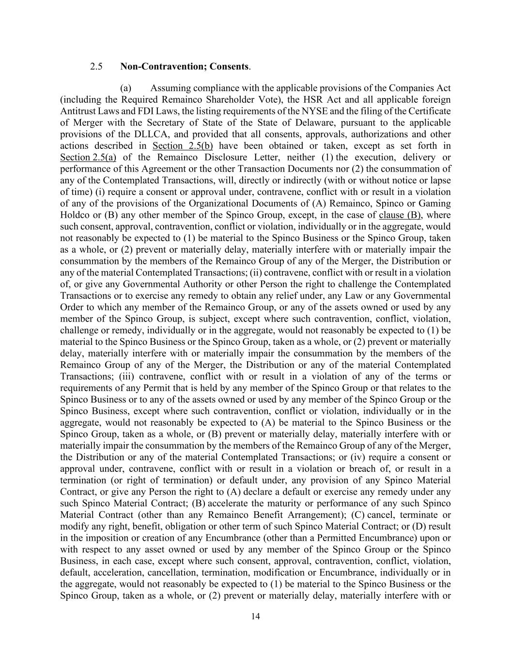 14 2.5 Non-Contravention; Consents. (a) Assuming compliance with the applicable provisions of the Companies Act (including the Required Remainco Shareholder Vote), the HSR Act and all applicable foreign Antitrust Laws and FDI Laws, the listing requirements of the NYSE and the filing of the Certificate of Merger with the Secretary of State of the State of Delaware, pursuant to the applicable provisions of the DLLCA, and provided that all consents, approvals, authorizations and other actions described in Section 2.5(b) have been obtained or taken, except as set forth in Section 2.5(a) of the Remainco Disclosure Letter, neither (1) the execution, delivery or performance of this Agreement or the other Transaction Documents nor (2) the consummation of any of the Contemplated Transactions, will, directly or indirectly (with or without notice or lapse of time) (i) require a consent or approval under, contravene, conflict with or result in a violation of any of the provisions of the Organizational Documents of (A) Remainco, Spinco or Gaming Holdco or (B) any other member of the Spinco Group, except, in the case of clause (B), where such consent, approval, contravention, conflict or violation, individually or in the aggregate, would not reasonably be expected to (1) be material to the Spinco Business or the Spinco Group, taken as a whole, or (2) prevent or materially delay, materially interfere with or materially impair the consummation by the members of the Remainco Group of any of the Merger, the Distribution or any of the material Contemplated Transactions; (ii) contravene, conflict with or result in a violation of, or give any Governmental Authority or other Person the right to challenge the Contemplated Transactions or to exercise any remedy to obtain any relief under, any Law or any Governmental Order to which any member of the Remainco Group, or any of the assets owned or used by any member of the Spinco Group, is subject, except where such contravention, conflict, violation, challenge or remedy, individually or in the aggregate, would not reasonably be expected to (1) be material to the Spinco Business or the Spinco Group, taken as a whole, or (2) prevent or materially delay, materially interfere with or materially impair the consummation by the members of the Remainco Group of any of the Merger, the Distribution or any of the material Contemplated Transactions; (iii) contravene, conflict with or result in a violation of any of the terms or requirements of any Permit that is held by any member of the Spinco Group or that relates to the Spinco Business or to any of the assets owned or used by any member of the Spinco Group or the Spinco Business, except where such contravention, conflict or violation, individually or in the aggregate, would not reasonably be expected to (A) be material to the Spinco Business or the Spinco Group, taken as a whole, or (B) prevent or materially delay, materially interfere with or materially impair the consummation by the members of the Remainco Group of any of the Merger, the Distribution or any of the material Contemplated Transactions; or (iv) require a consent or approval under, contravene, conflict with or result in a violation or breach of, or result in a termination (or right of termination) or default under, any provision of any Spinco Material Contract, or give any Person the right to (A) declare a default or exercise any remedy under any such Spinco Material Contract; (B) accelerate the maturity or performance of any such Spinco Material Contract (other than any Remainco Benefit Arrangement); (C) cancel, terminate or modify any right, benefit, obligation or other term of such Spinco Material Contract; or (D) result in the imposition or creation of any Encumbrance (other than a Permitted Encumbrance) upon or with respect to any asset owned or used by any member of the Spinco Group or the Spinco Business, in each case, except where such consent, approval, contravention, conflict, violation, default, acceleration, cancellation, termination, modification or Encumbrance, individually or in the aggregate, would not reasonably be expected to (1) be material to the Spinco Business or the Spinco Group, taken as a whole, or (2) prevent or materially delay, materially interfere with or