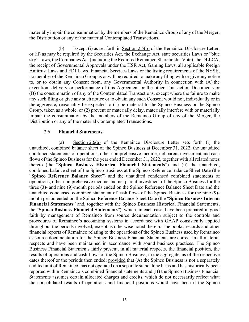 15 materially impair the consummation by the members of the Remainco Group of any of the Merger, the Distribution or any of the material Contemplated Transactions. (b) Except (i) as set forth in Section 2.5(b) of the Remainco Disclosure Letter, or (ii) as may be required by the Securities Act, the Exchange Act, state securities Laws or “blue sky” Laws, the Companies Act (including the Required Remainco Shareholder Vote), the DLLCA, the receipt of Governmental Approvals under the HSR Act, Gaming Laws, all applicable foreign Antitrust Laws and FDI Laws, Financial Services Laws or the listing requirements of the NYSE, no member of the Remainco Group is or will be required to make any filing with or give any notice to, or to obtain any Consent from, any Governmental Authority in connection with (A) the execution, delivery or performance of this Agreement or the other Transaction Documents or (B) the consummation of any of the Contemplated Transactions, except where the failure to make any such filing or give any such notice or to obtain any such Consent would not, individually or in the aggregate, reasonably be expected to (1) be material to the Spinco Business or the Spinco Group, taken as a whole, or (2) prevent or materially delay, materially interfere with or materially impair the consummation by the members of the Remainco Group of any of the Merger, the Distribution or any of the material Contemplated Transactions. 2.6 Financial Statements. (a) Section 2.6(a) of the Remainco Disclosure Letter sets forth (i) the unaudited, combined balance sheet of the Spinco Business at December 31, 2022, the unaudited combined statements of operations, other comprehensive income, net parent investment and cash flows of the Spinco Business for the year ended December 31, 2022, together with all related notes thereto (the “Spinco Business Historical Financial Statements”) and (ii) the unaudited, combined balance sheet of the Spinco Business at the Spinco Reference Balance Sheet Date (the “Spinco Reference Balance Sheet”) and the unaudited condensed combined statements of operations, other comprehensive income and net parent investment of the Spinco Business for the three (3)- and nine (9)-month periods ended on the Spinco Reference Balance Sheet Date and the unaudited condensed combined statement of cash flows of the Spinco Business for the nine (9)- month period ended on the Spinco Reference Balance Sheet Date (the “Spinco Business Interim Financial Statements” and, together with the Spinco Business Historical Financial Statements, the “Spinco Business Financial Statements”), which, in each case, have been prepared in good faith by management of Remainco from source documentation subject to the controls and procedures of Remainco’s accounting systems in accordance with GAAP consistently applied throughout the periods involved, except as otherwise noted therein. The books, records and other financial reports of Remainco relating to the operations of the Spinco Business used by Remainco as source documentation for the Spinco Business Financial Statements are correct in all material respects and have been maintained in accordance with sound business practices. The Spinco Business Financial Statements fairly present, in all material respects, the financial position, the results of operations and cash flows of the Spinco Business, in the aggregate, as of the respective dates thereof or the periods then ended; provided that (A) the Spinco Business is not a separately audited unit of Remainco, has not operated on a separate standalone basis and has historically been reported within Remainco’s combined financial statements and (B) the Spinco Business Financial Statements assumes certain allocated charges and credits, which do not necessarily reflect what the consolidated results of operations and financial positions would have been if the Spinco